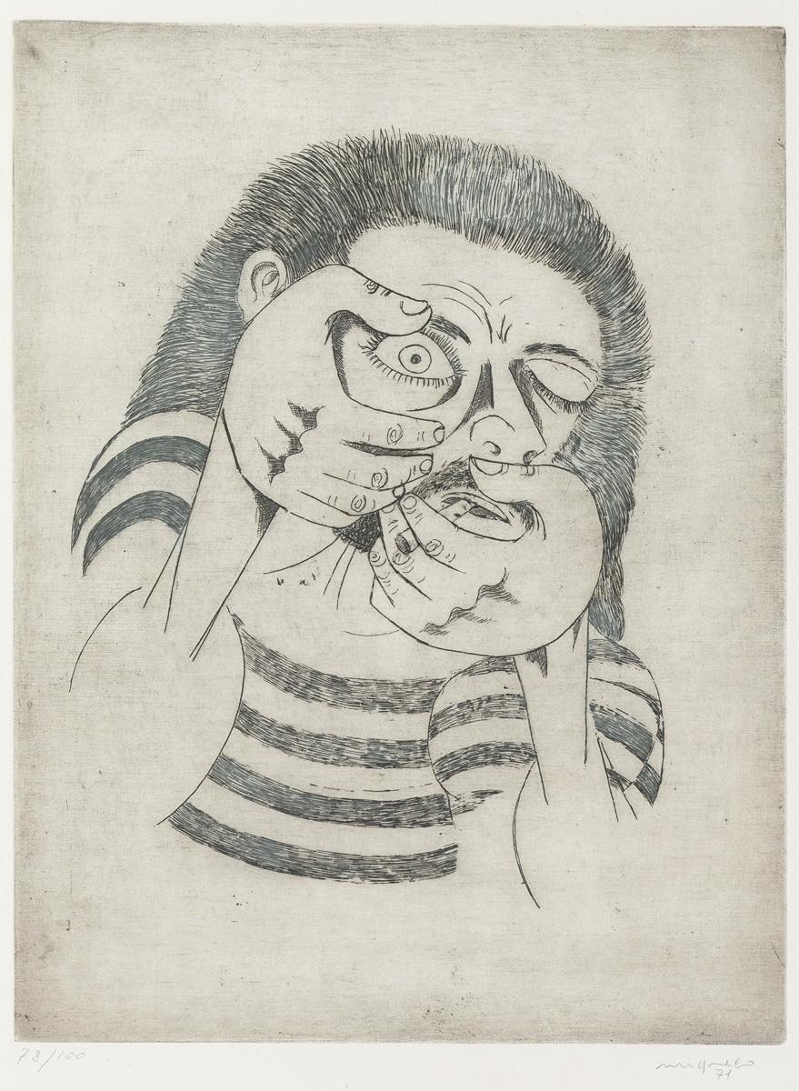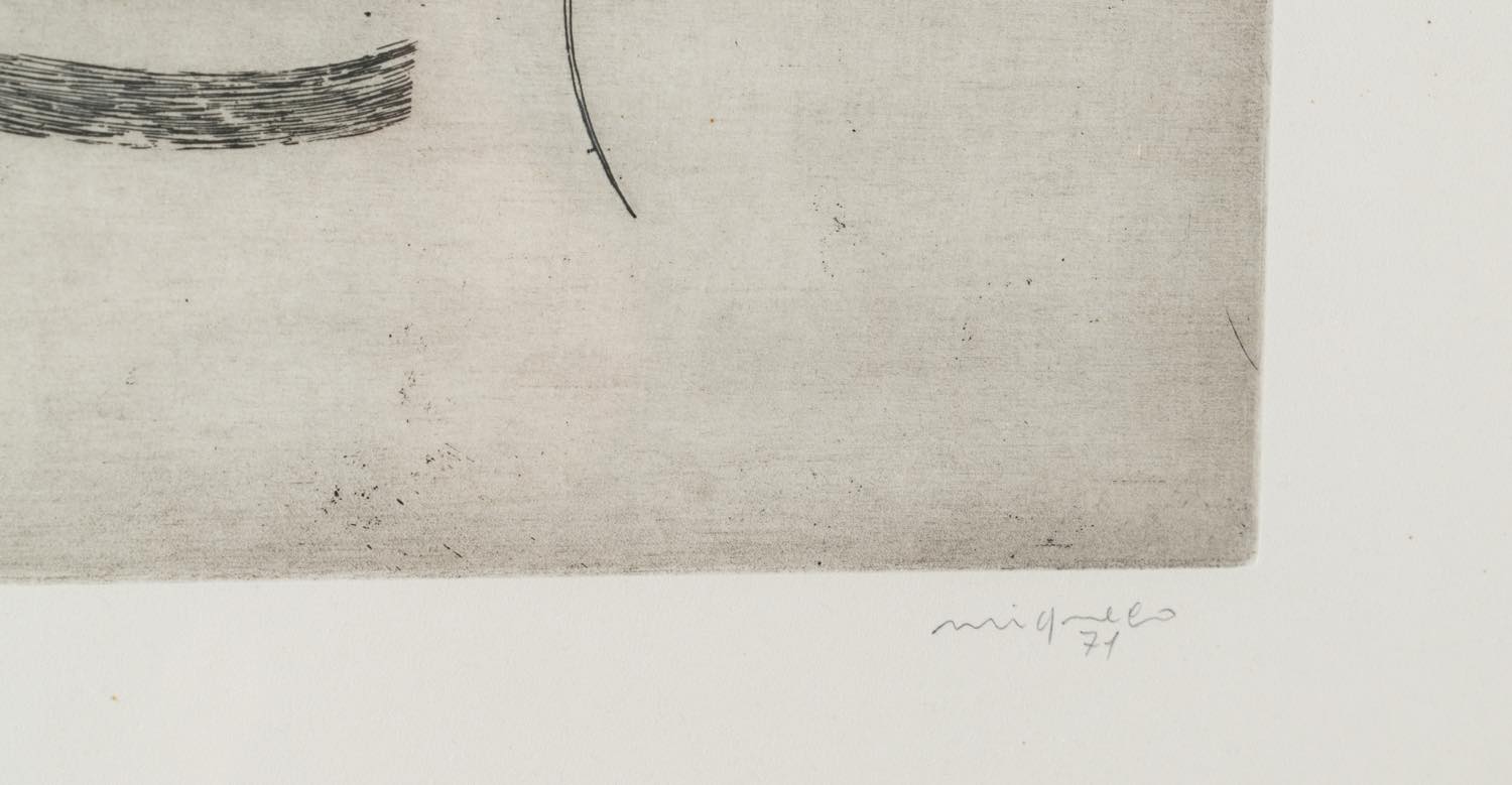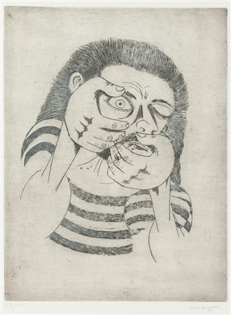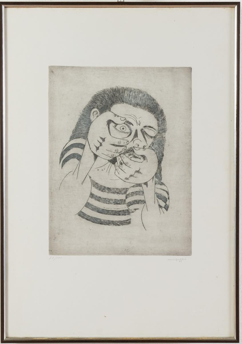 Giuseppe Migneco (Messina 1903 - Milano 1997), “Uomo che fuma”, 1971. Acquaforte su carta, firmata e datata in basso a destra, numero di tiratura in basso a sinistra 78/100, raca timbro a secco in basso a destra “50° PCI Torino 1971”, Lastra H cm 39x29