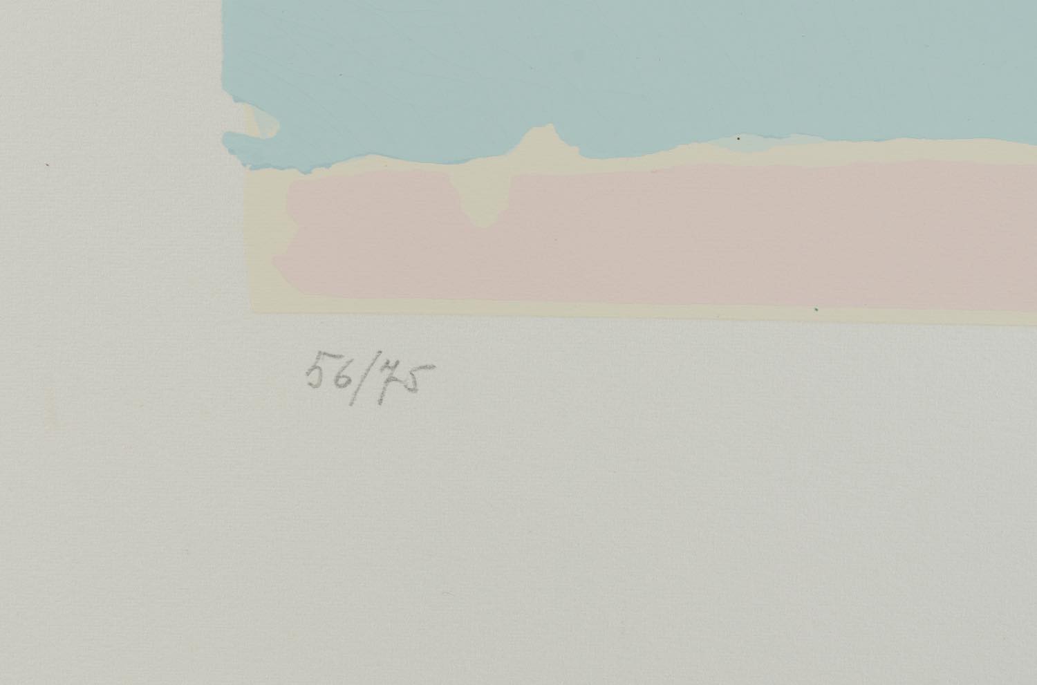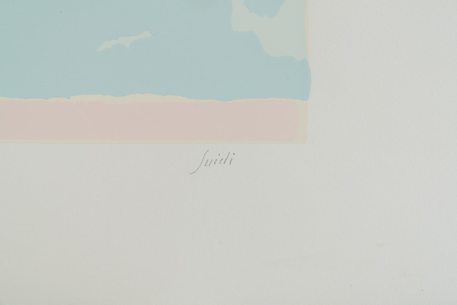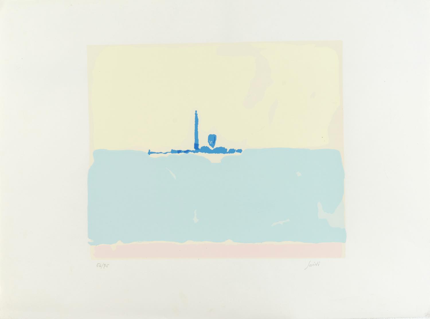 Virgilio Guidi (Roma 1891 - Venezia 1984), “Isola di San Giorgio”. Litografia a colori dipinta a mano su carta, firmata in basso a destra, numero di tiratura in basso a sinistra 56/75, H cm 52.5x70