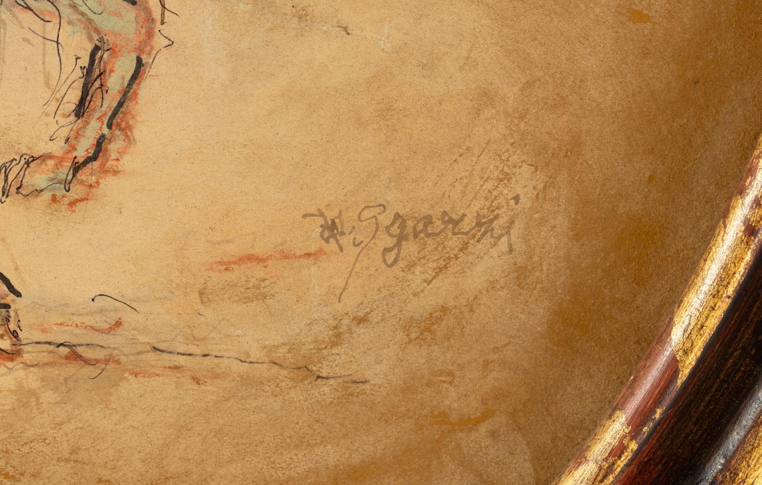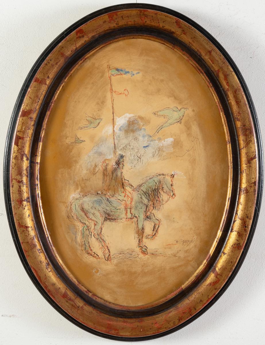 Umberto Sgarzi (Bologna 1921 – 2017), “Cavaliere”, 2015. Tecnica mista e acquerello su cartone, firmato in basso a destra, reca al retro firma e data e timbro dell’artista, H cm 70x50