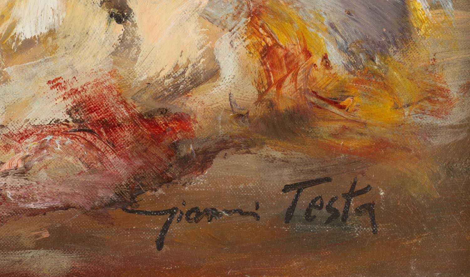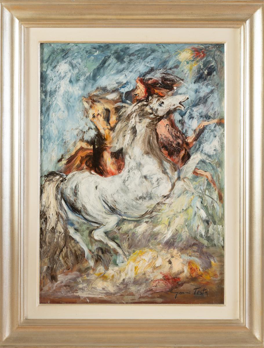 Giovanni Testa (Roma 1936), “Cavalli bradi”. Olio su tela, firmato in basso a destra, H cm 68x48