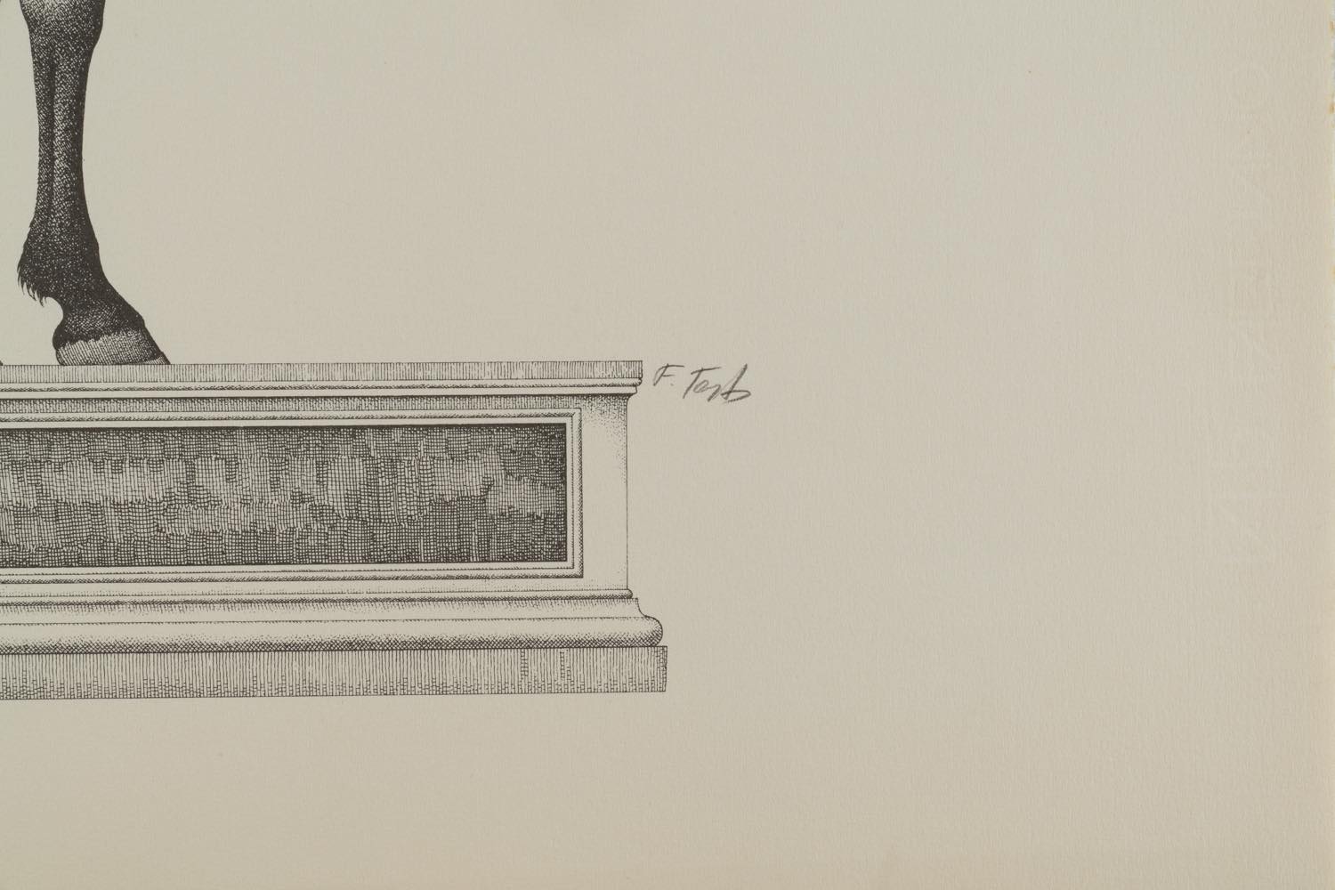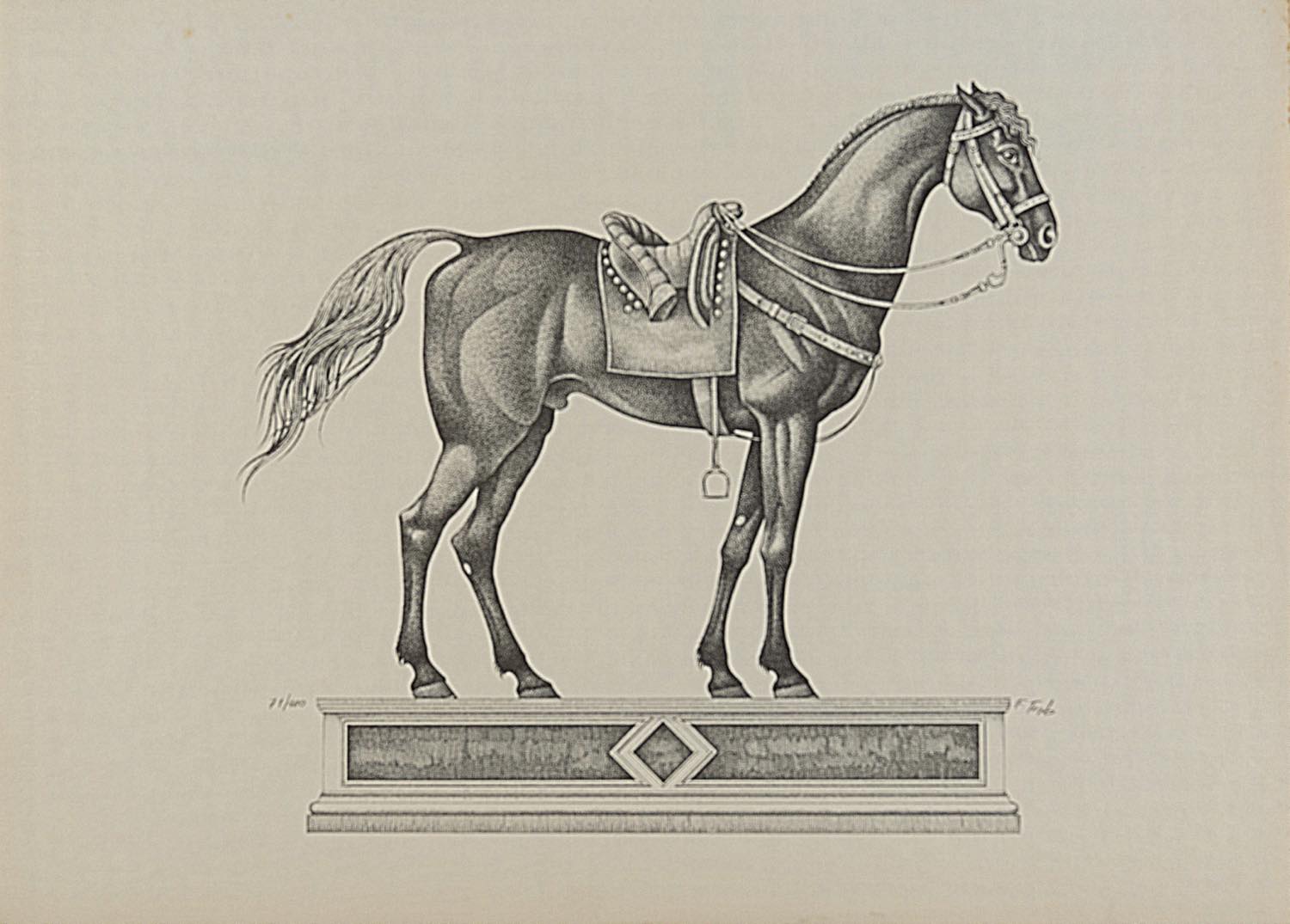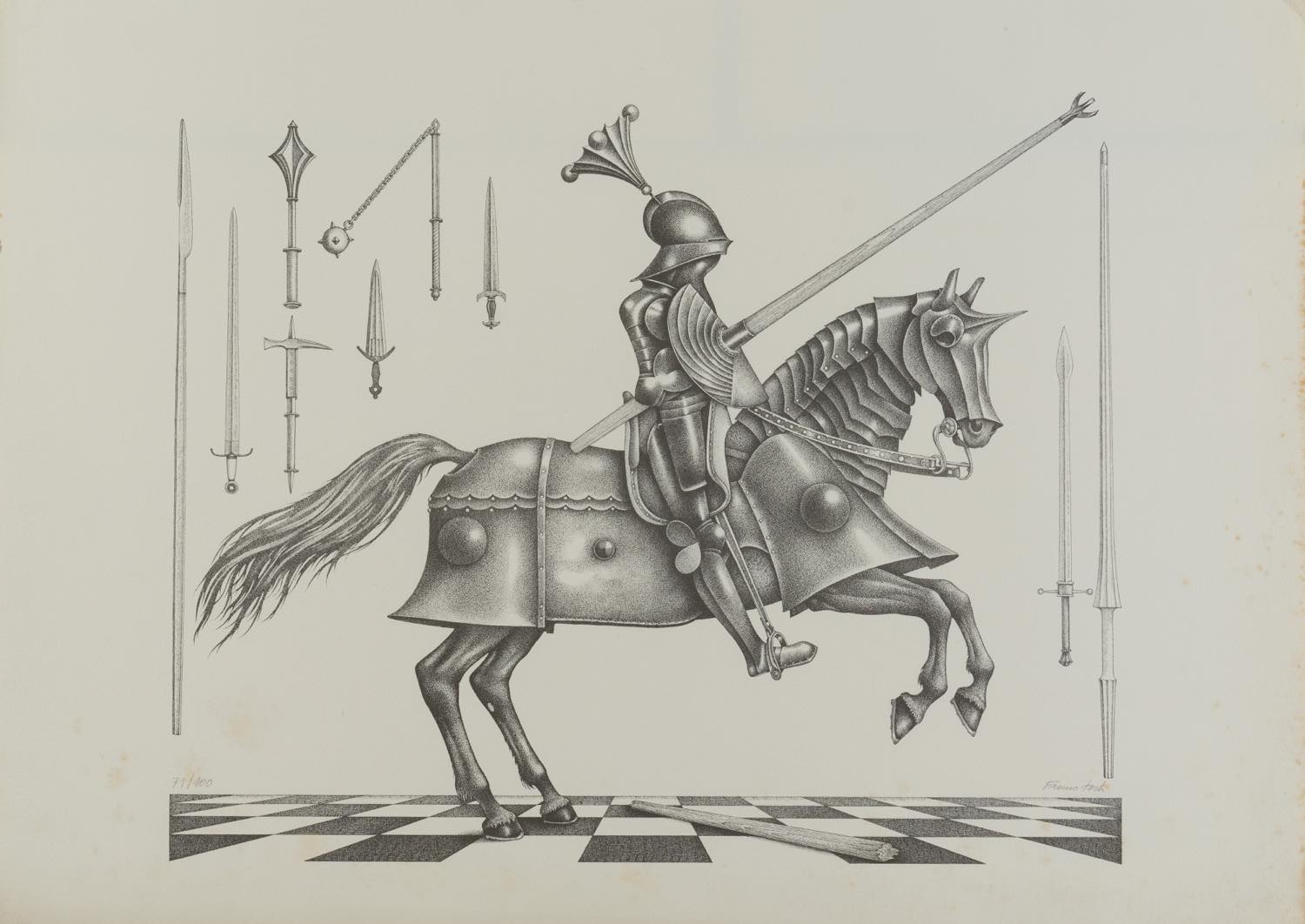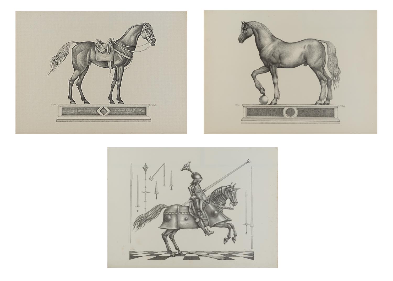 Franco Testa (XX-XIX secolo), “Cavalli e Cavaliere”. Tre litografie su carta firmate in basso a destra Franco/F. Testa, recano numero di tiratura in basso a sinistra 71/100, H cm 50x70 (lievi difetti)
