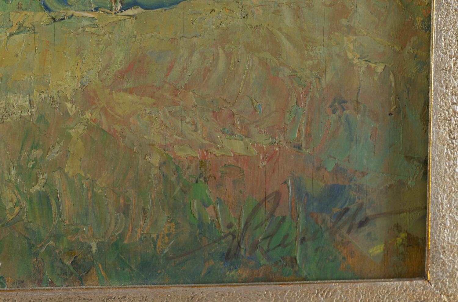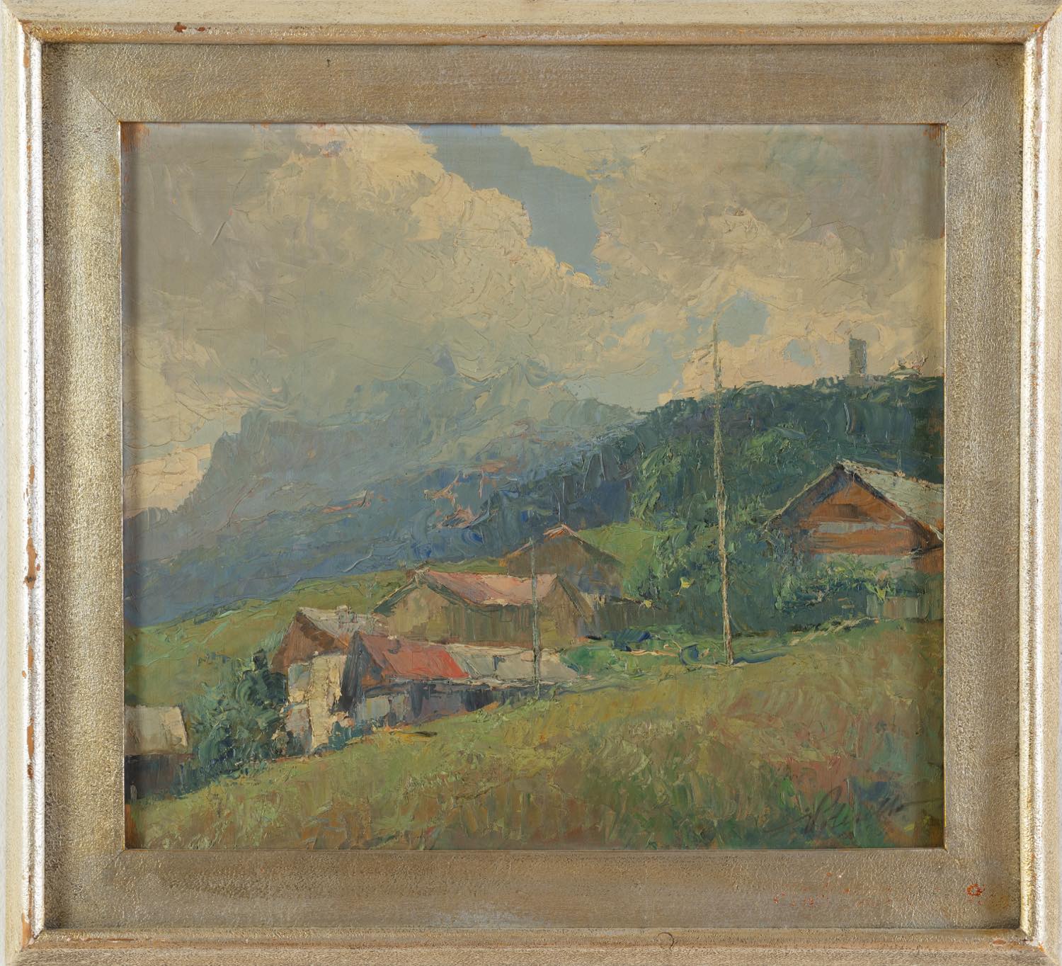 Eugenio Polesello (Pordenone 1895 - Torino 1983 ), “Nubi sulla Croda da Lago”. Olio su tavola, firmato in basso a destra, reca al retro titolo, firma e timbro dell’artista, H cm 37x41.5