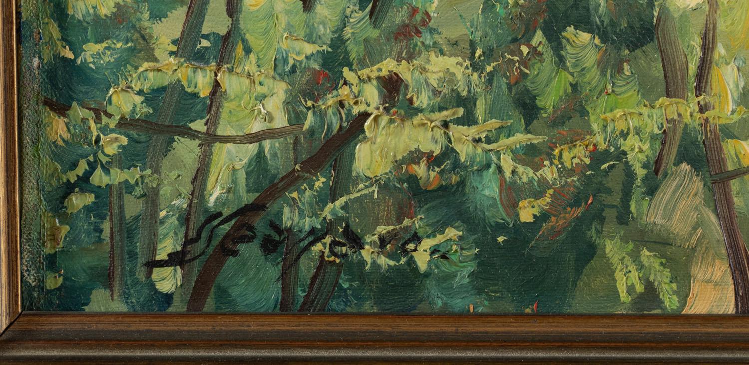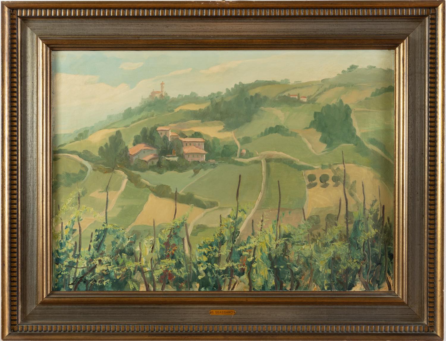 Saverio Seassaro (Genova 1917 – 2016), “Paesaggio con case”. Olio su tela, firmato in basso a sinistra, reca al retro firma e iscrizione, H cm 49x70