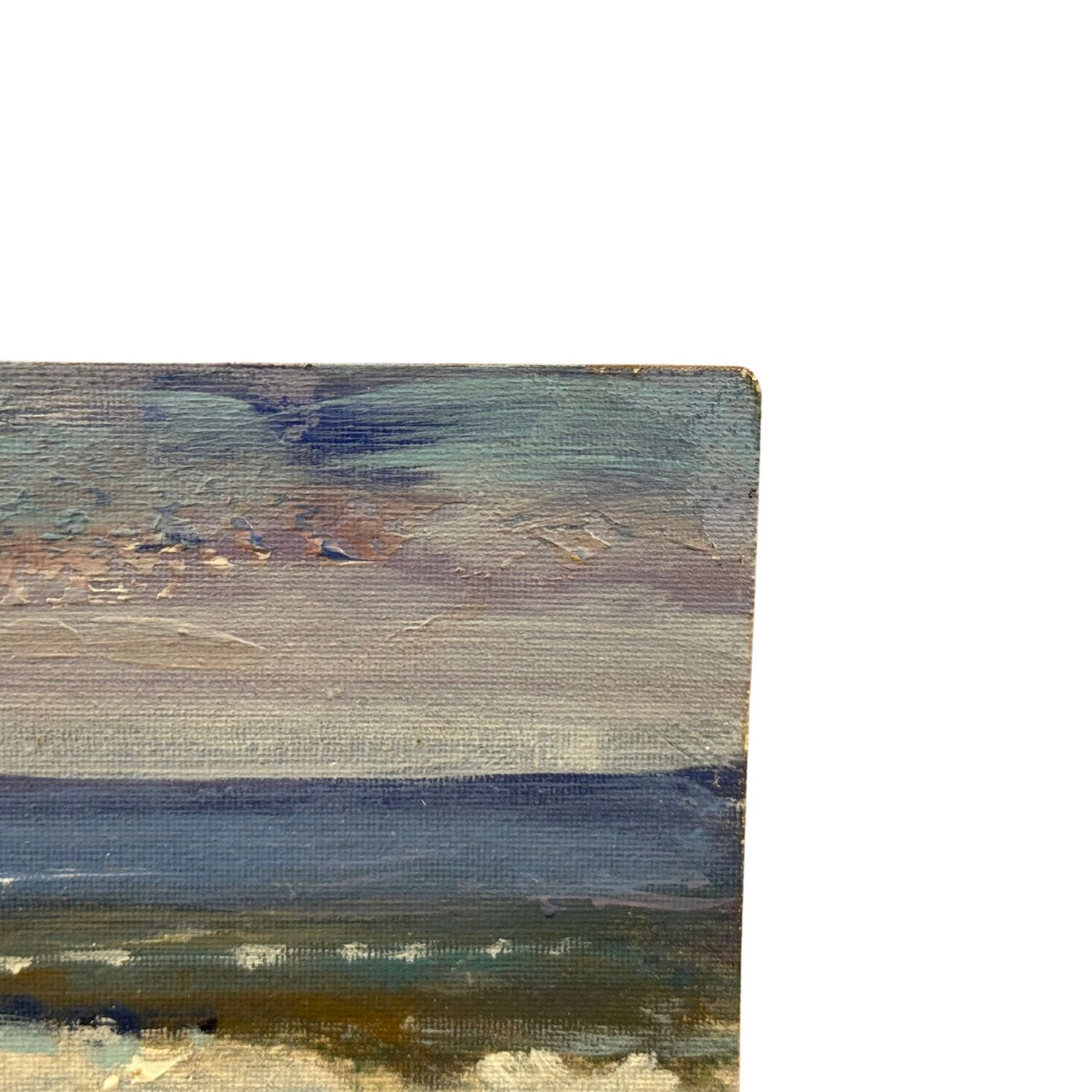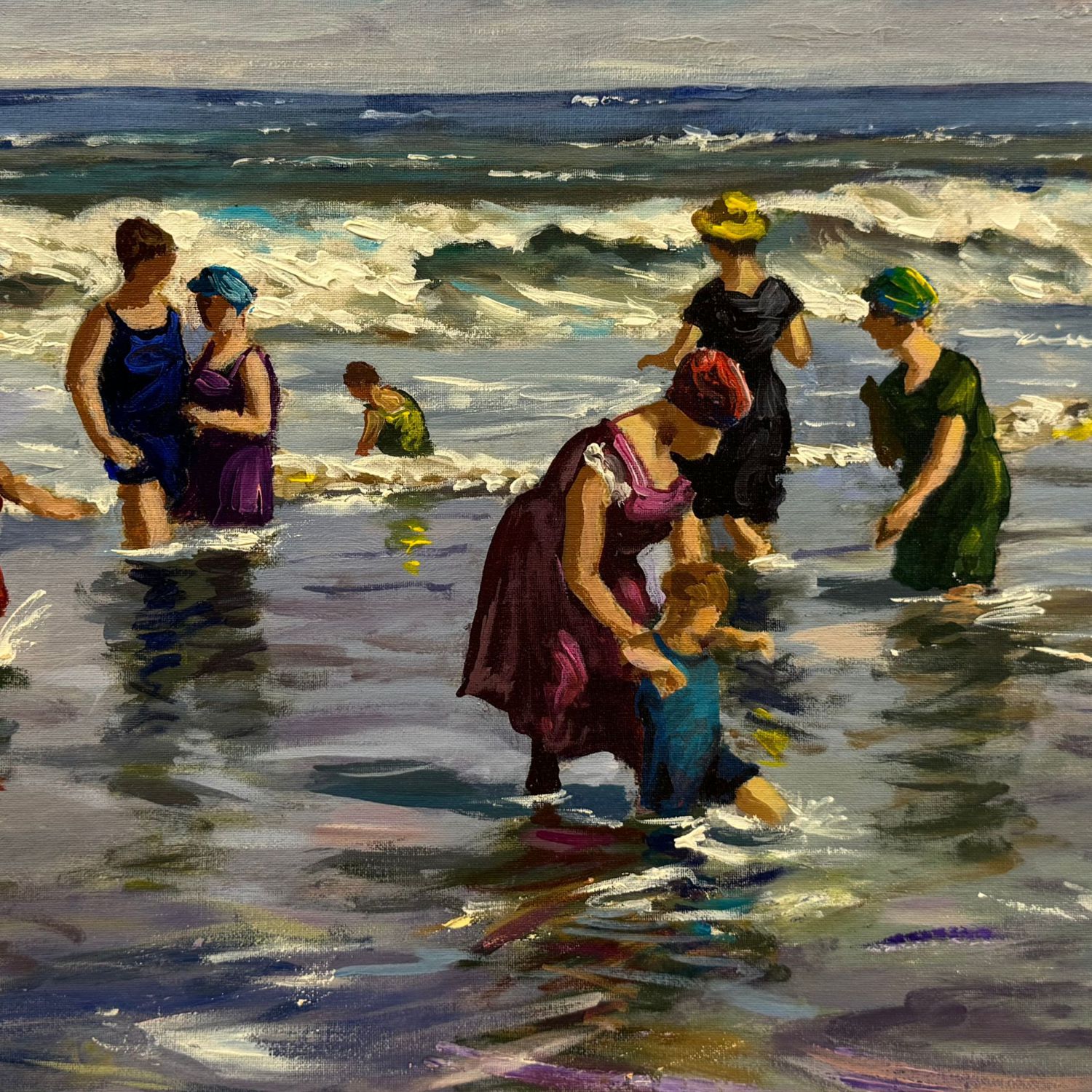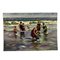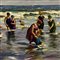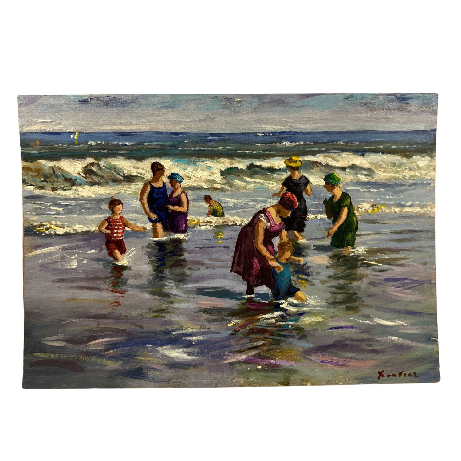 Dipinto olio su pannello, periodo XX secolo scuola Continentale, raffigurante Personaggi al mare.