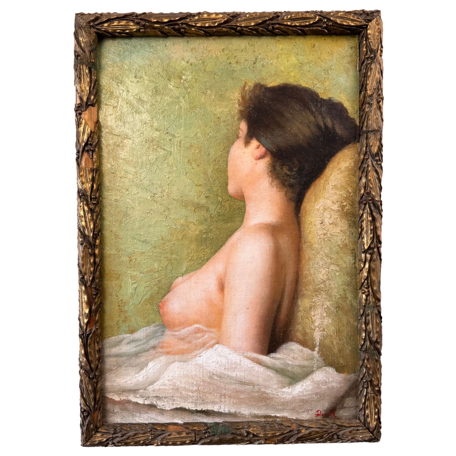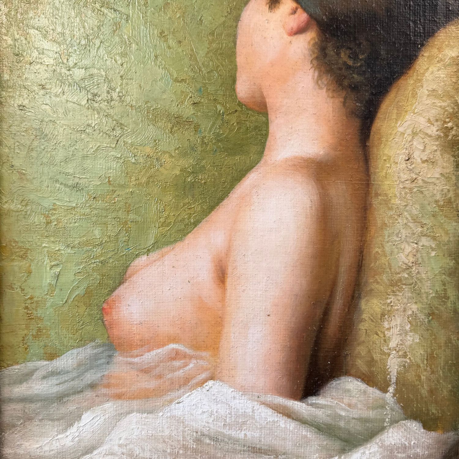 Dipinto olio su tela applicata su cartoncino, periodo XX secolo scuola Italiana raffigurante Profilo di donna con seno in vista