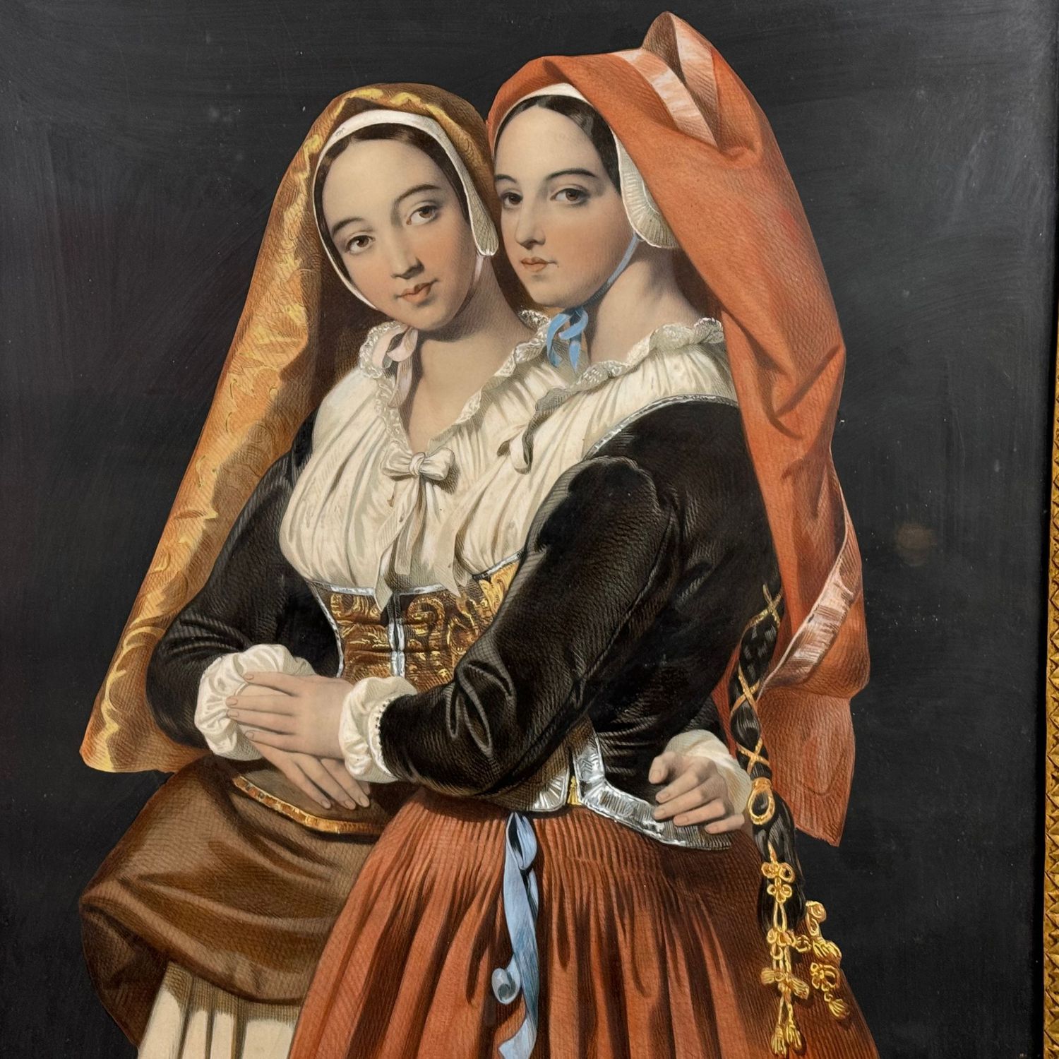 Antica stampa acquerellata in cornice di periodo Impero Italia XIX secolo, raffigurante Due dame.