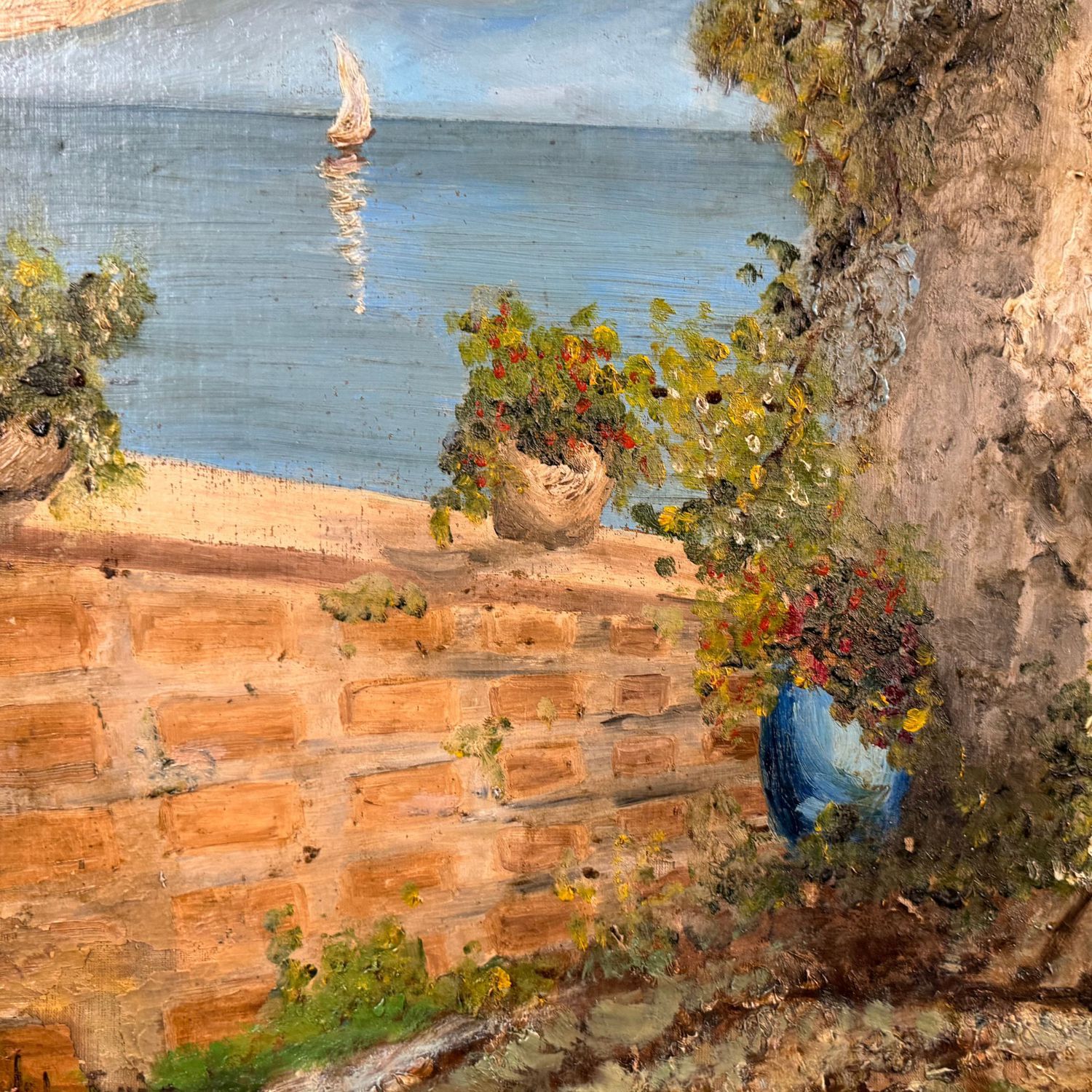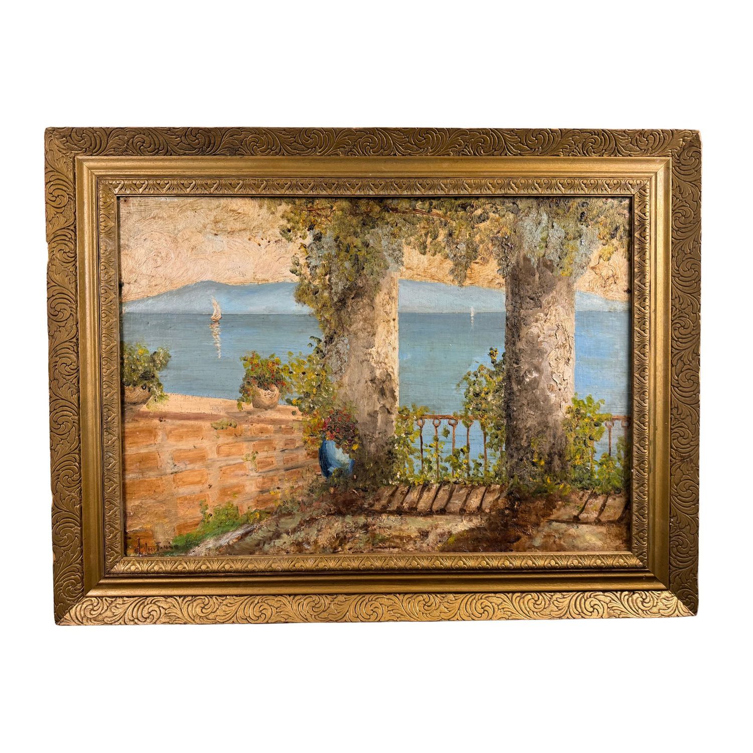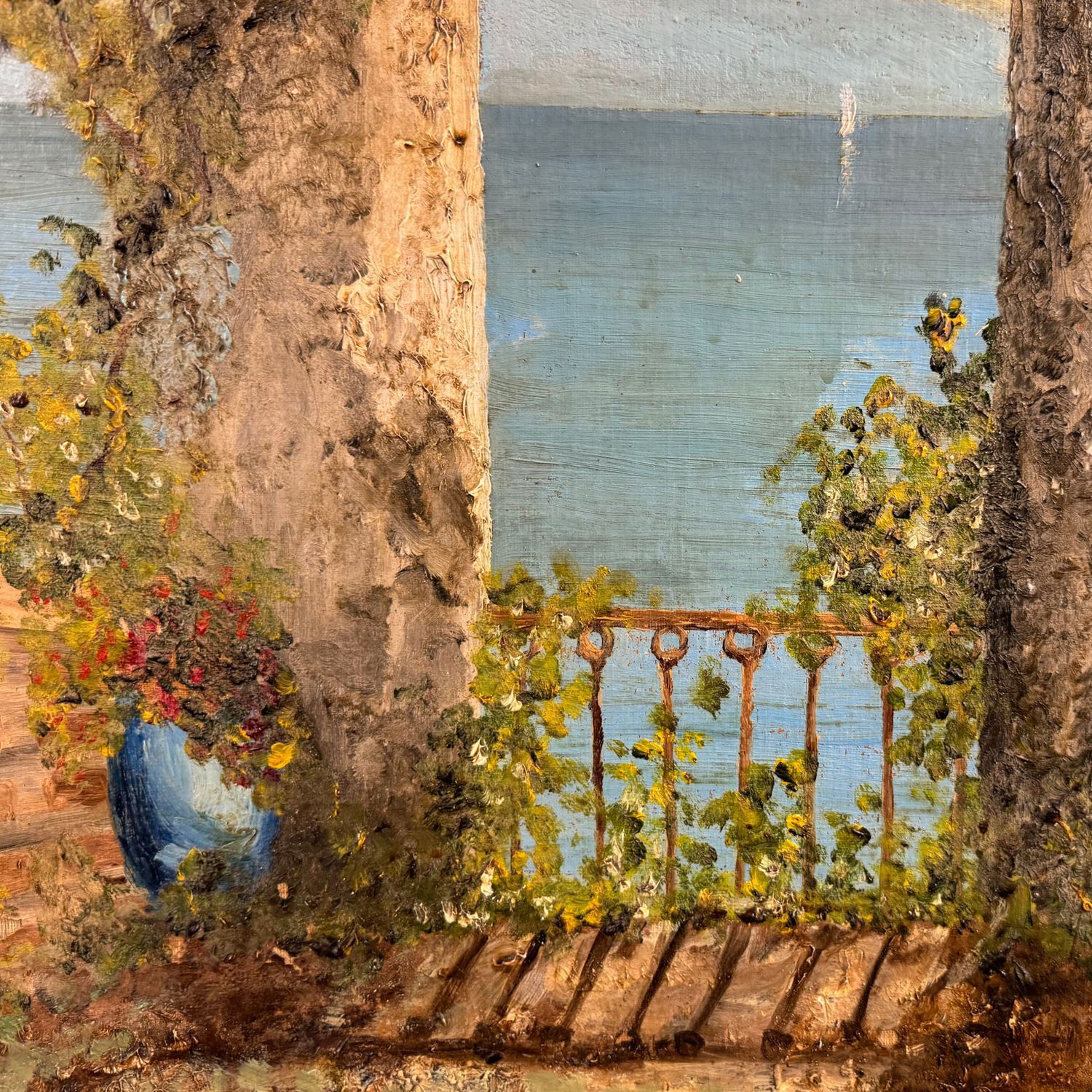 Dipinto olio su pannello, periodo XX secolo scuola Italiana, raffigurante Terrazza sul golfo.
