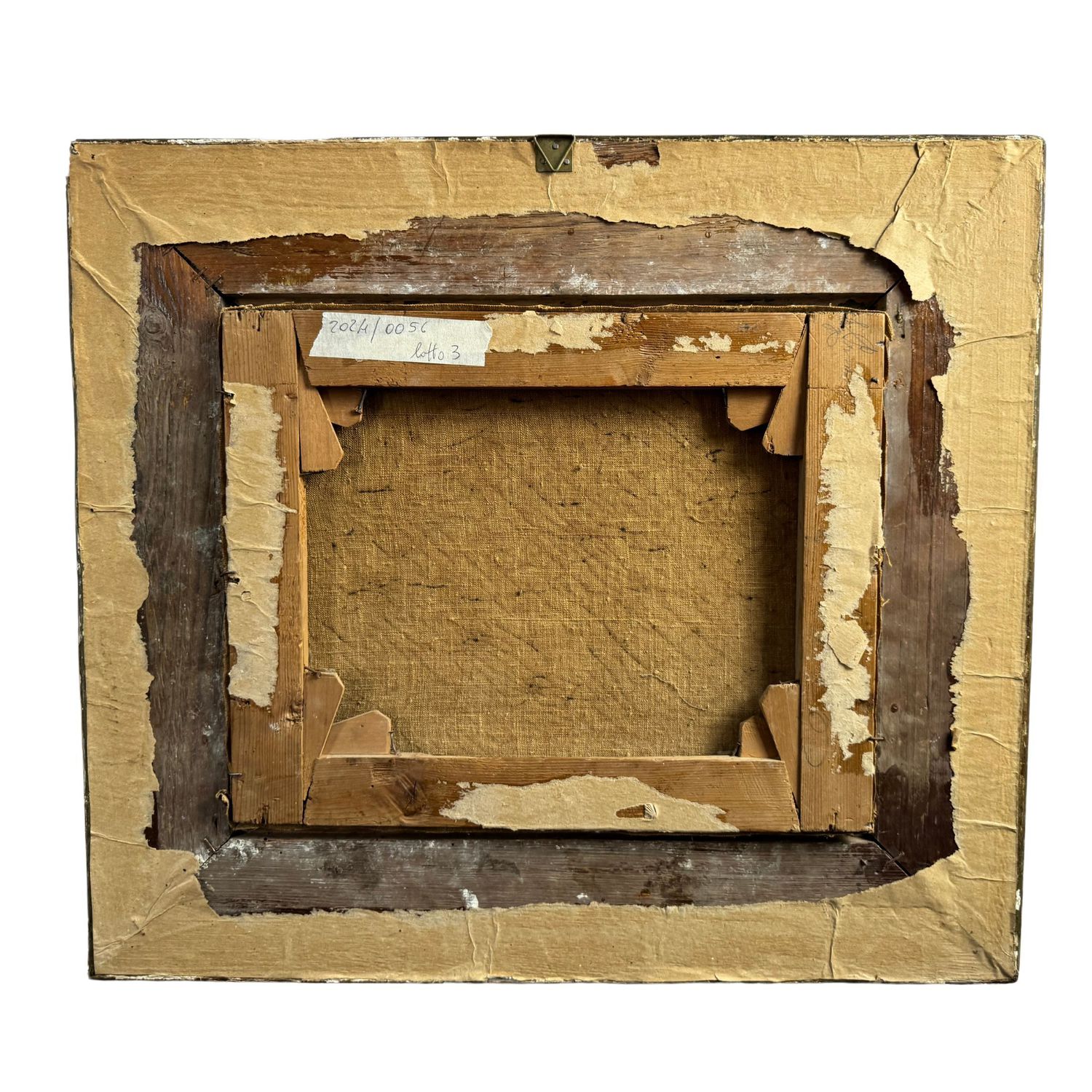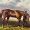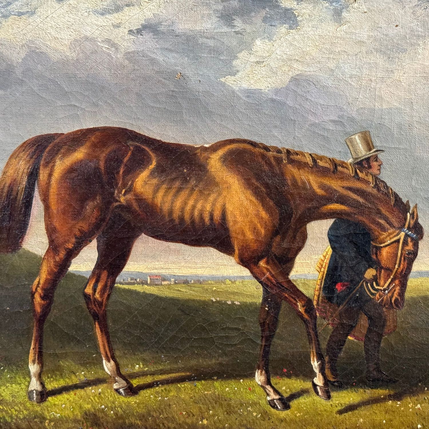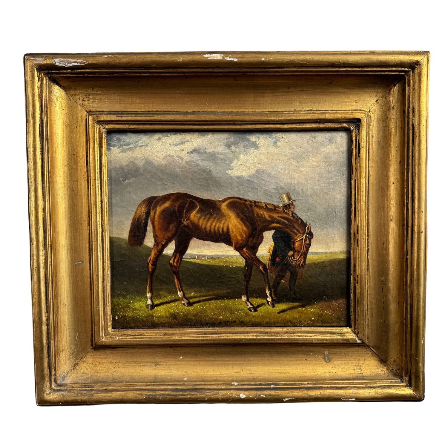 Dipinto olio su tela, periodo XIX secolo scuola Europea, raffigurante Personaggio di corte con cavallo.