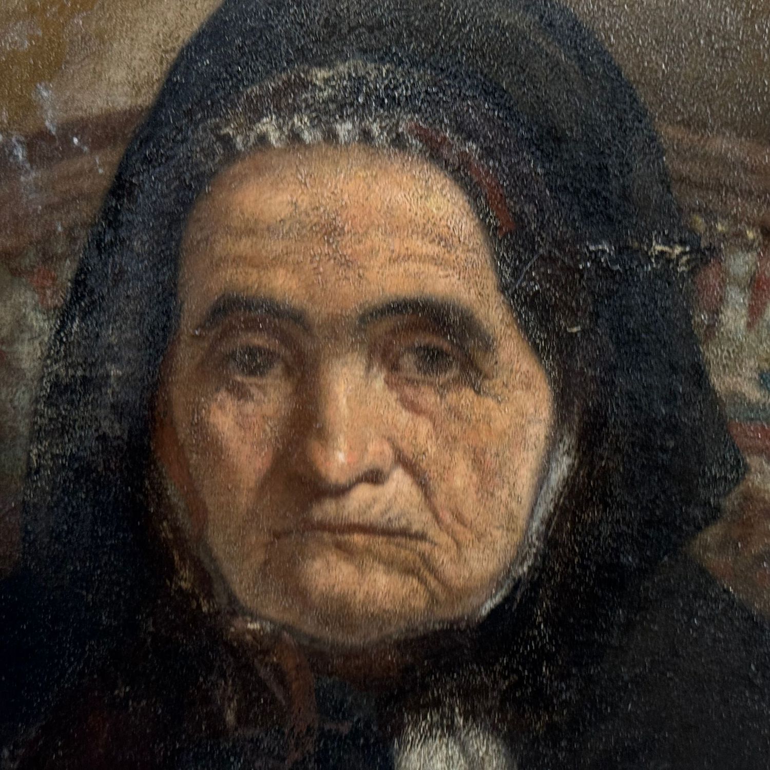 Dipinto olio su tela applicata su cartoncino, periodo XX secolo scuola Italiana, raffigurante Ritratto di anziana donna.