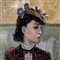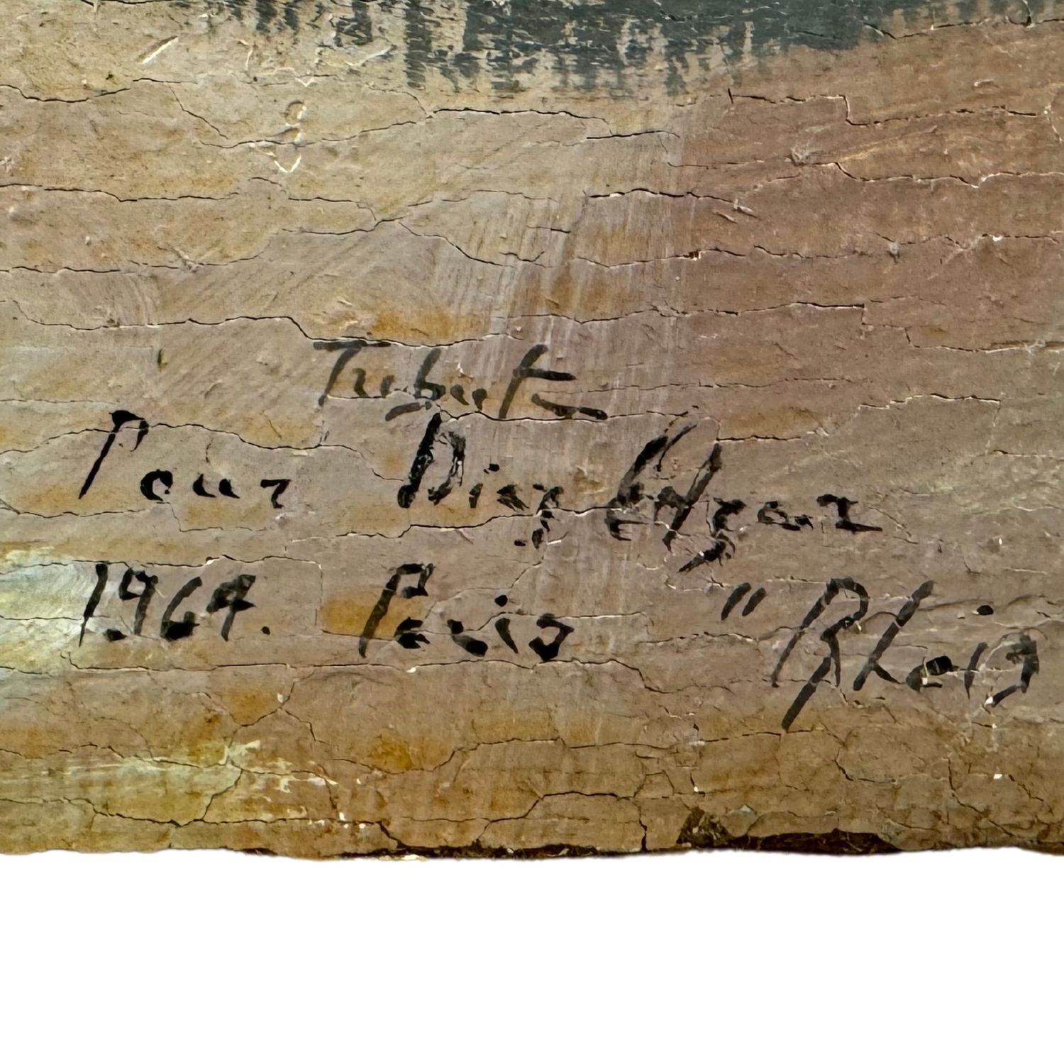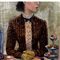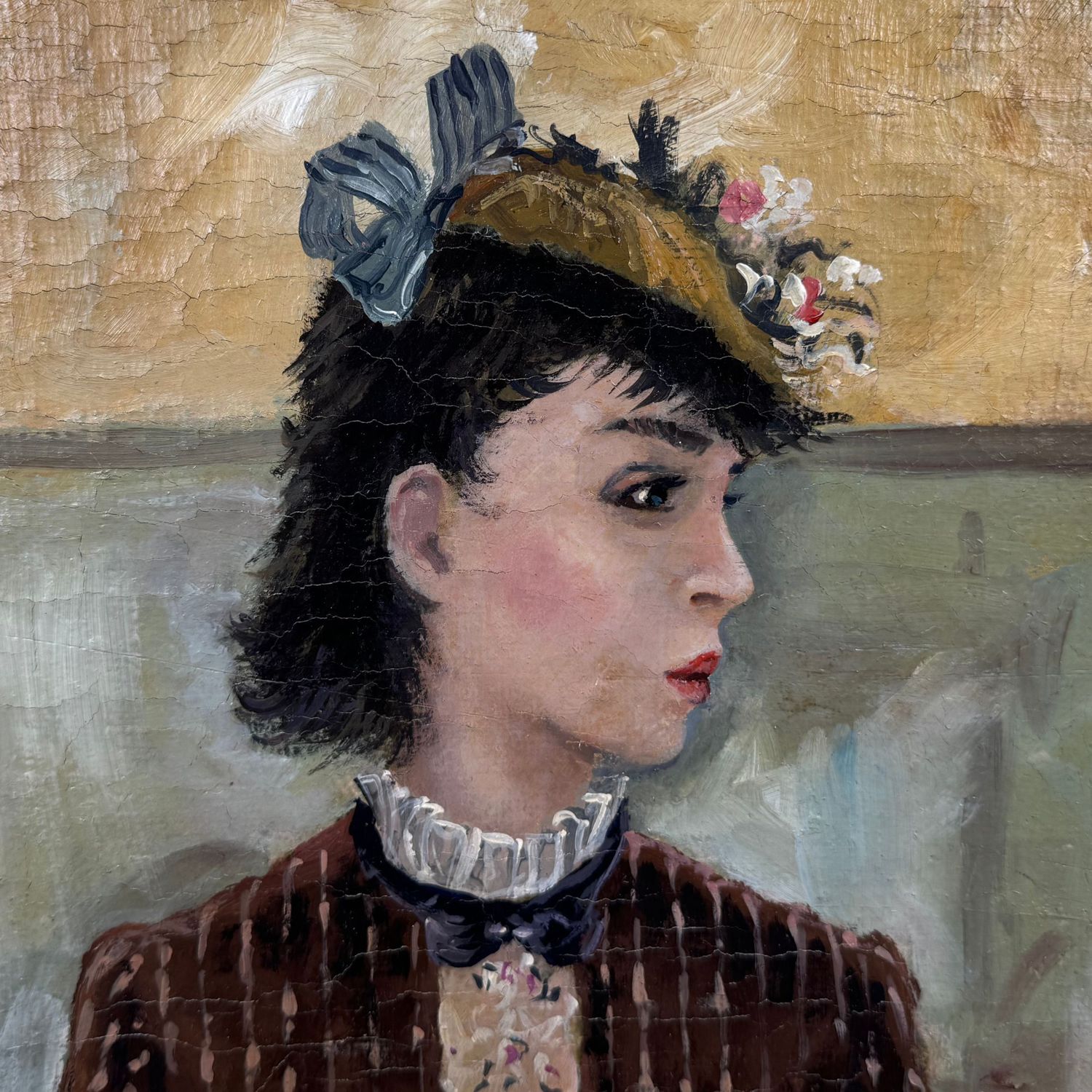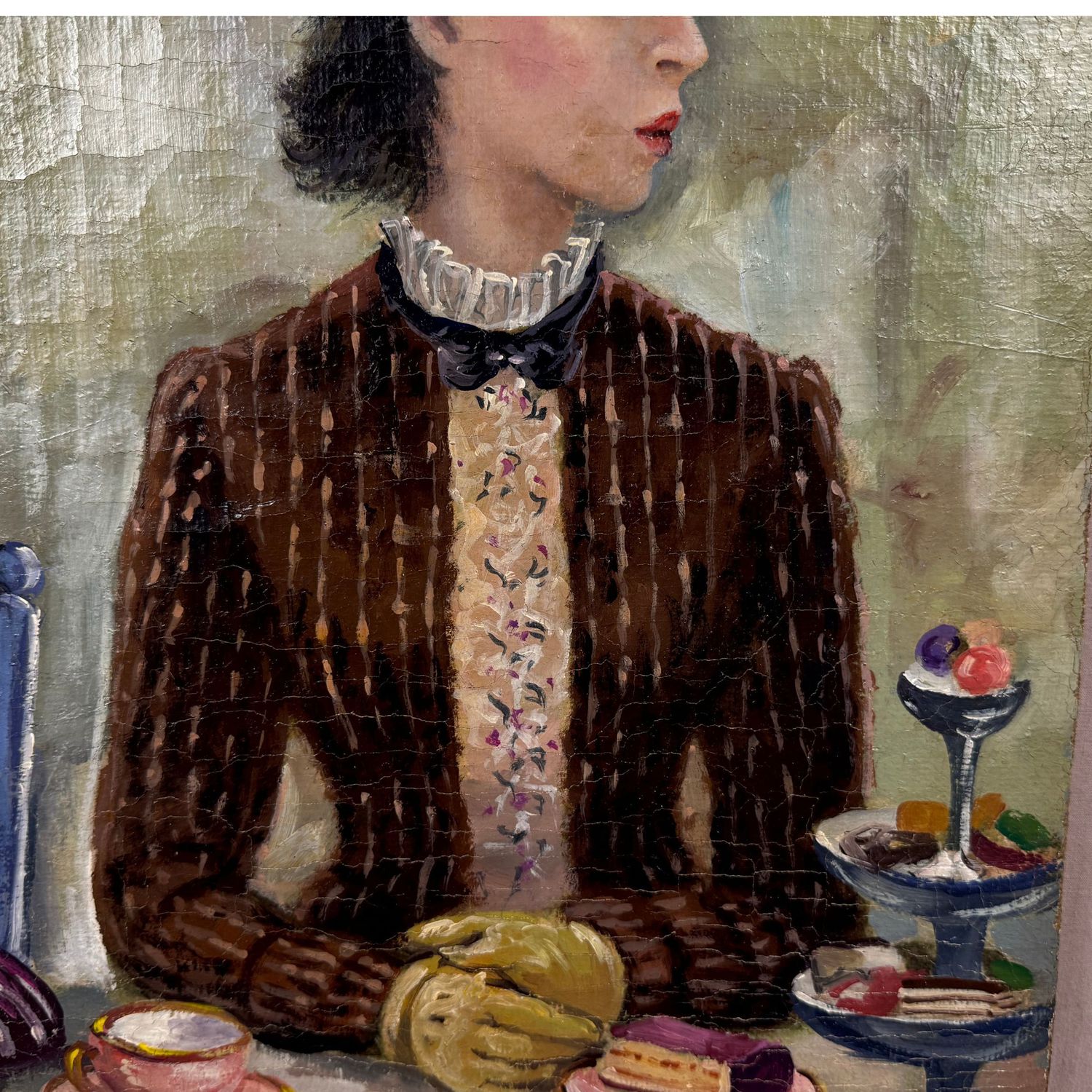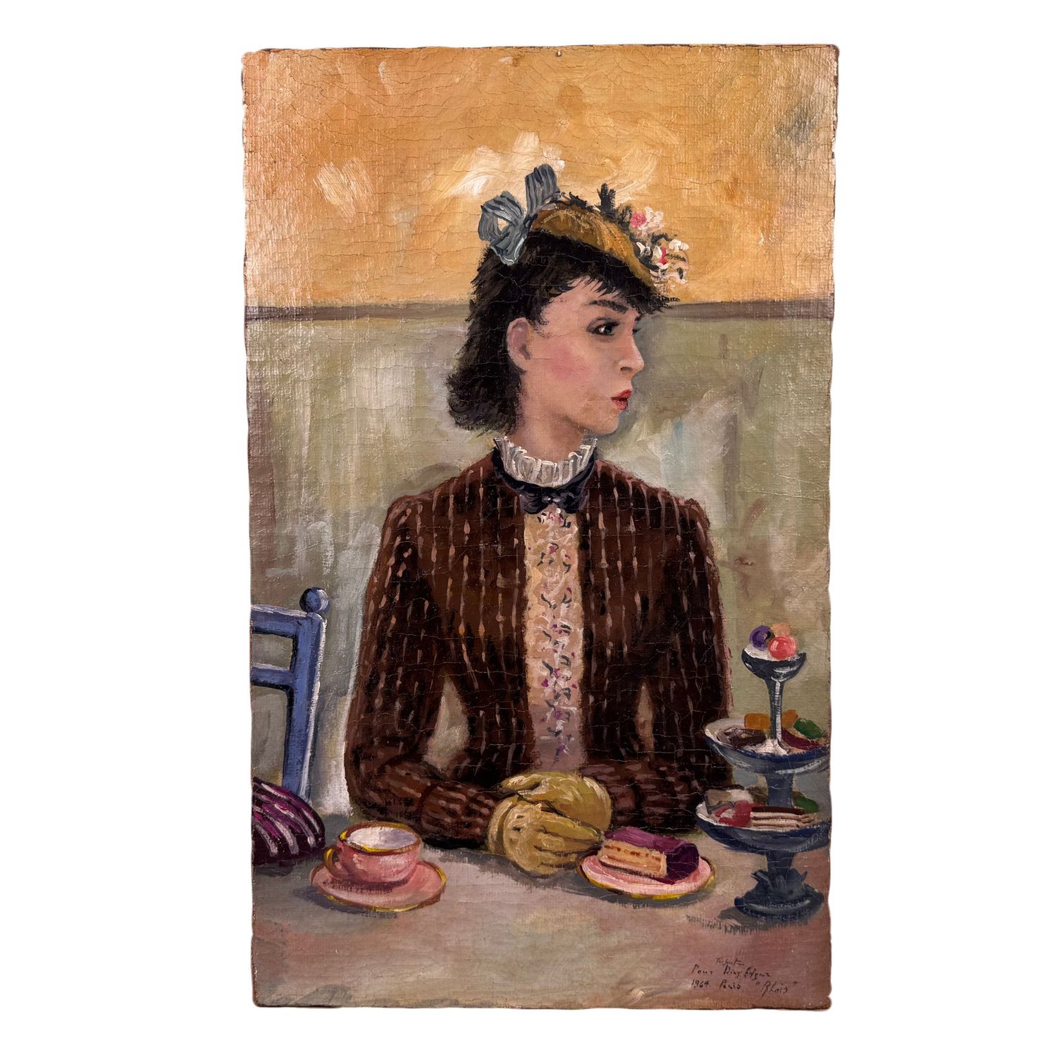 Dipinto olio su tela, periodo XX secolo (1964) scuola Francese, raffigurante Giovane donna al Caffè.