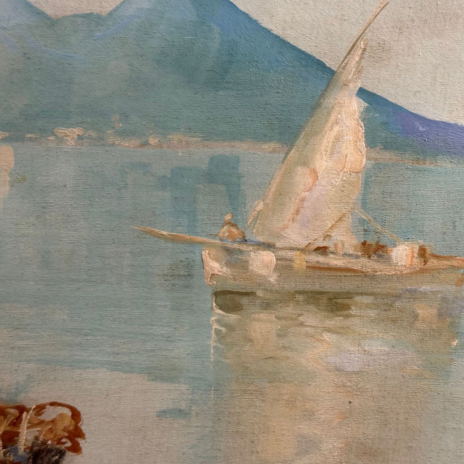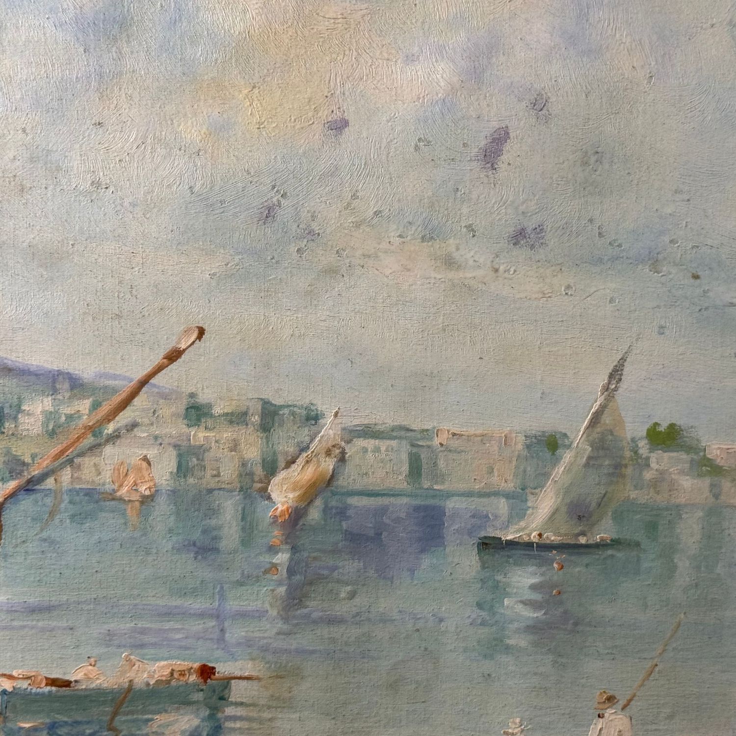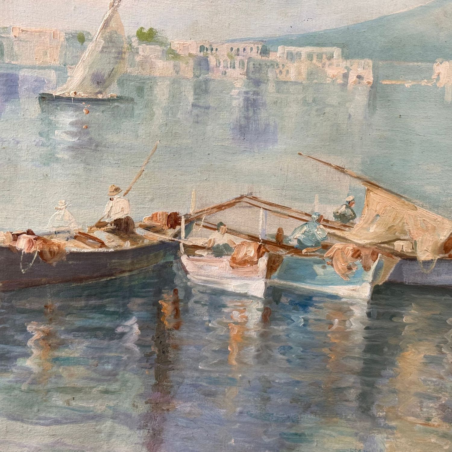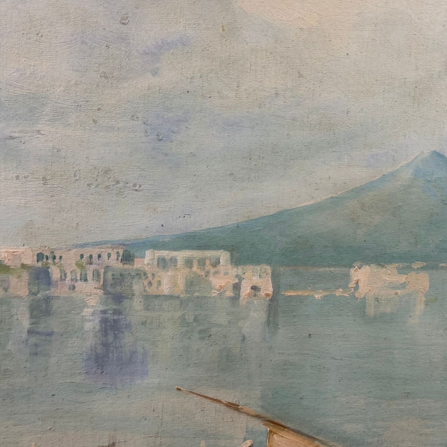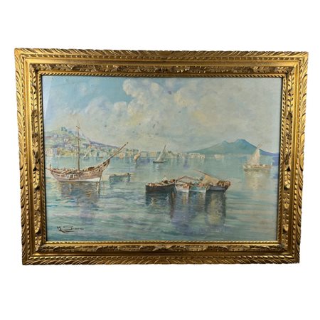 Dipinto olio su tela, periodo inizio XX secolo scuola Italiana da Maria Gianni (1873 - 1956), raffigurante Veduta di Napoli dal mare.