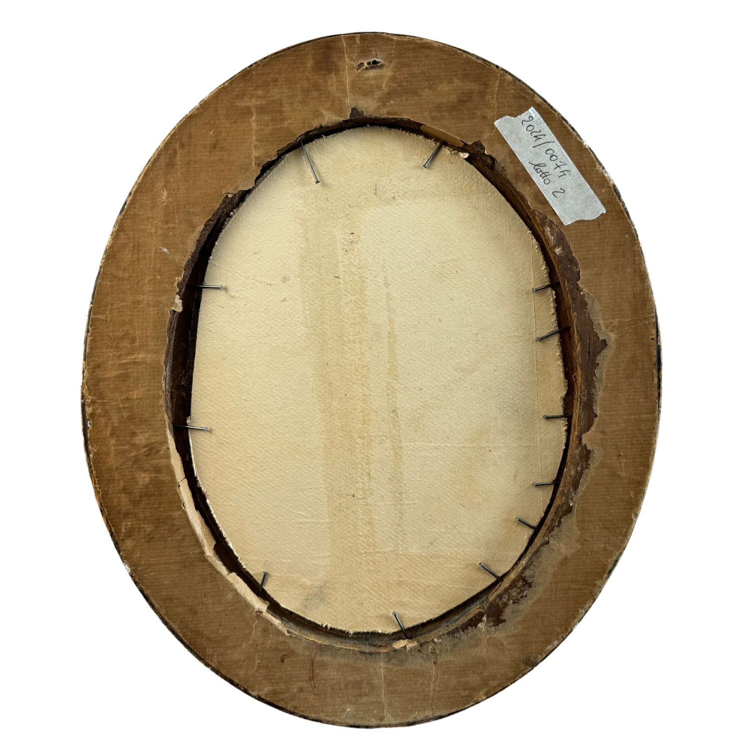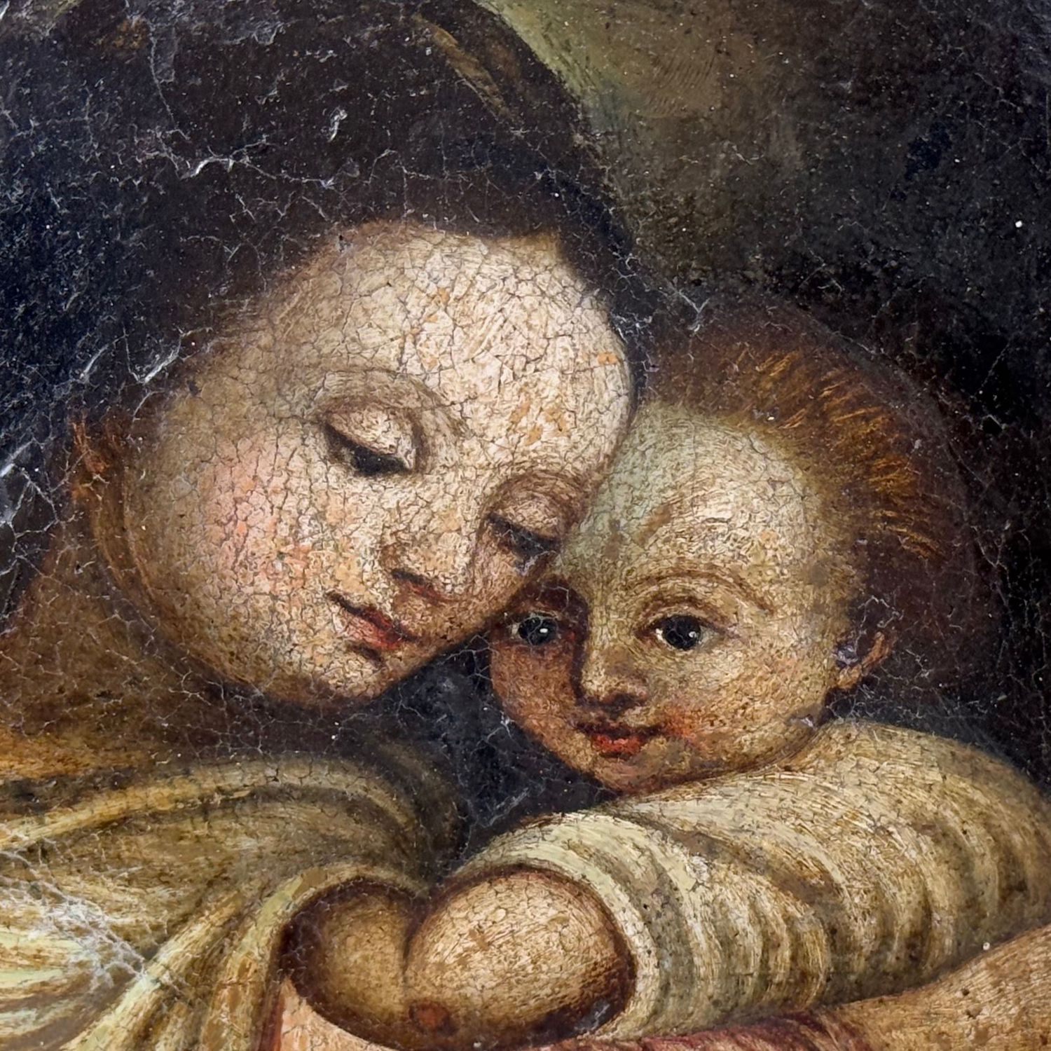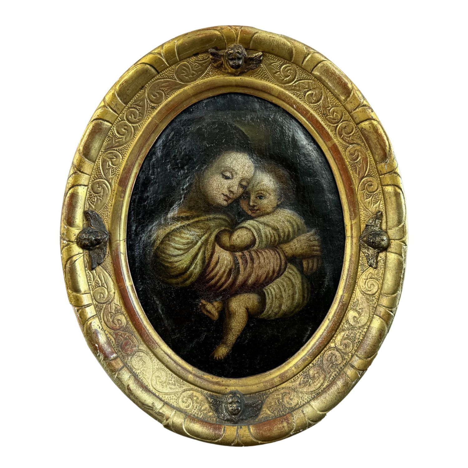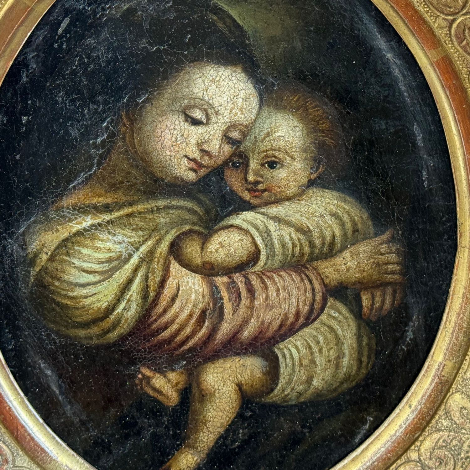 Dipinto olio su tela applicata su cartoncino di forma ovale, periodo XVIII secolo scuola Italiana, raffigurante Madonna con Bambino.