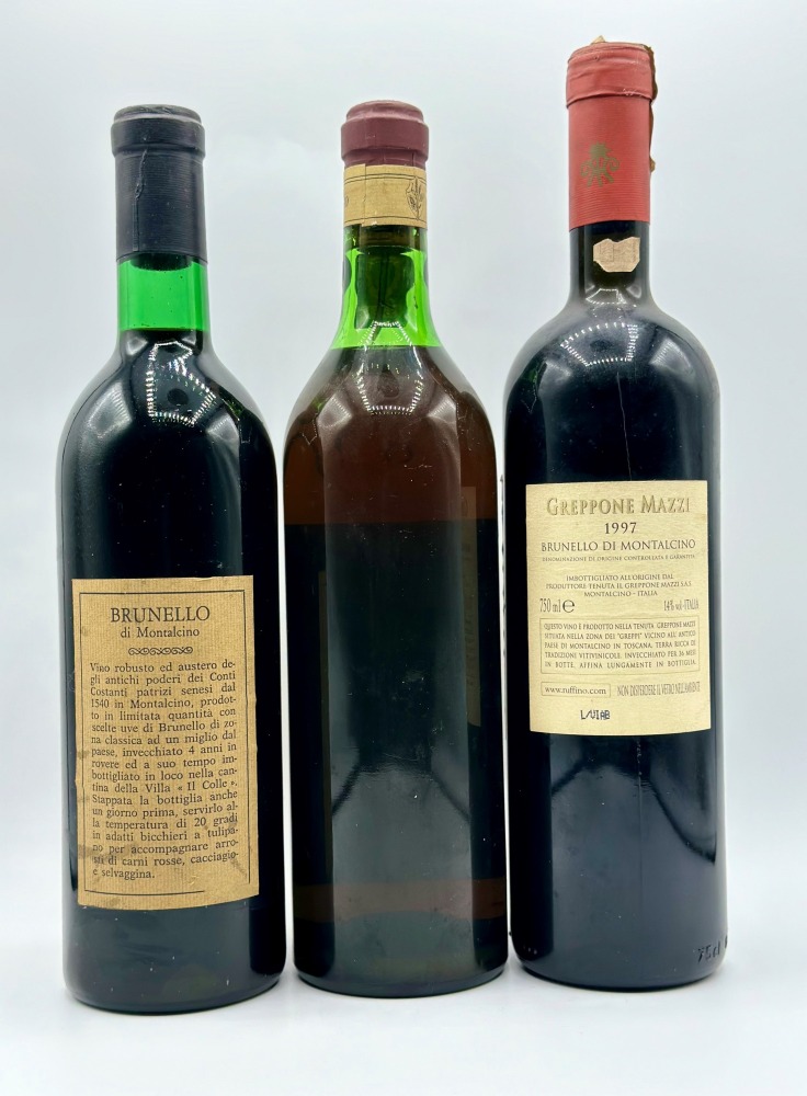 Selezione Brunello - 3 bottiglie (bt), annate 1970 e 1997. Livello : sommità della spalla (TS). Condition report : etichetta e capsula con segni d'usura del tempo.