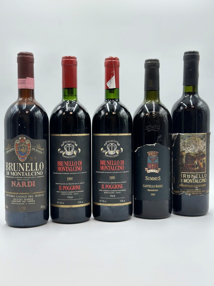 Selezione Brunello di Montalcino DOCG - 5 bottiglie (bt), annate 1990 e 1995. Livello : collo inferiore (BN) e sommità della spalla (TS). Condition report : etichetta e capsula con segni d'usura del tempo.