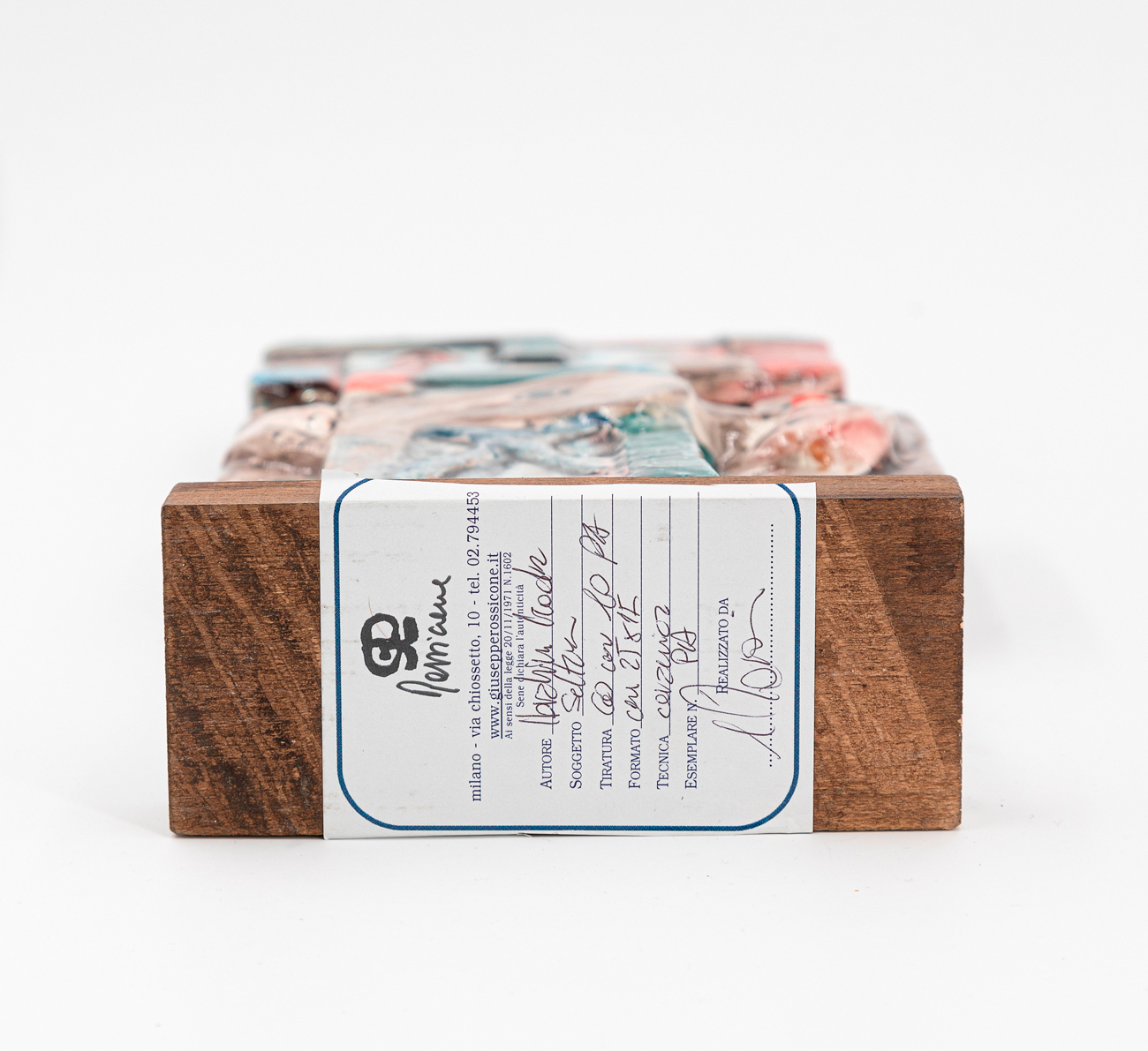 Etichetta delle Ceramiche Rossicone (MI) con caratteristiche tecniche dell'opera e numerazione (Esemplare P.A.) sotto la base