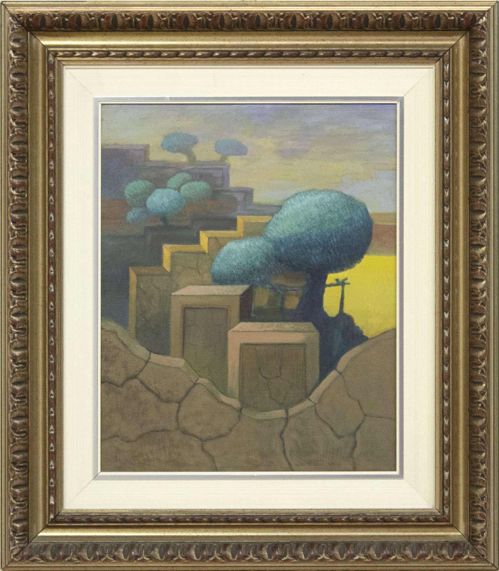 John Picking, Structures and olives II, anni Novanta, olio su tela, cm 50x40, autentica a cura dell'artista