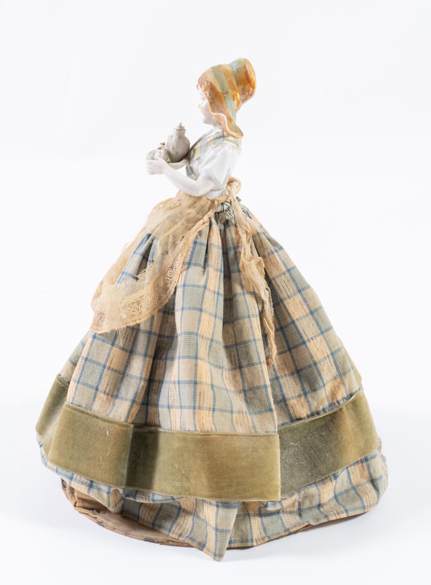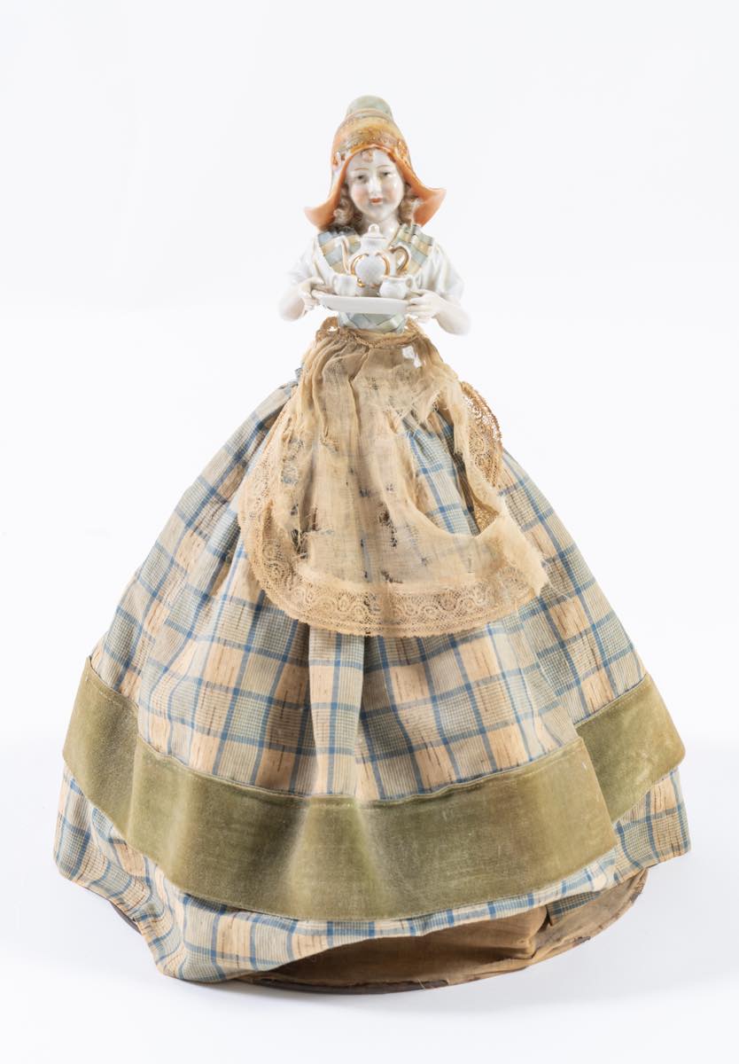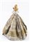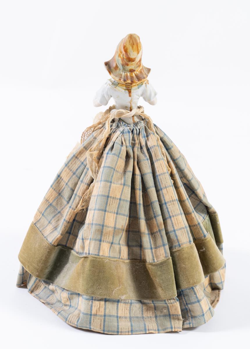 Bambola in ceramica, XX secolo cm 40x30 abiti in stoffa, ricami e merletto