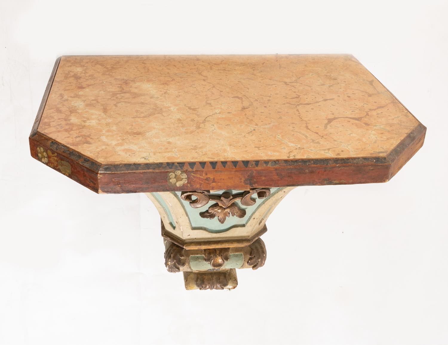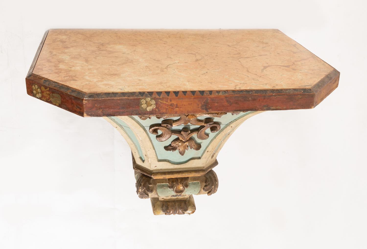 Consolle ricavata dalla cuspide di un baldacchino in legno intagliato, laccato e dorato