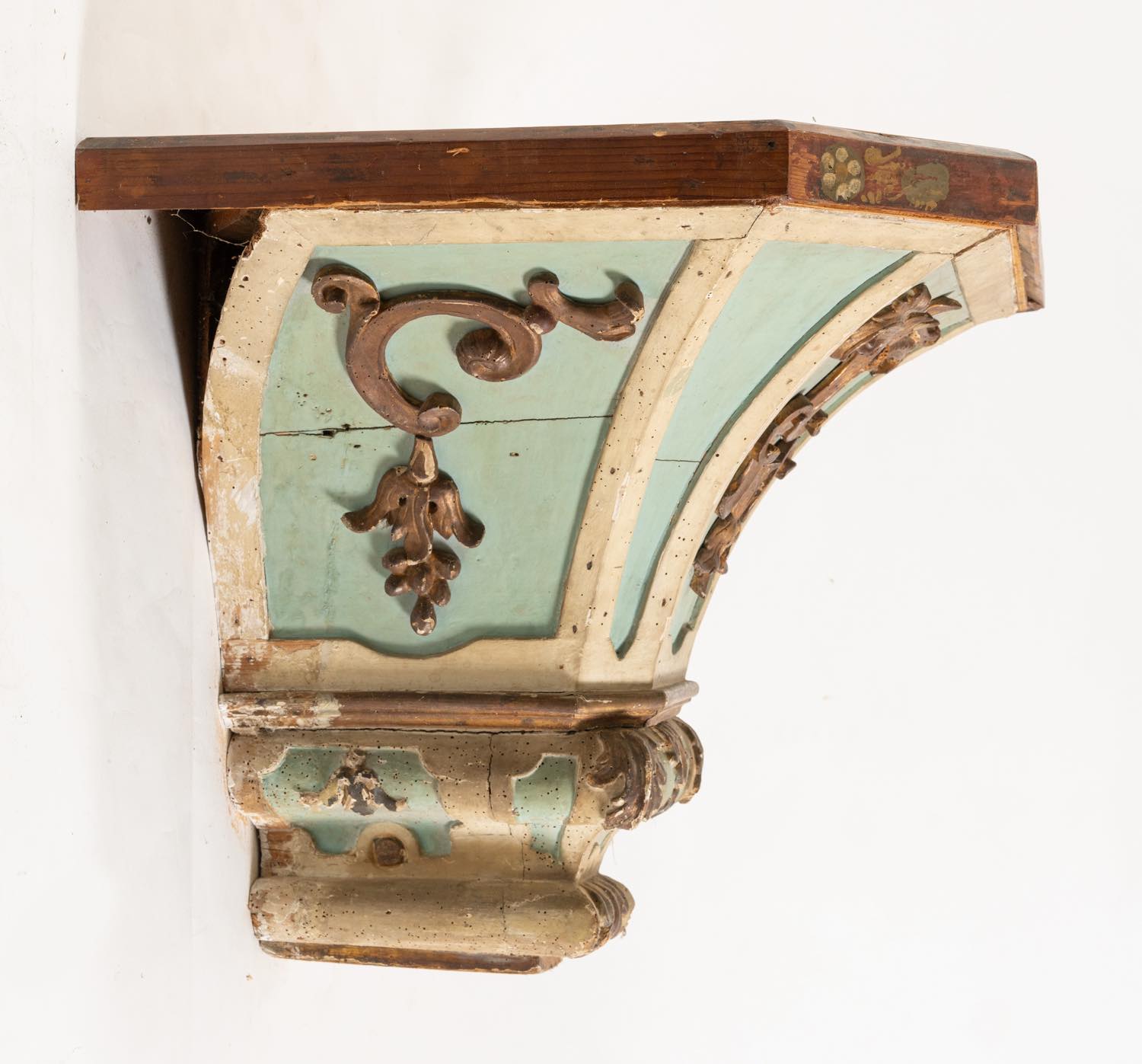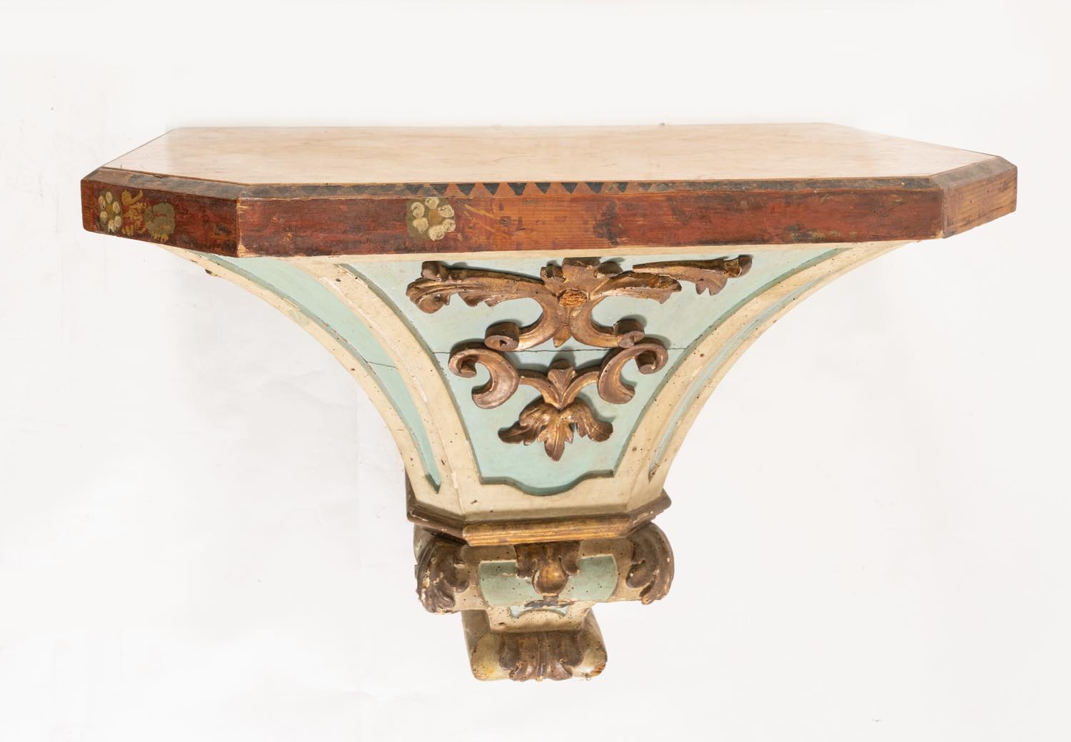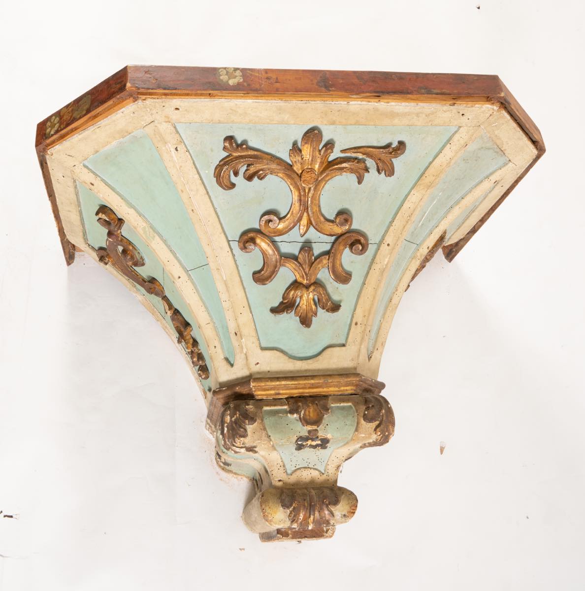 Consolle ricavata dalla cuspide di un baldacchino in legno intagliato, laccato e dorato Stato pontificio, prima metà del XVIII secolo