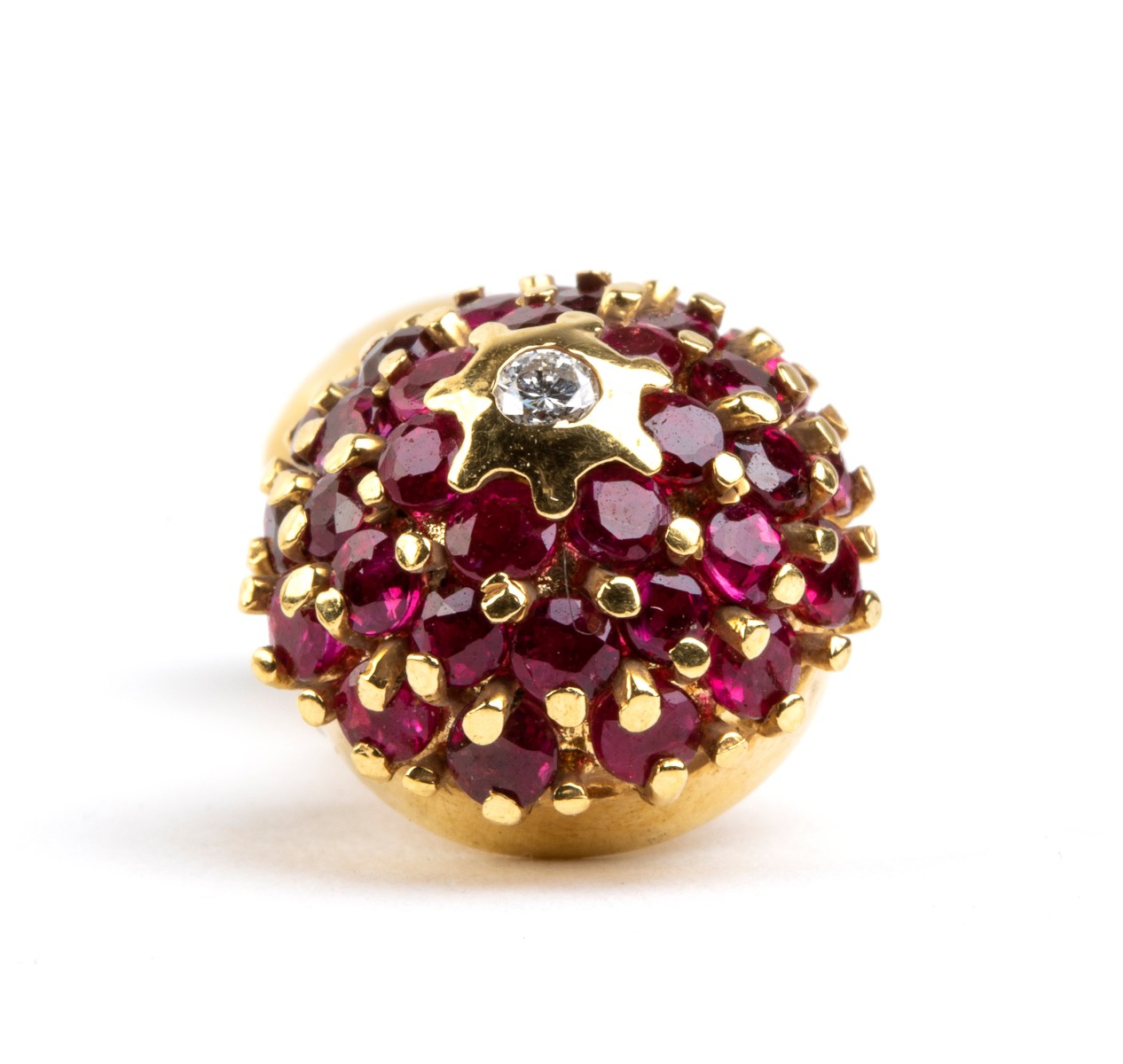 in oro giallo 18k, impreziositi da rubini e diamanti.