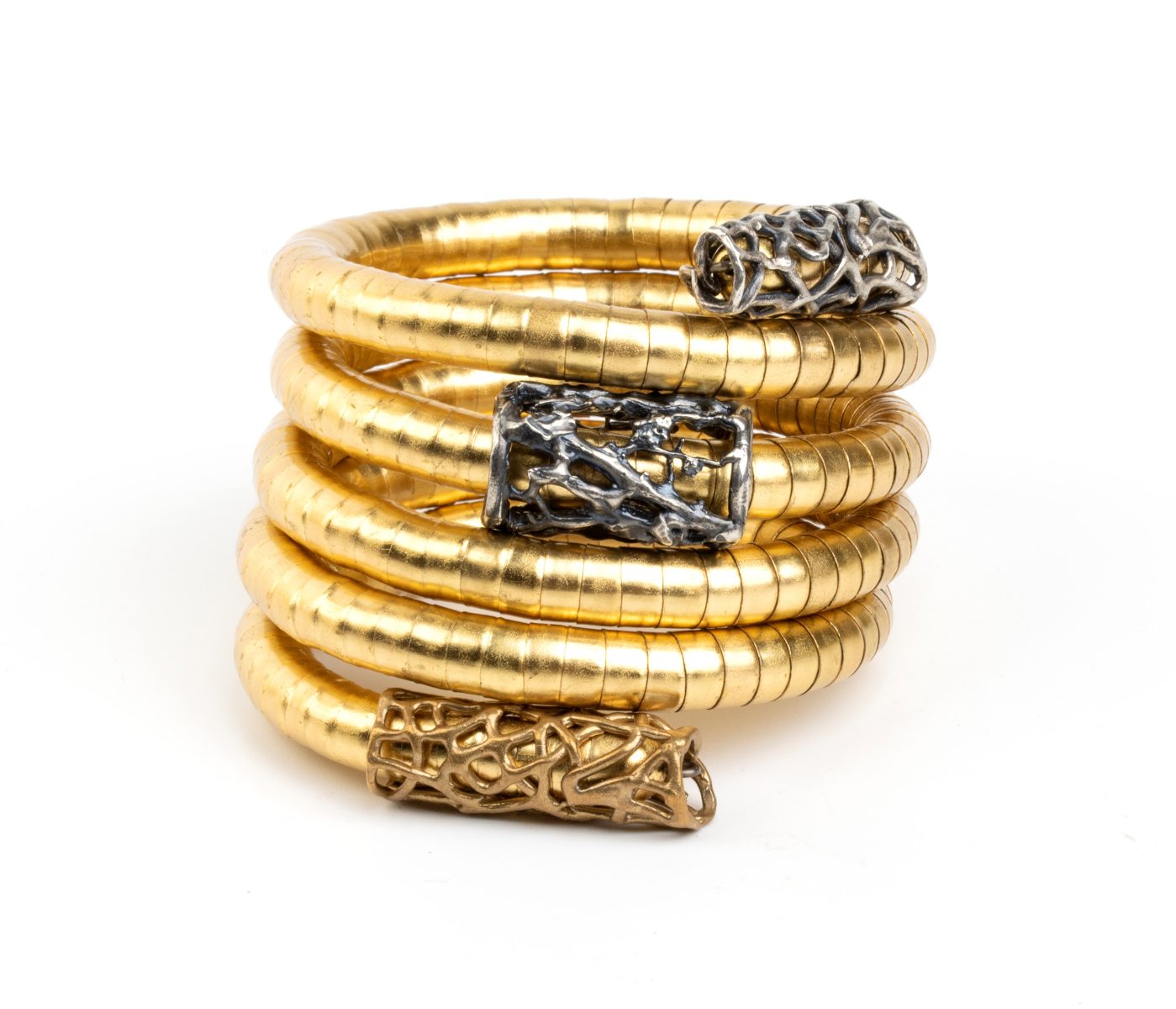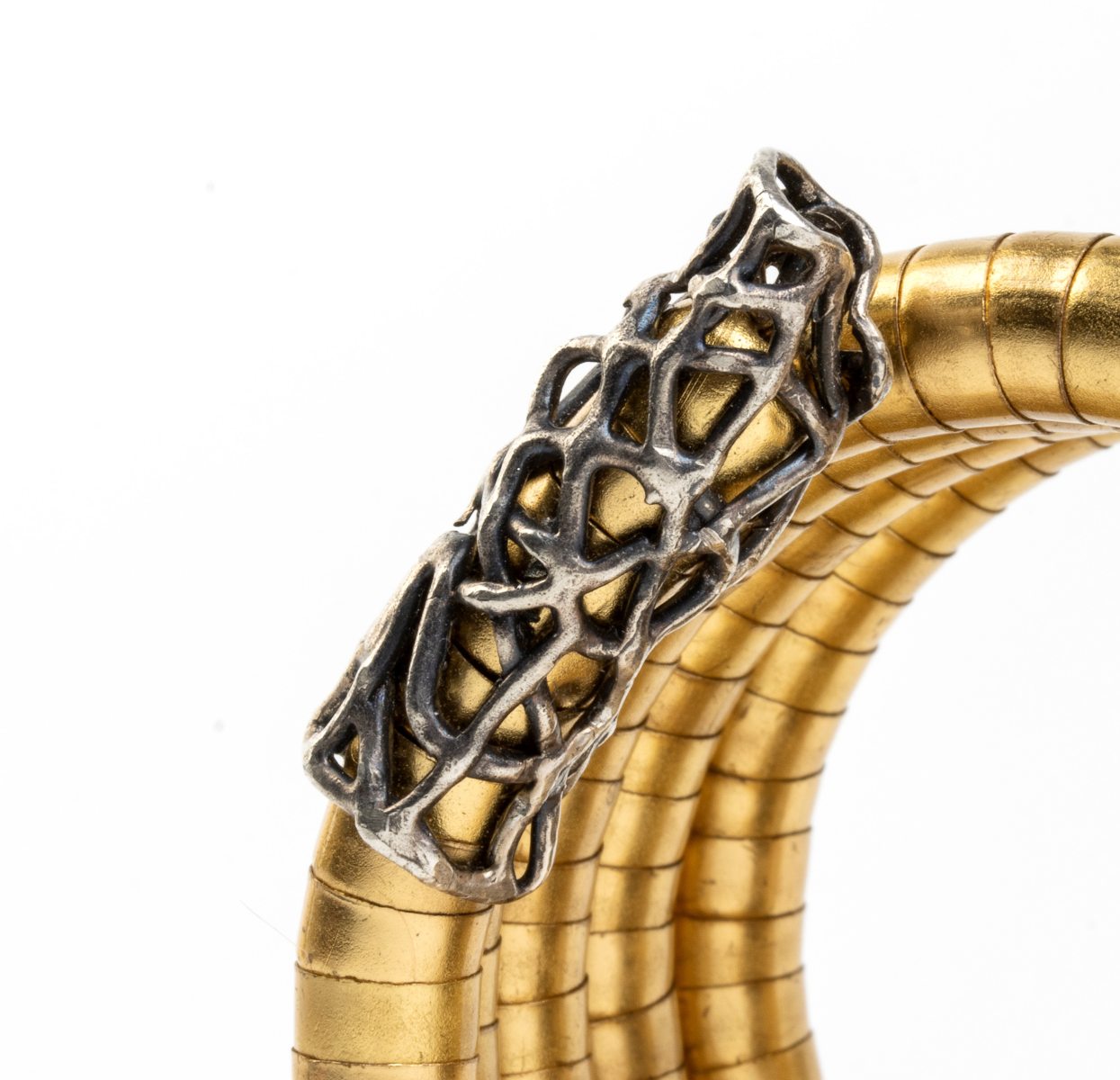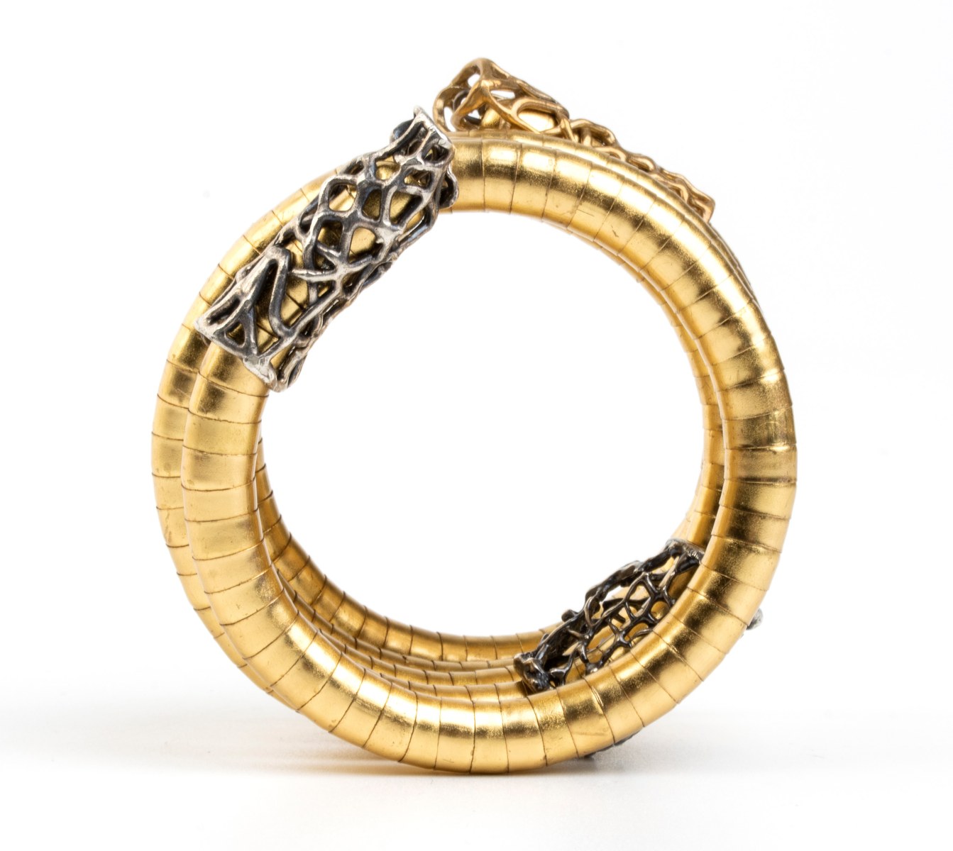 bracciale dorato modello serpente, con decorazioni in motivo a rete. Firmato ISABELLA ASTENGO.