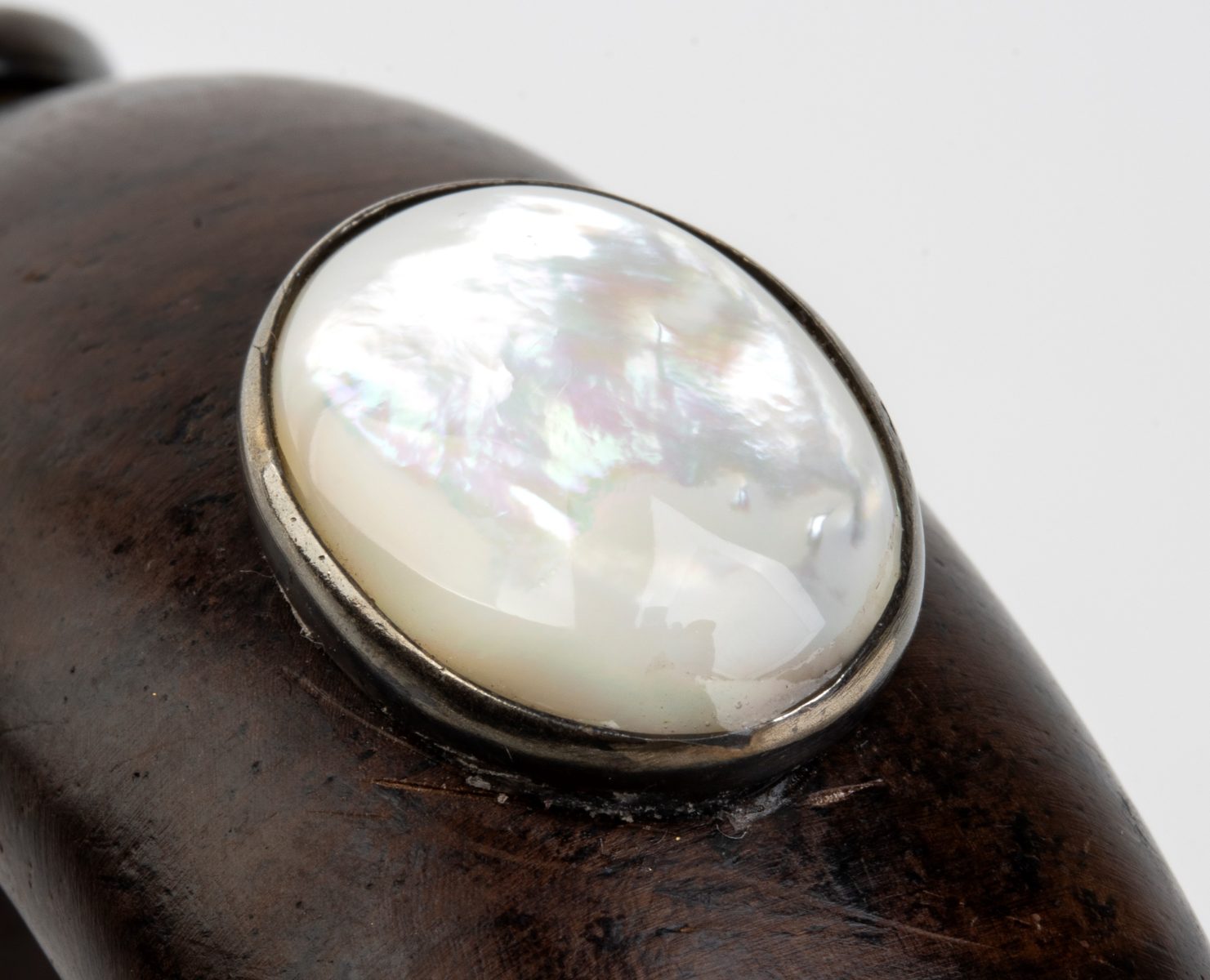 bracciale in legno impreziosito da 5 cabochon di madreperla. Firmato ISABELLA ASTENGO.