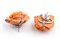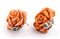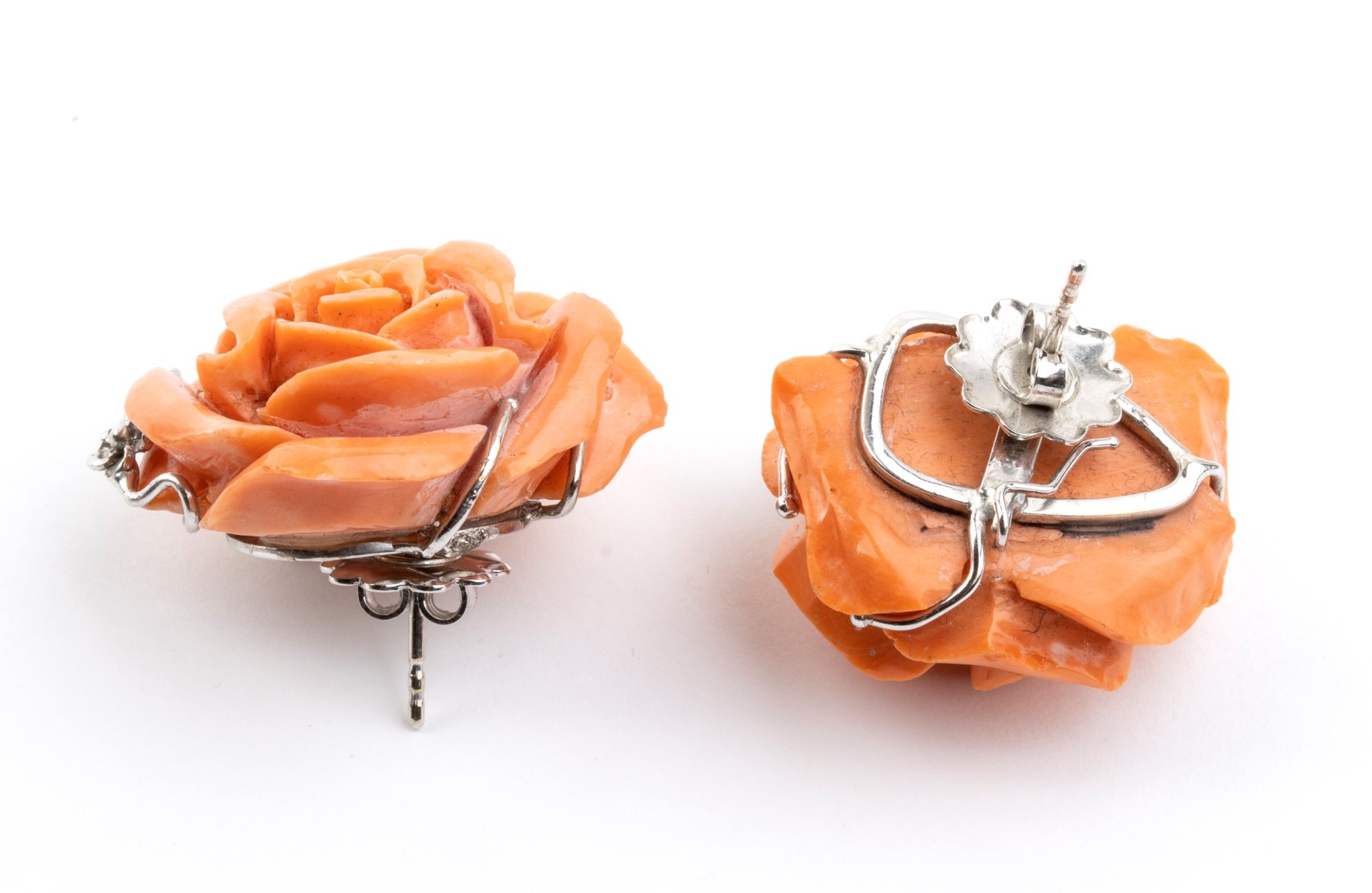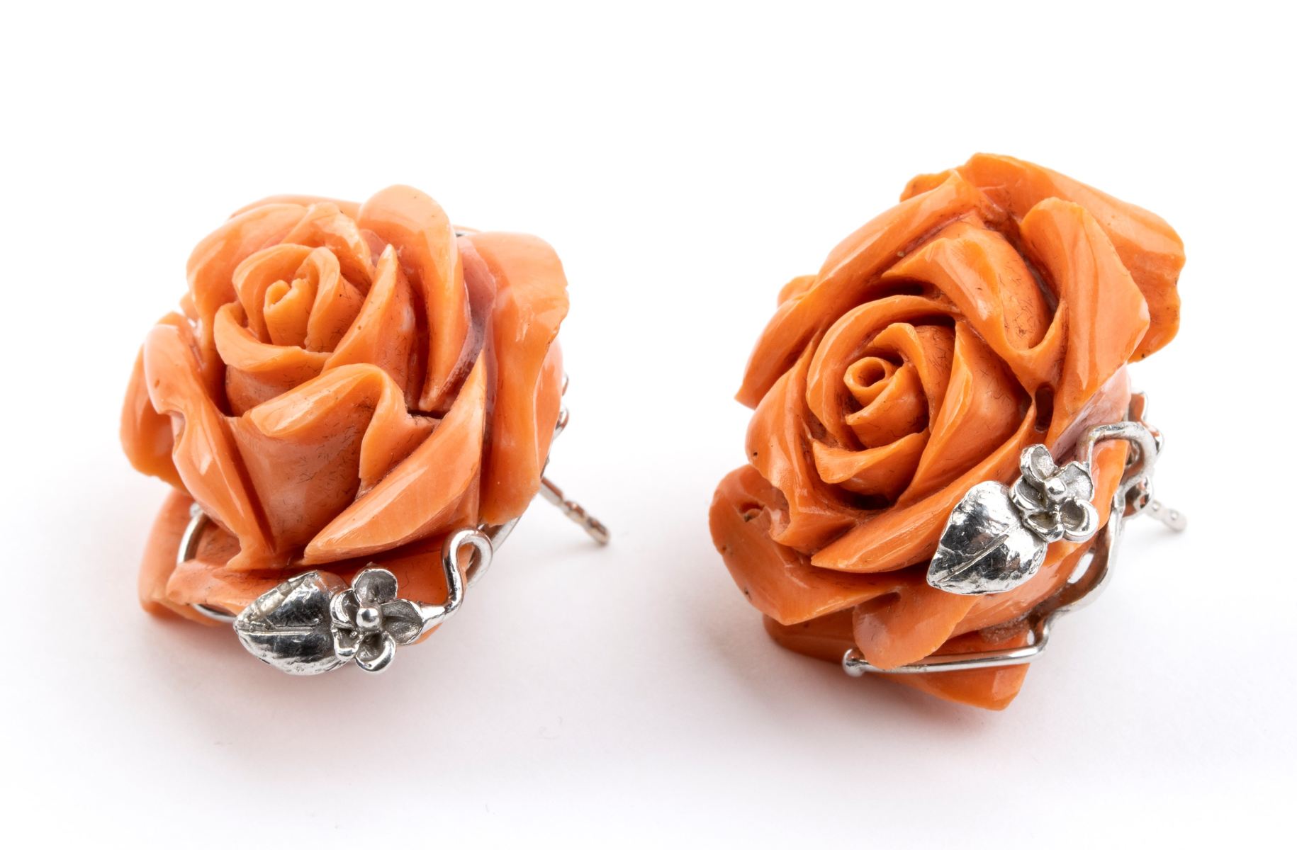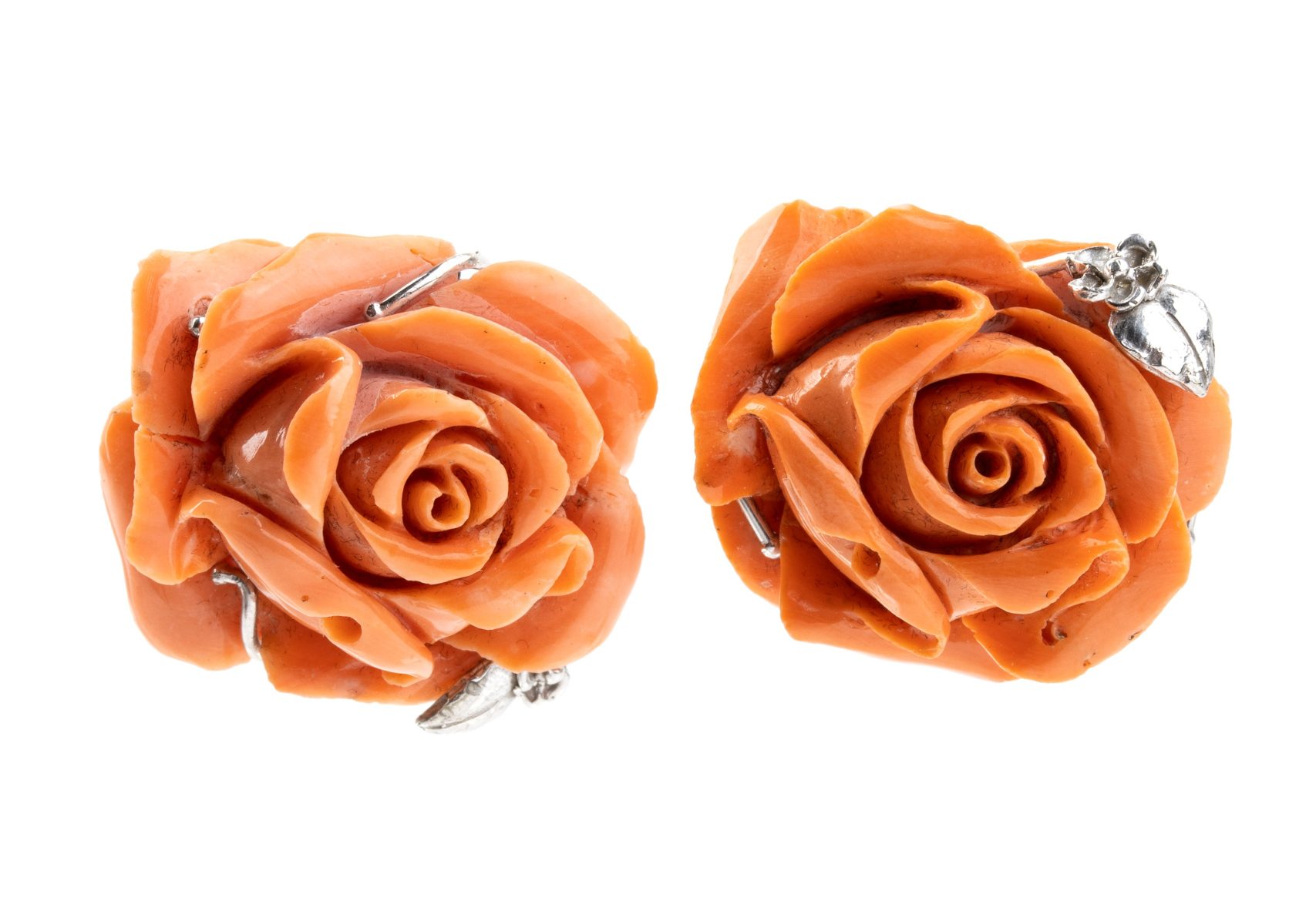 ciascuno incastonato con corallo cerasuolo (corallium elatius), lavorato a forma di rosa, montatura in oro bianco 18k.