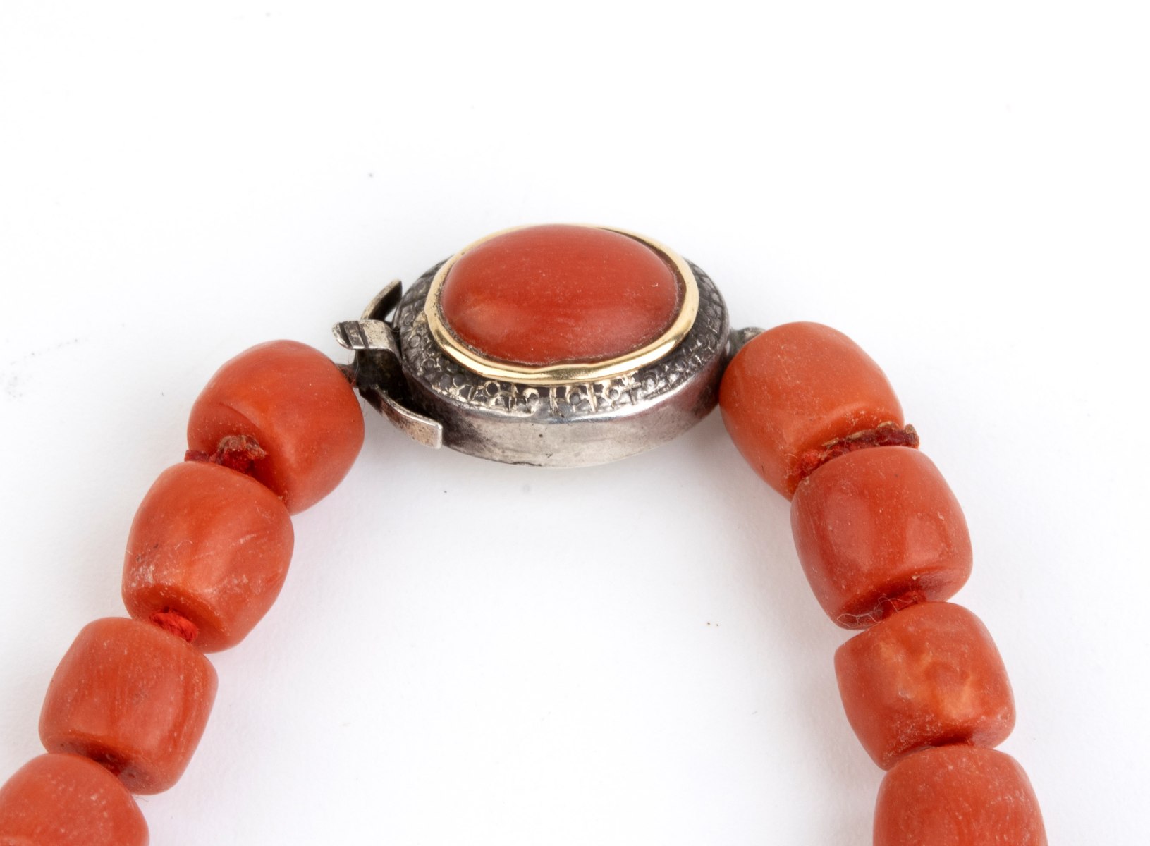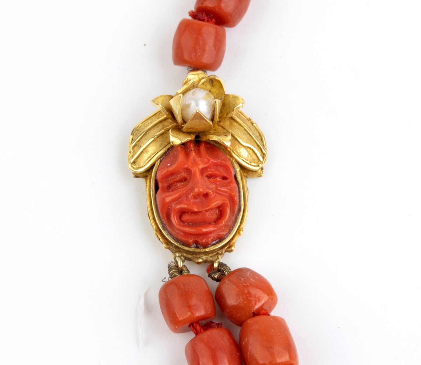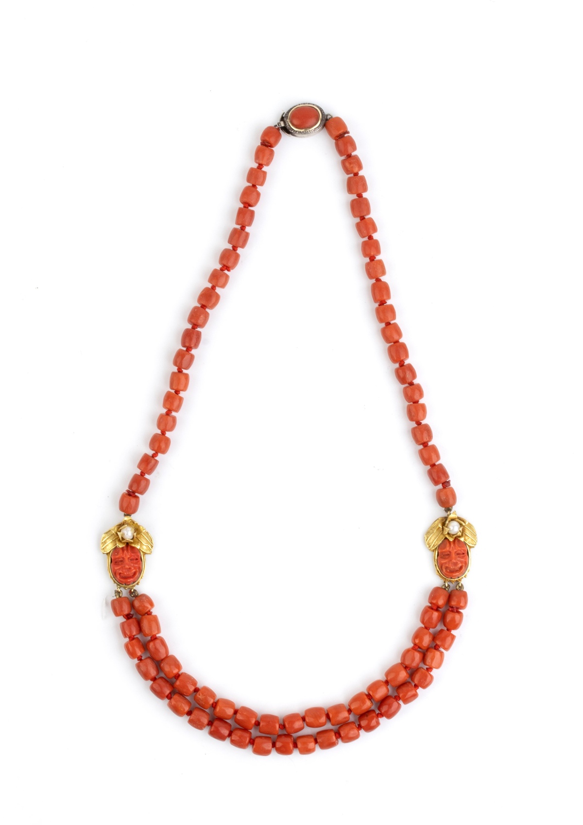 barilotti e coppia di cammei raffiguranti maschere teatrali in corallo Mediterraneo (corallium rubrum), chiusura in argento.