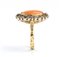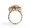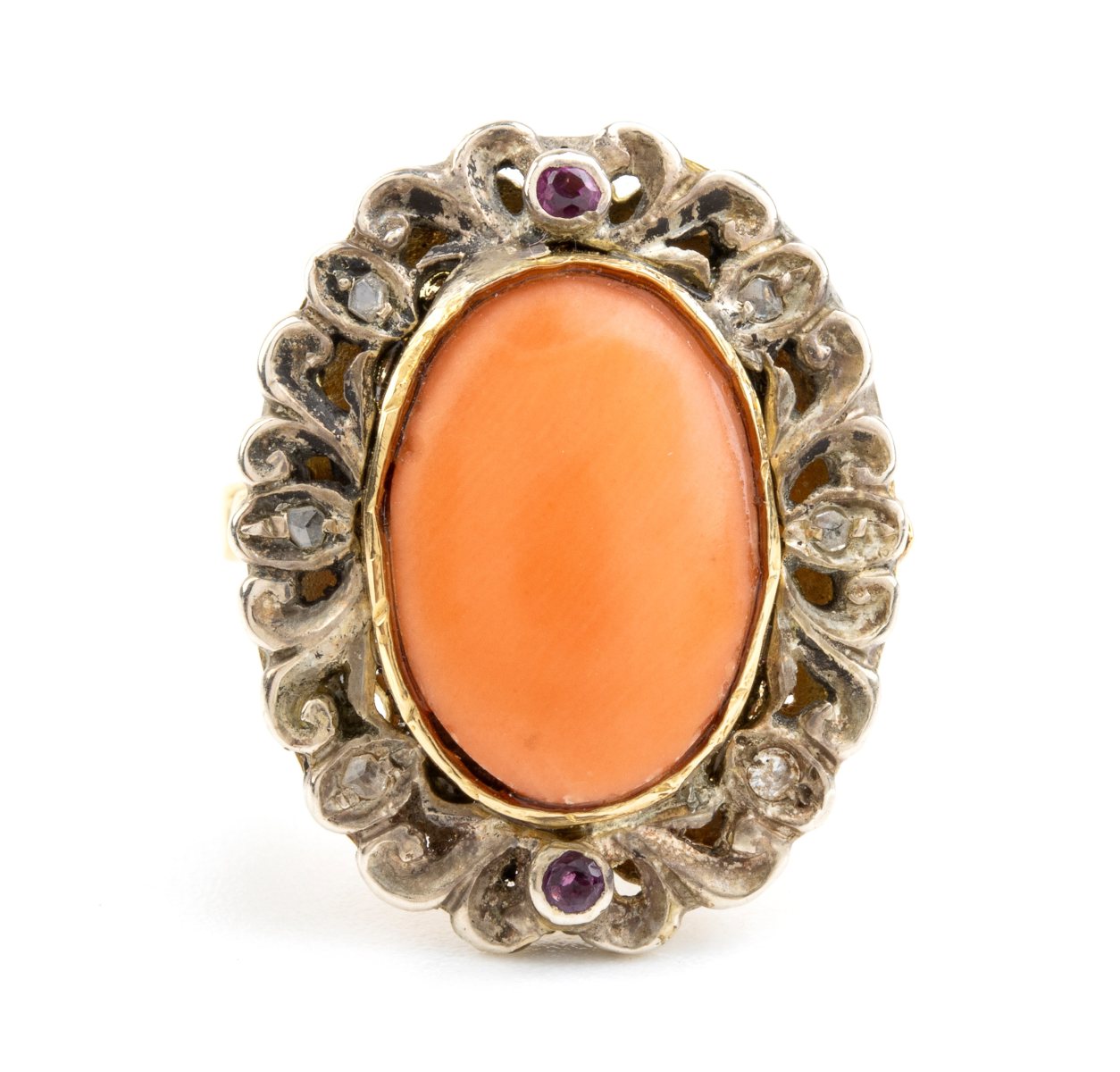 montatura a motivo floreale in oro giallo 18k, incastonato con cabochon di corallo cerasuolo (corallium elatius) incorniciato da diamanti tagliato a rosa e rubini.