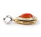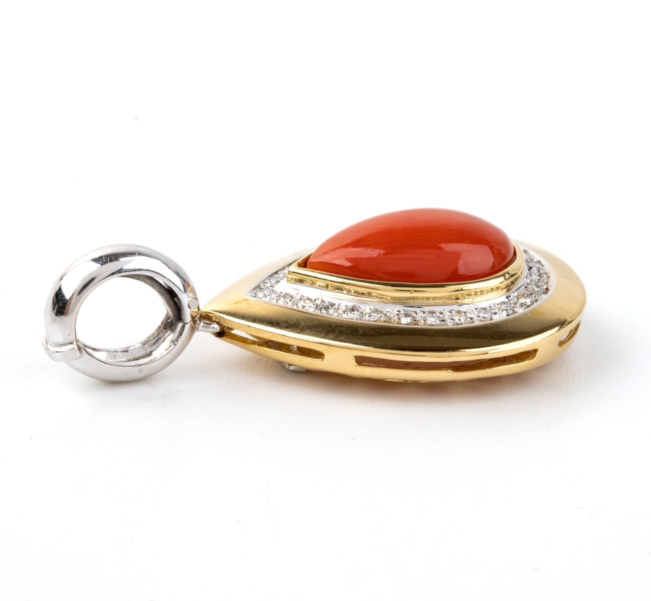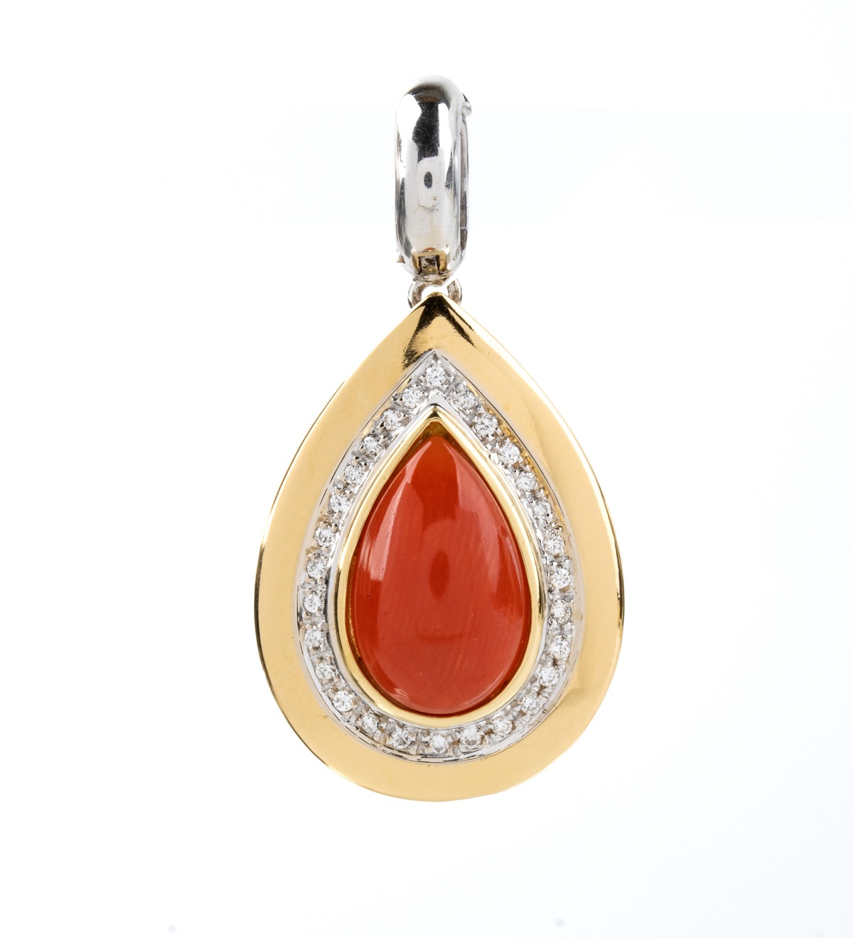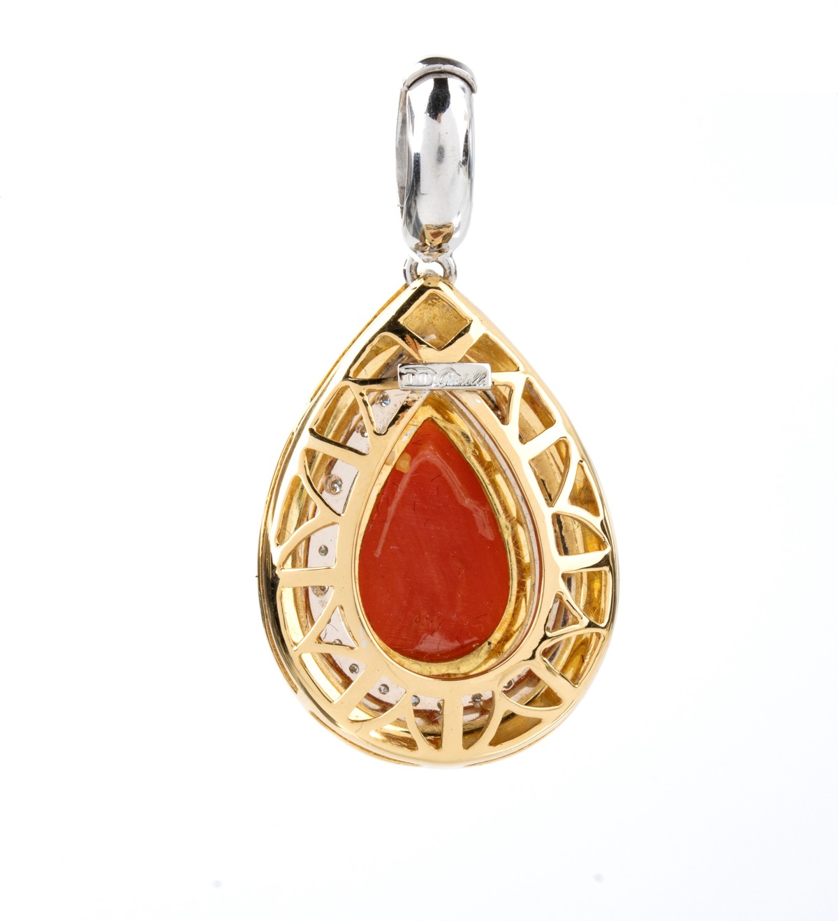 pendente a forma di goccia, incastonato con cabochon di corallo Mediterraneo (corallium rubrum), incorniciato da diamanti.
