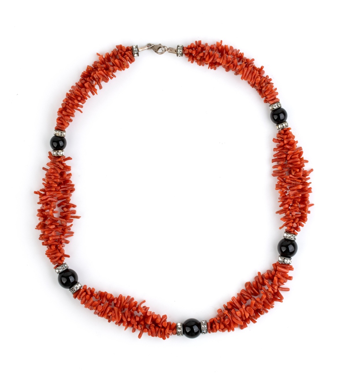 rametti di corallo Mediterraneo (corallium rubrum), sfere in onice, paste vitee ed argento.