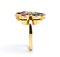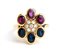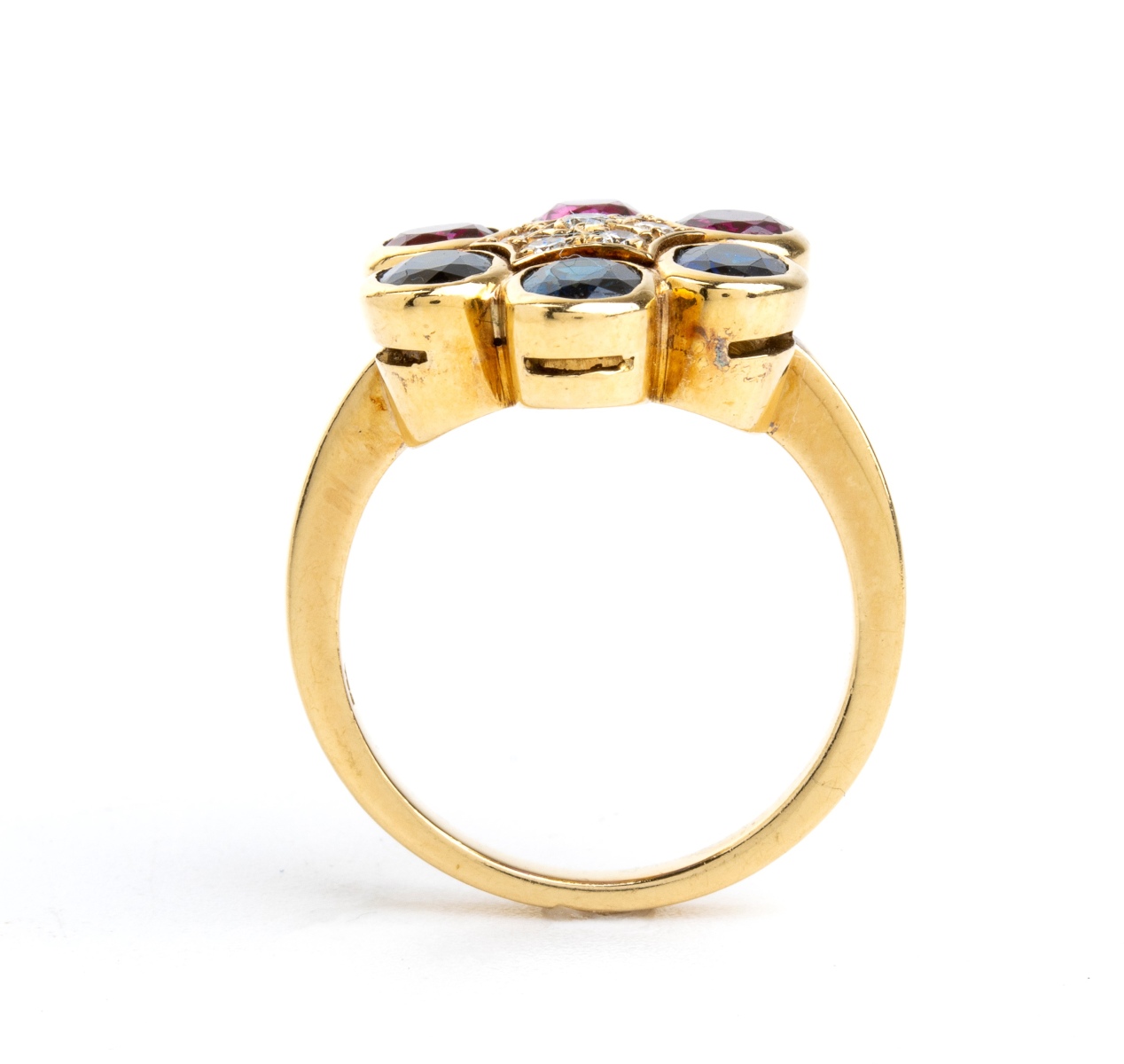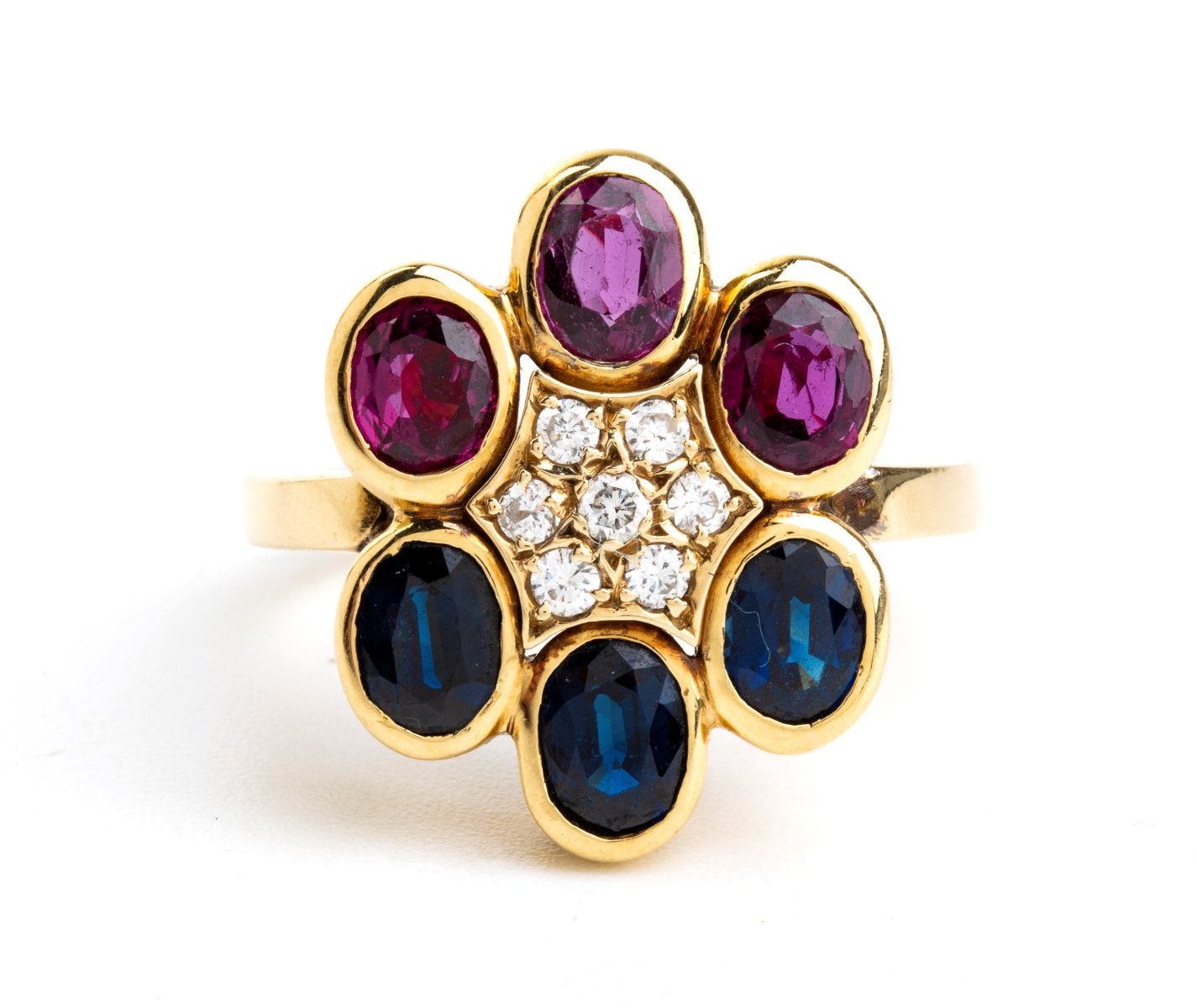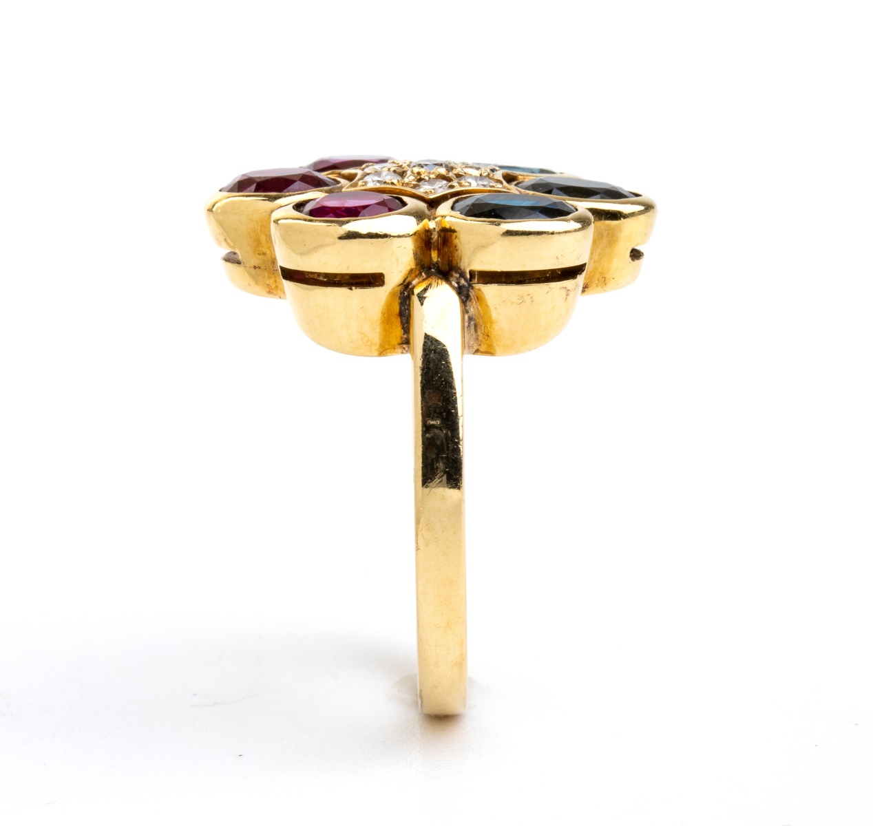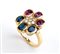 in oro giallo 18k, a forma di fiore, impreziosito da diamanti, rubini e zaffiri.