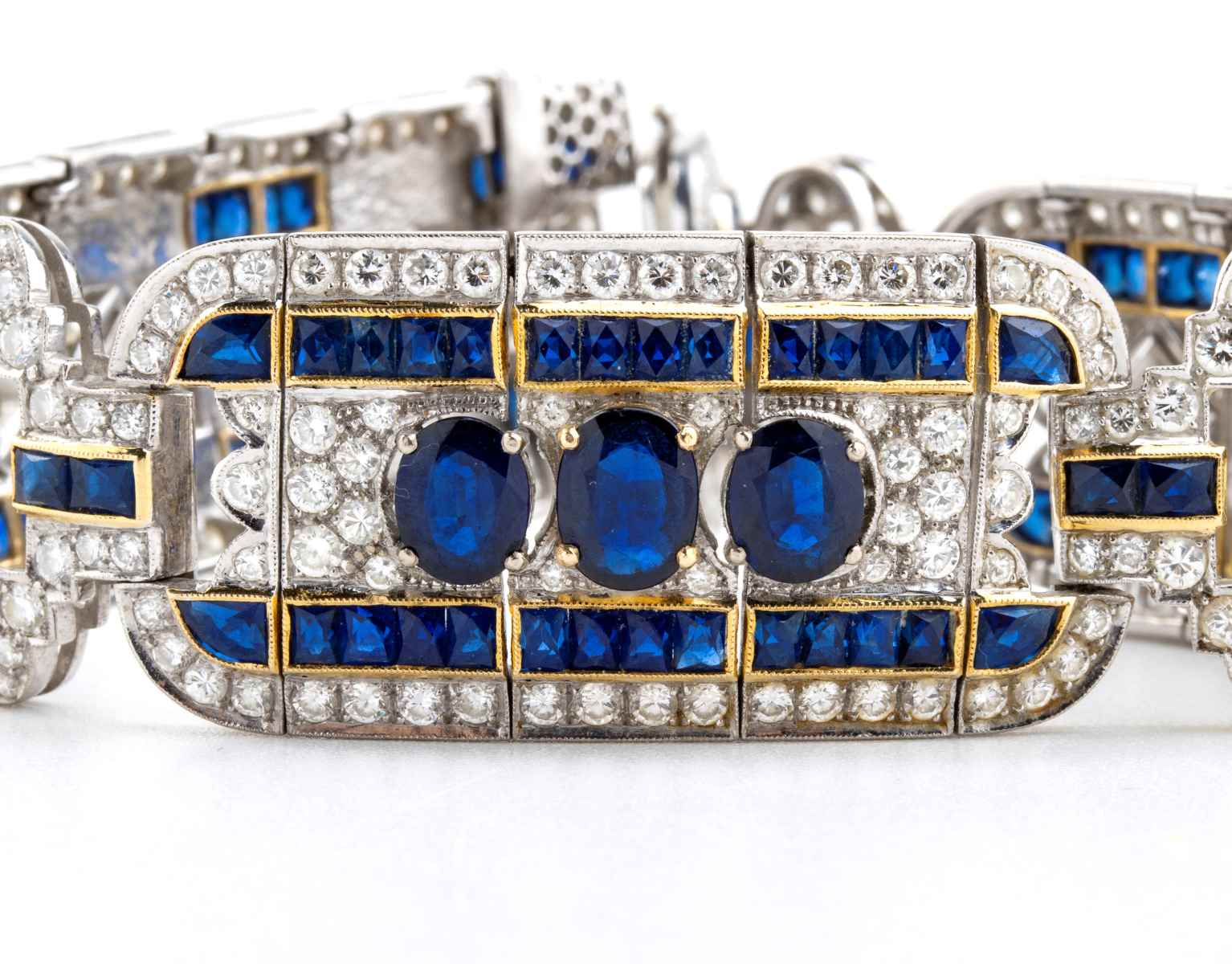 Bracciale in stile deco' in oro con zaffiri e diamanti in oro bianco 18k, di...
