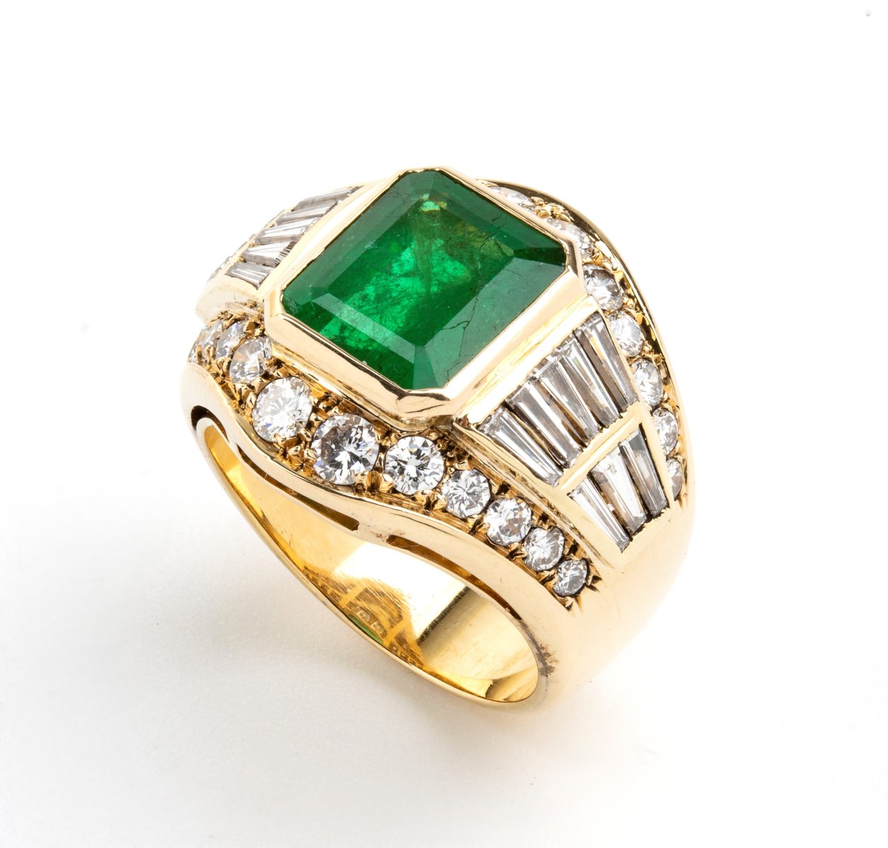 modellato come una fascia, incastonato con smeraldo affiancato da diamanti taglio tapered e contornato da brillanti.