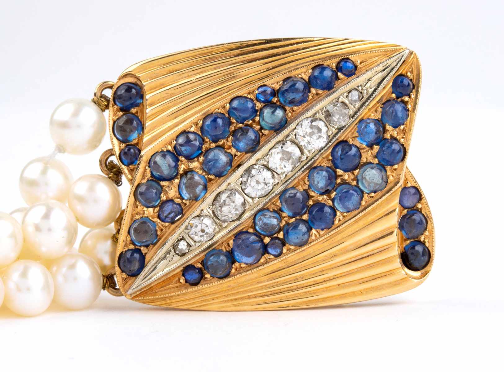 bracciale a 4 fili di perle coltivate d'acqua salata, fermezza in oro giallo 18k impreziosita da cabochon di zaffiri e diamanti