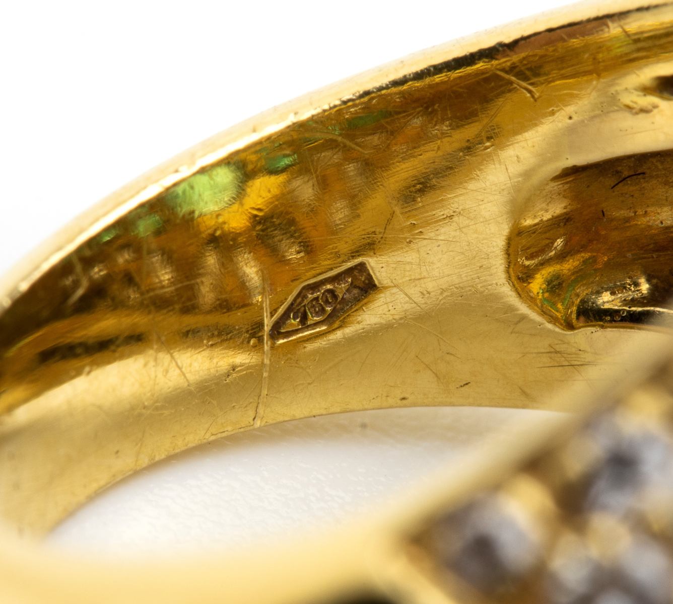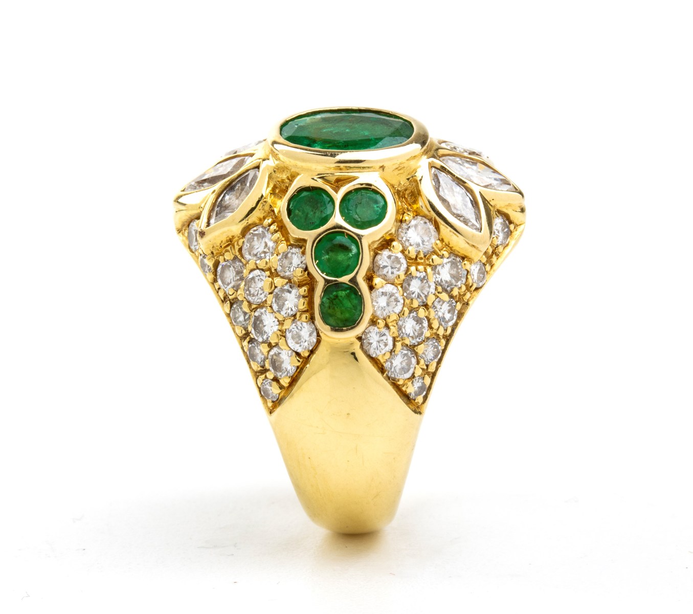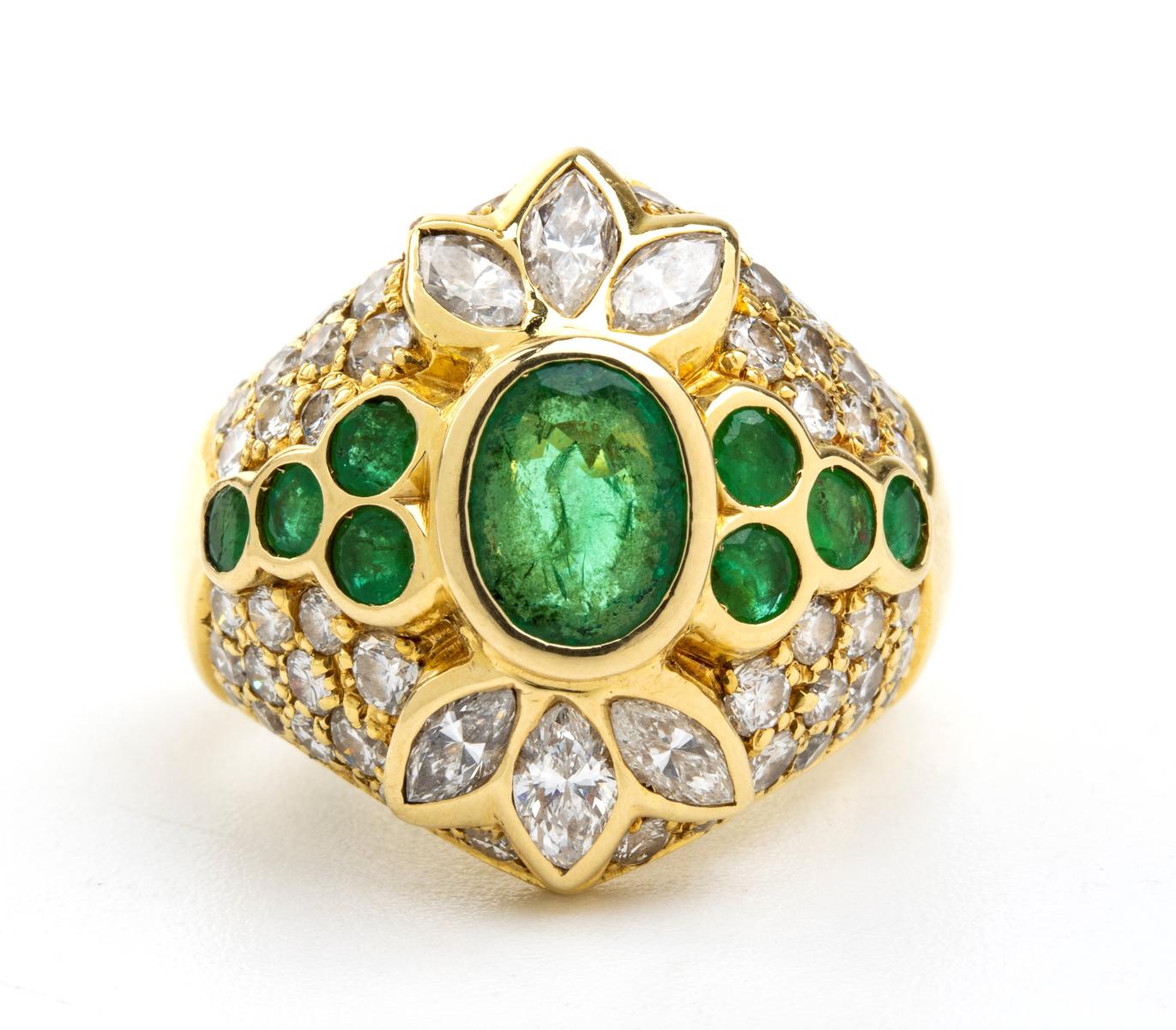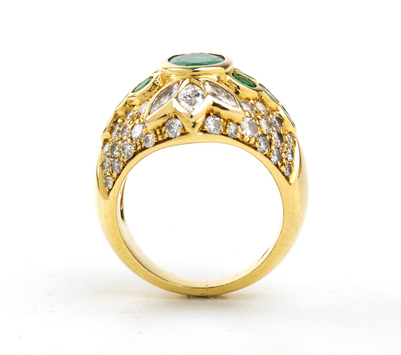 Anello in oro con smeraldi e diamanti modellato come una fascia in oro giallo...