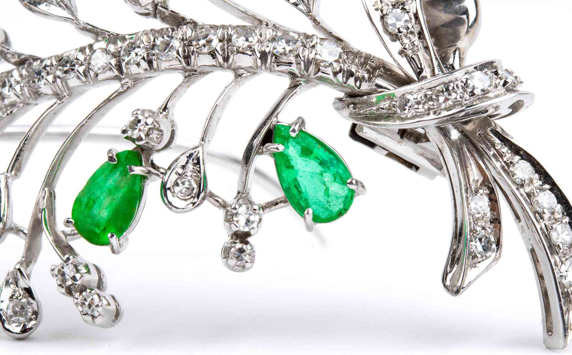 in oro bianco 18k, a motivi di ramo, con foglie e nastri impreziositi da smeraldi e diamanti.