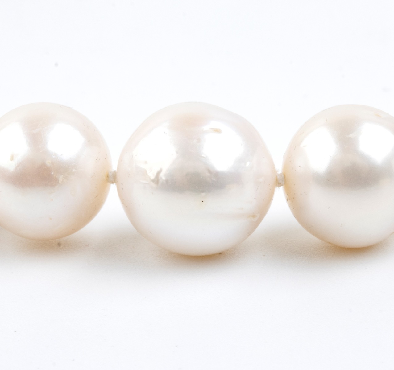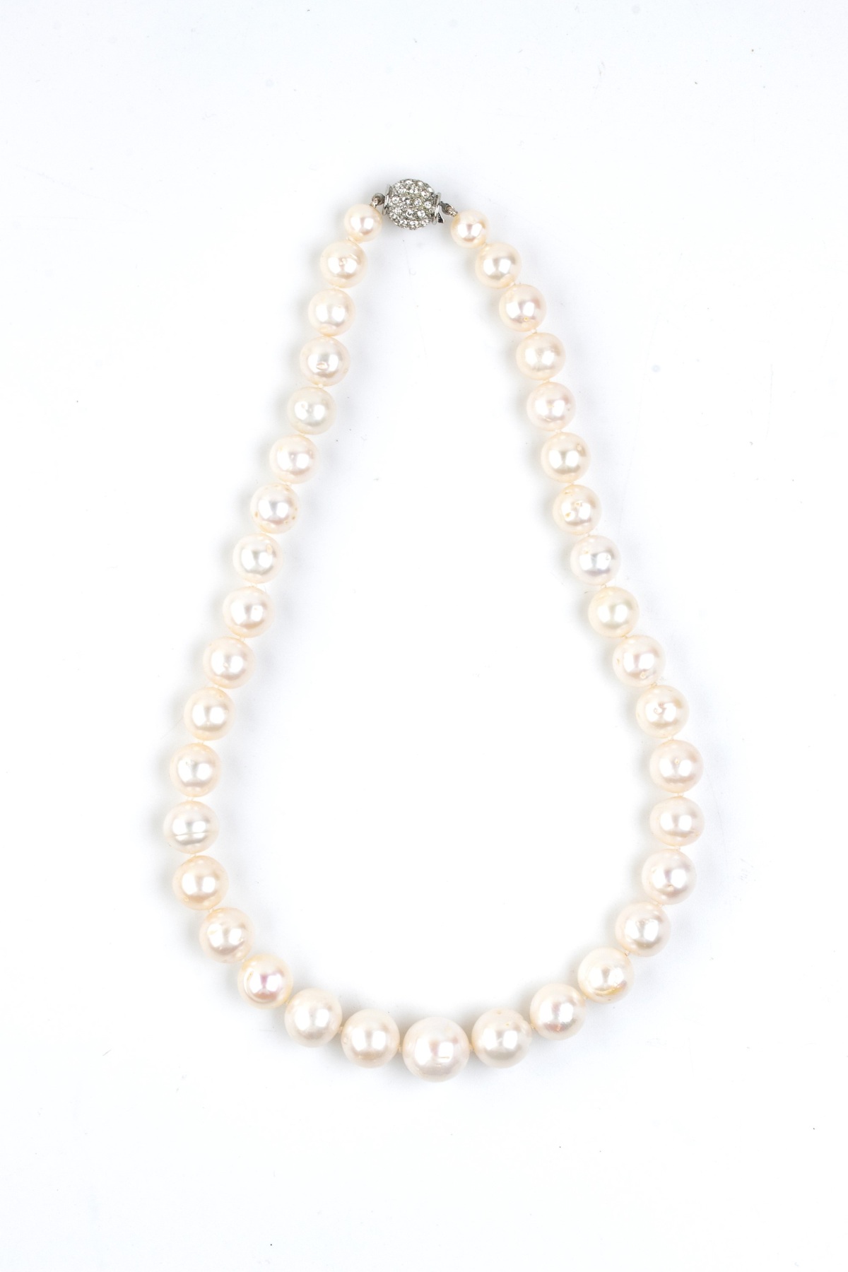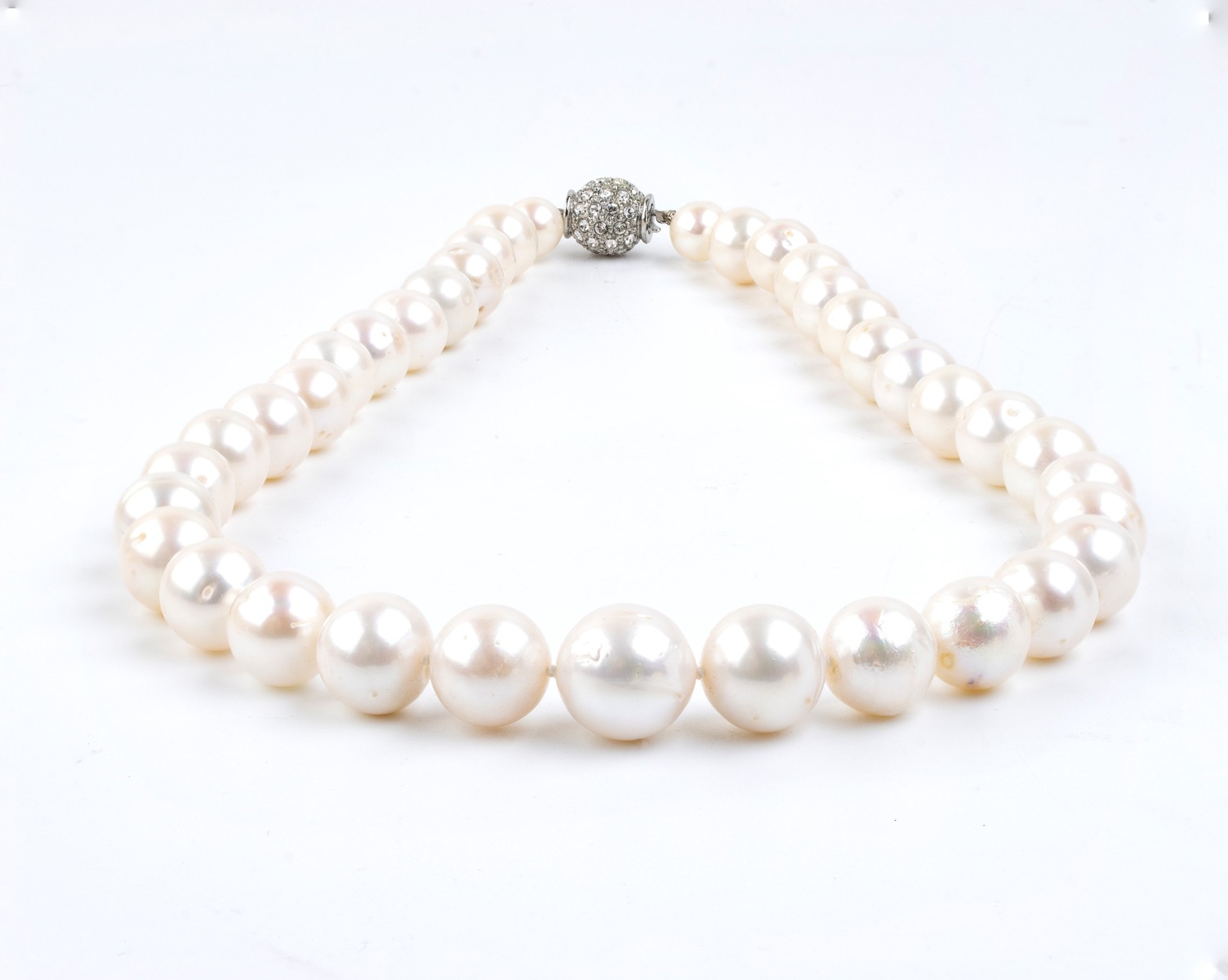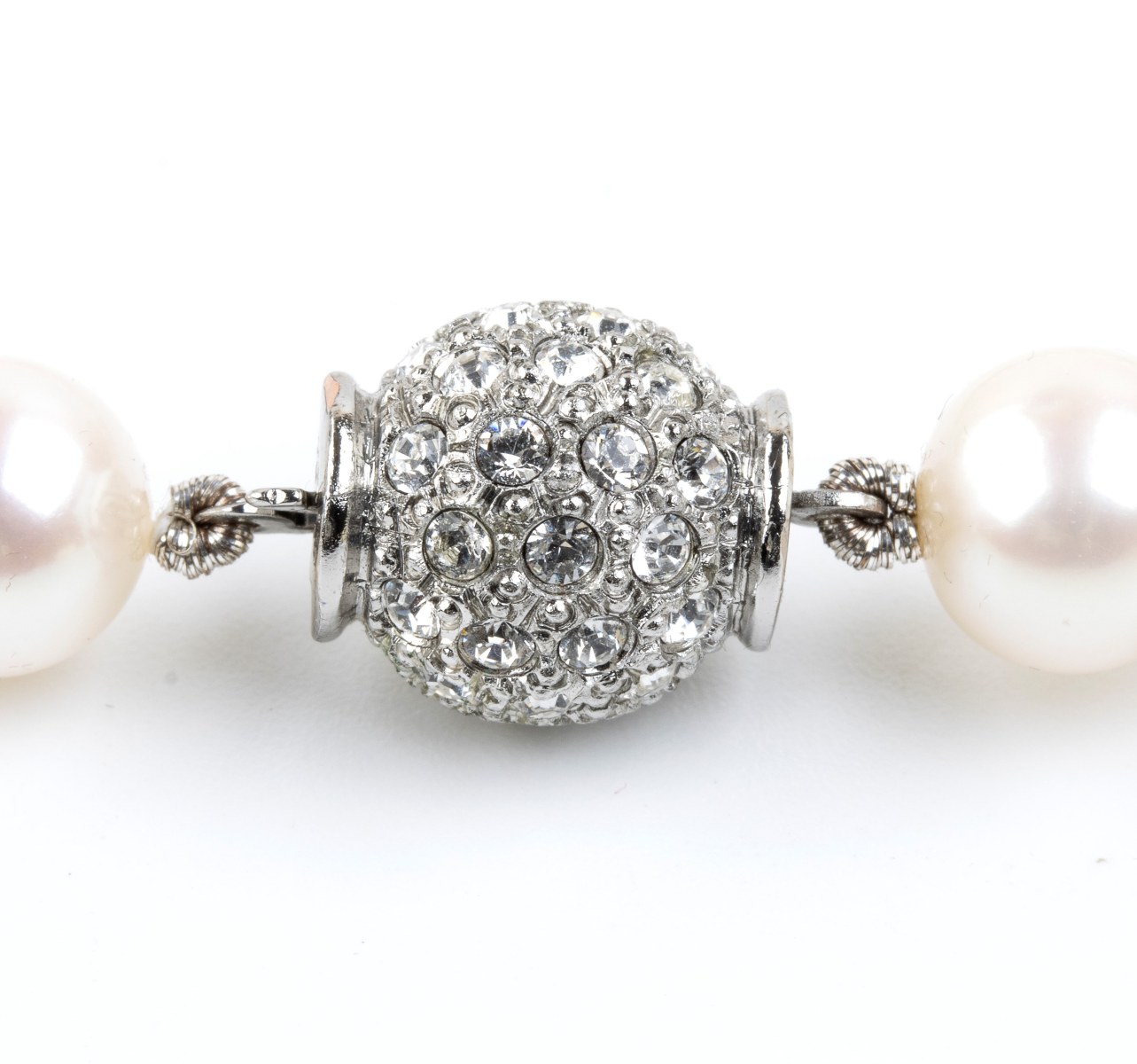 ad un filo di perle coltivate d'acqua salata, fermezza a scomparsa in oro bianco a basso titolo decorata con paste vitree.