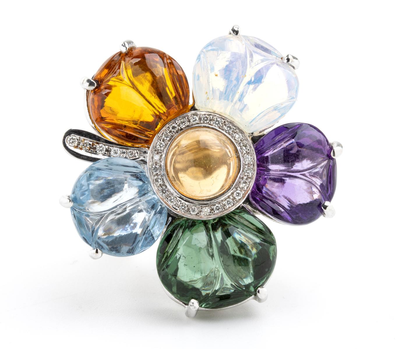 in oro bianco 18k, a forma di fiore con petali in paste vitree, dettagli in diamanti.