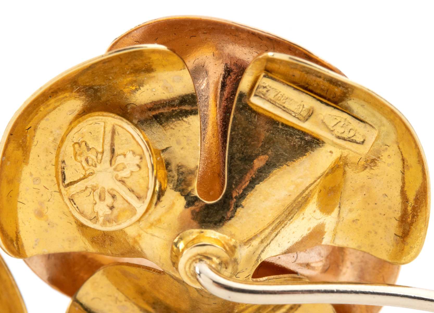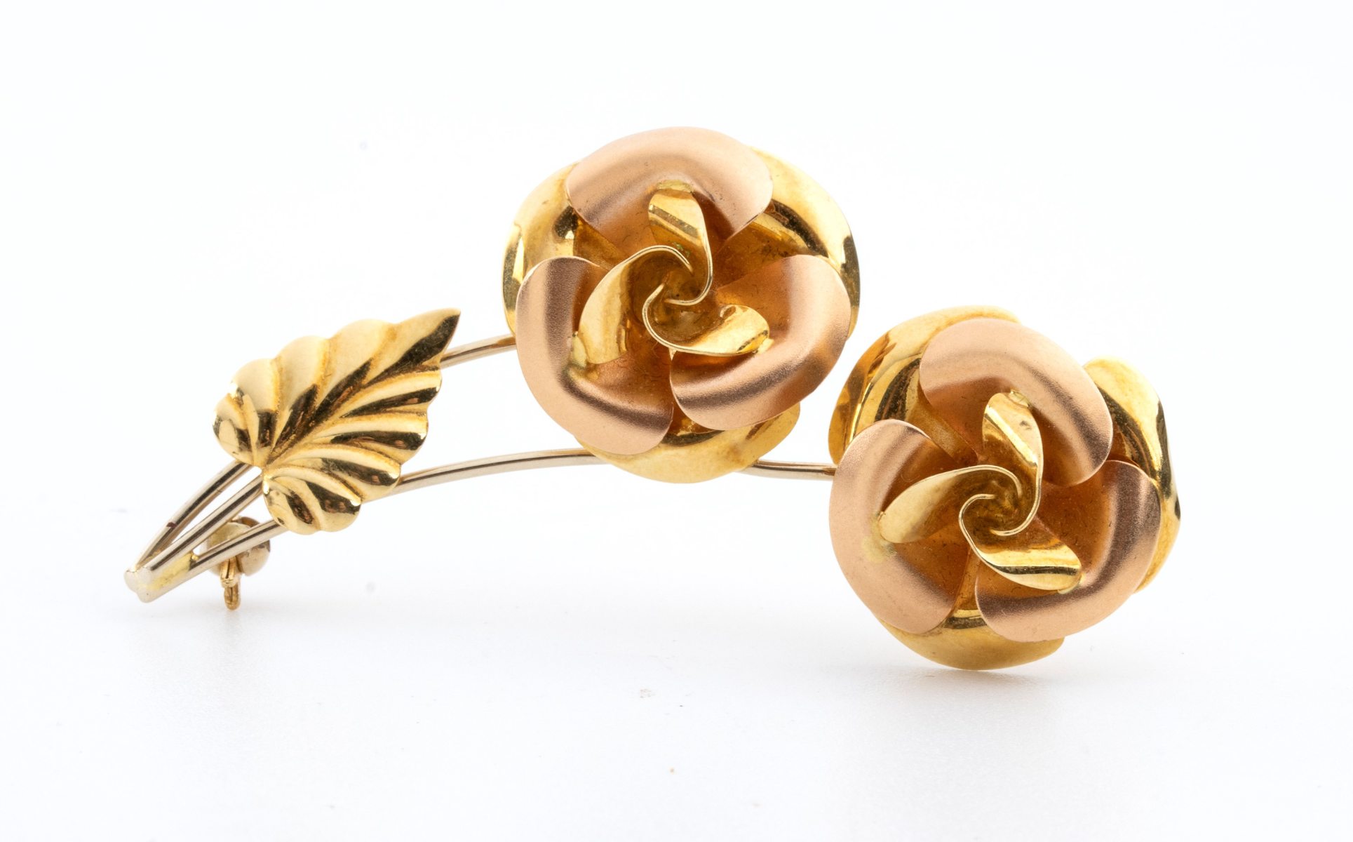 3) spilla a forma di due rose in oro bianco e oro rosa: dimensioni 6,2 x 3,3 cm. Punzonata "750 - 788 AR".