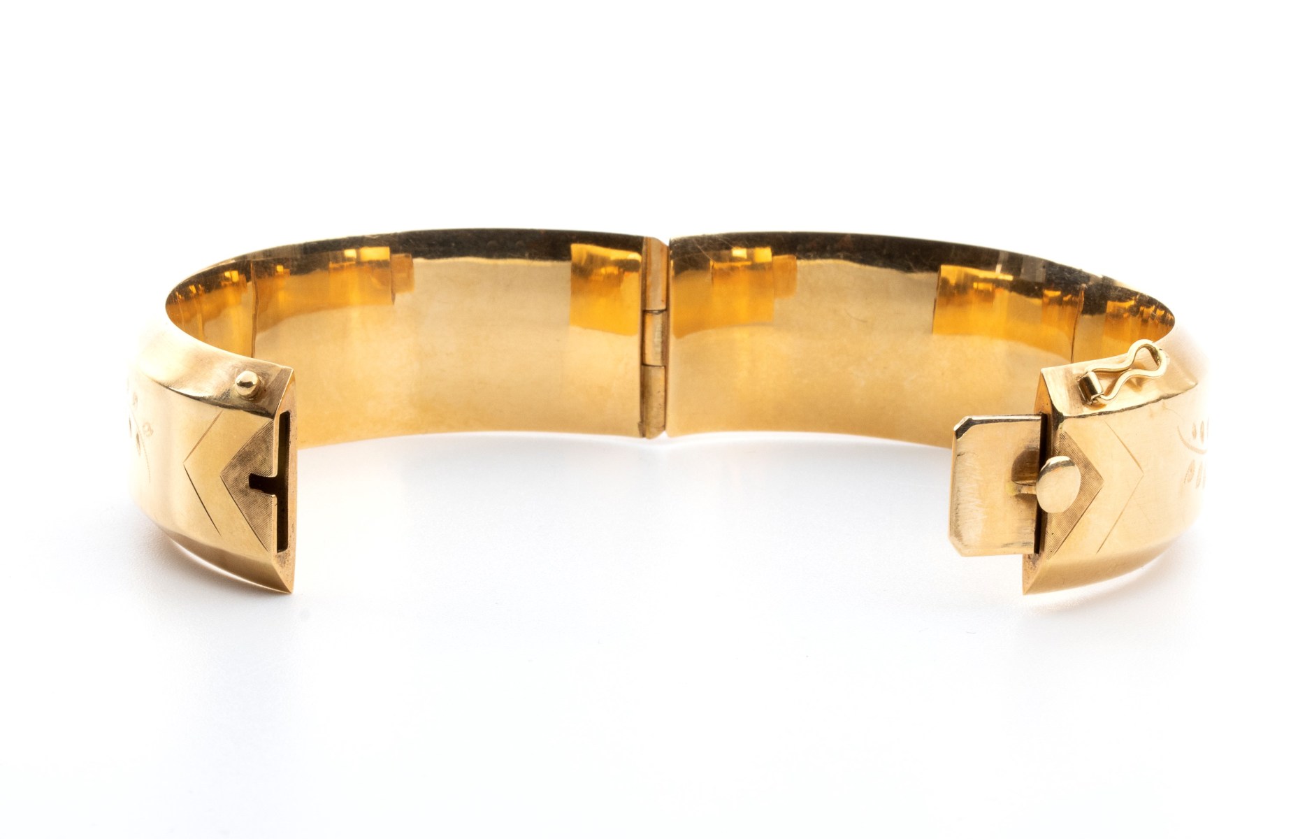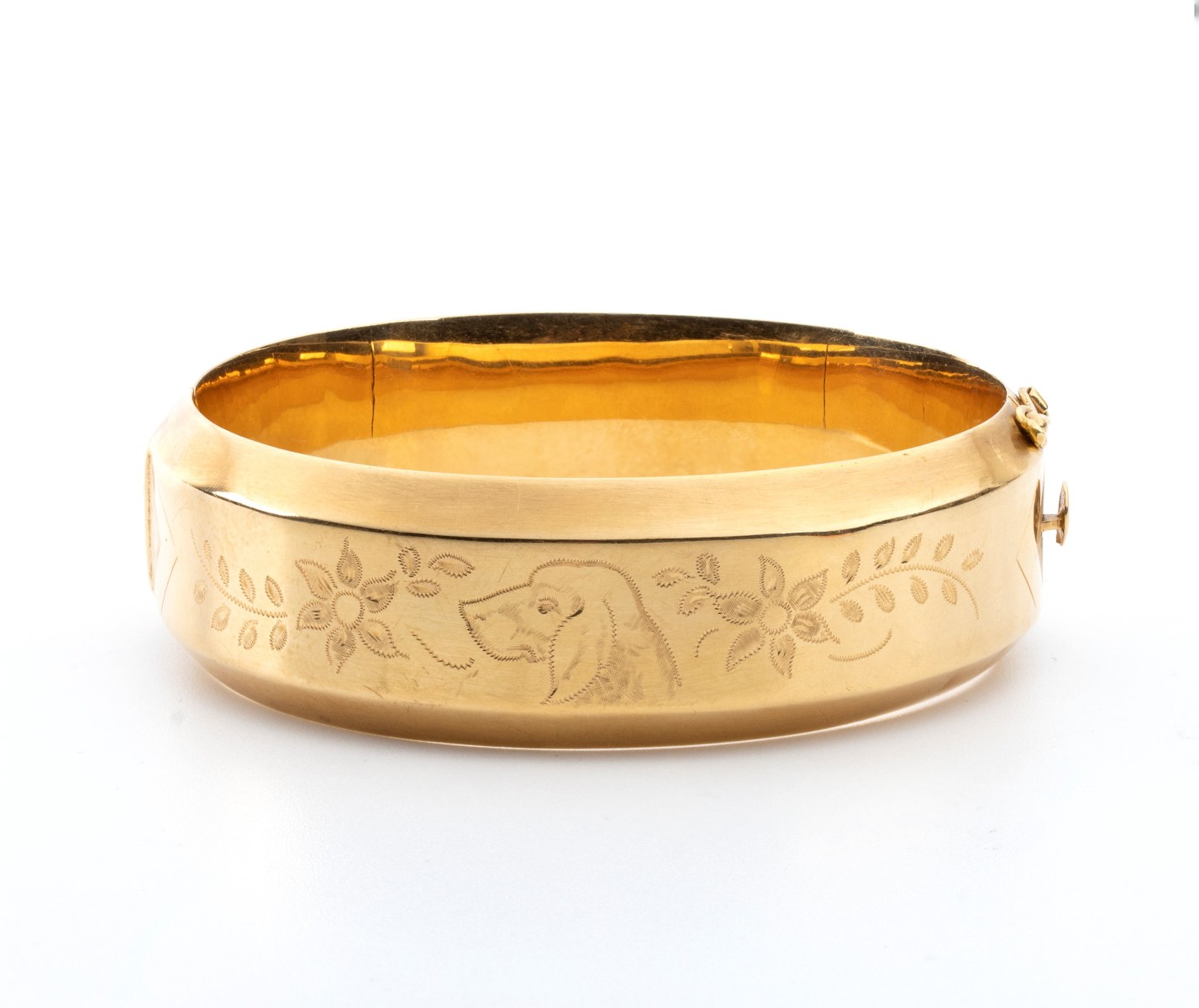 bracciale a fascia in oro giallo 18k con incisioni raffiguranti fiori, foglie, un cane ed un volatile. Chiusura a scomparsa con gancio di sicurezza.