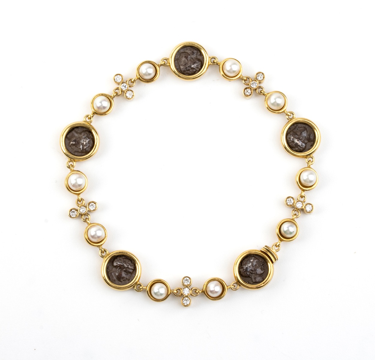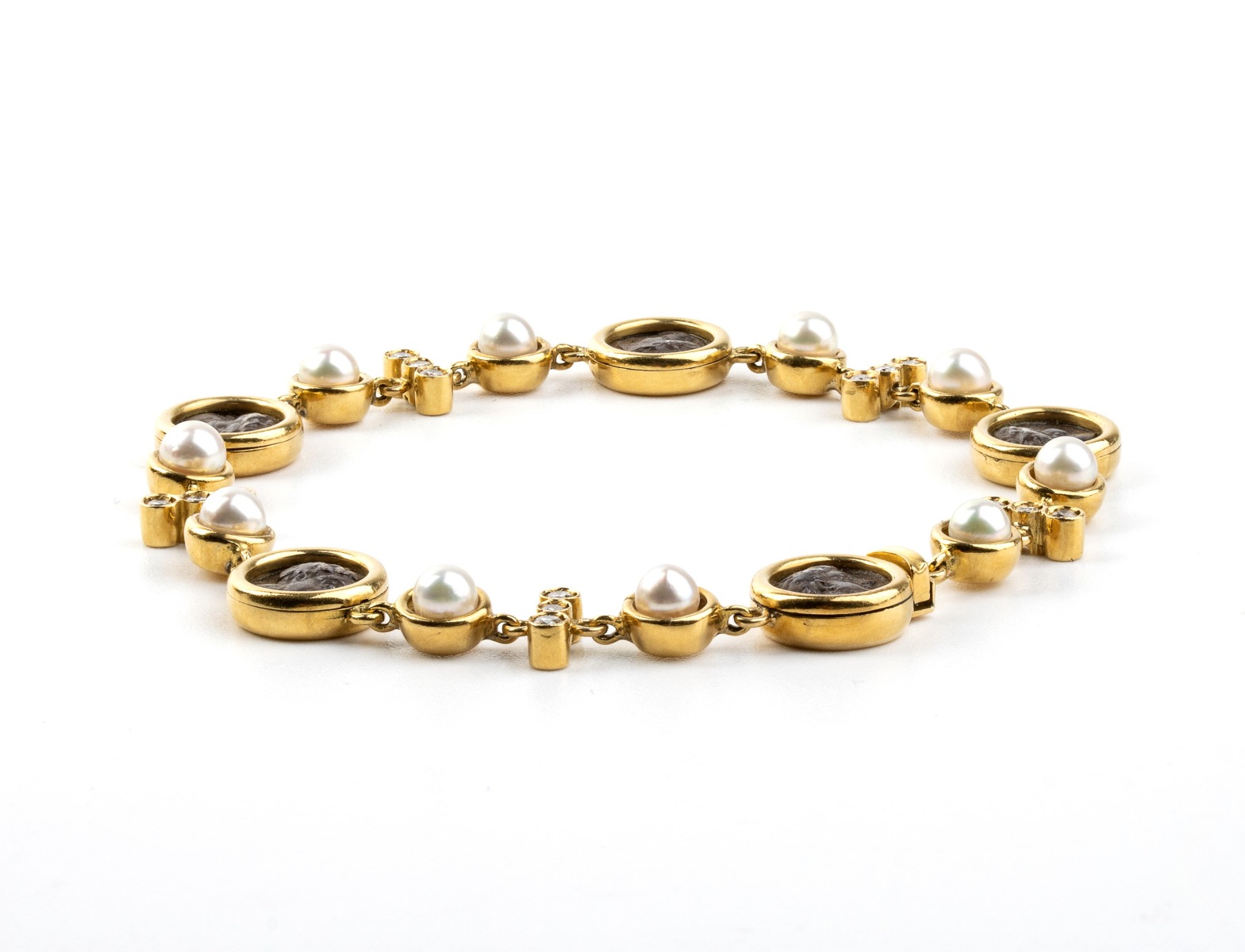 Bracciale in oro con perle, diamanti e monete montatura in stile archeologico...