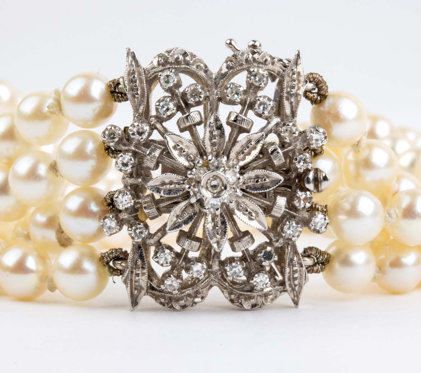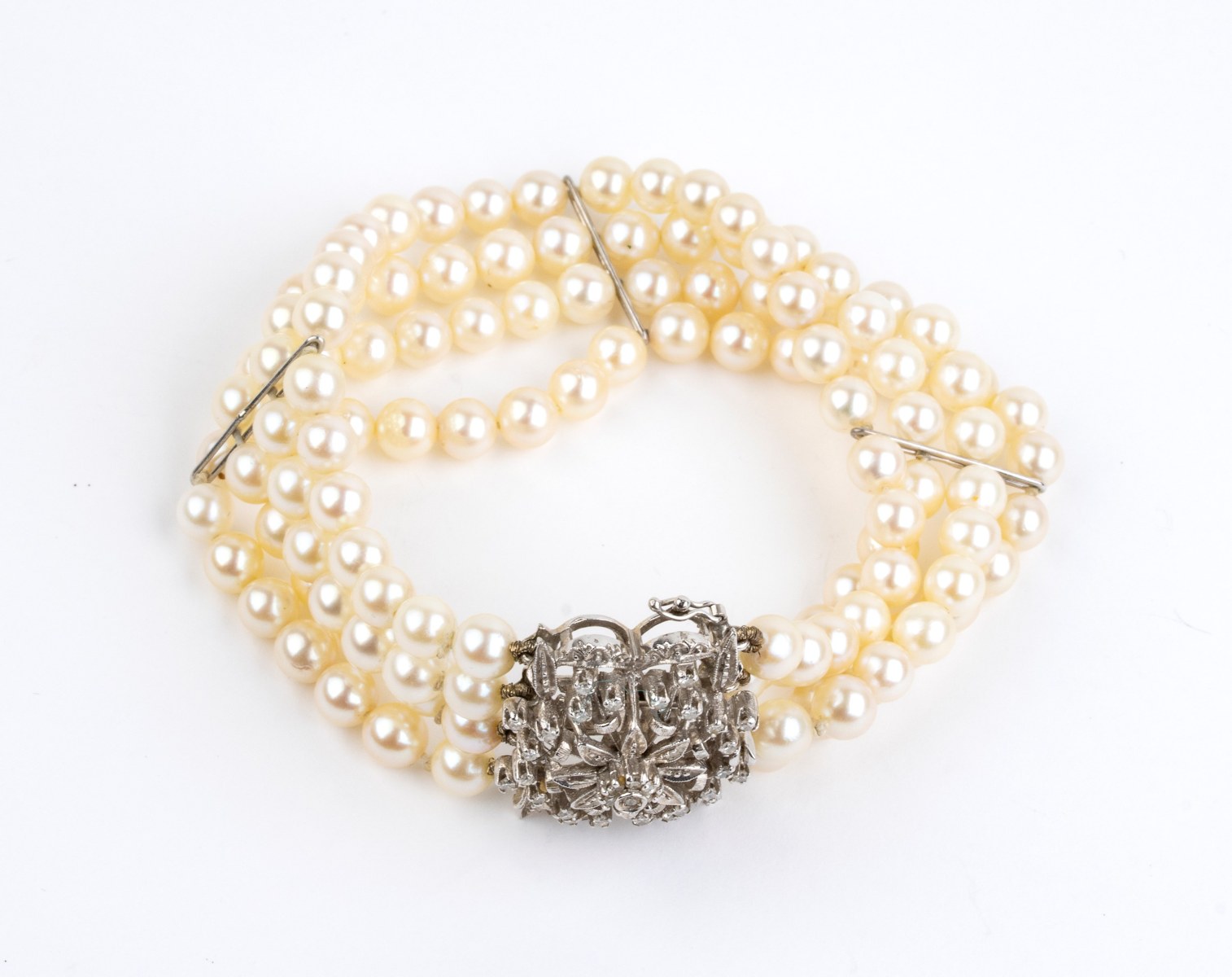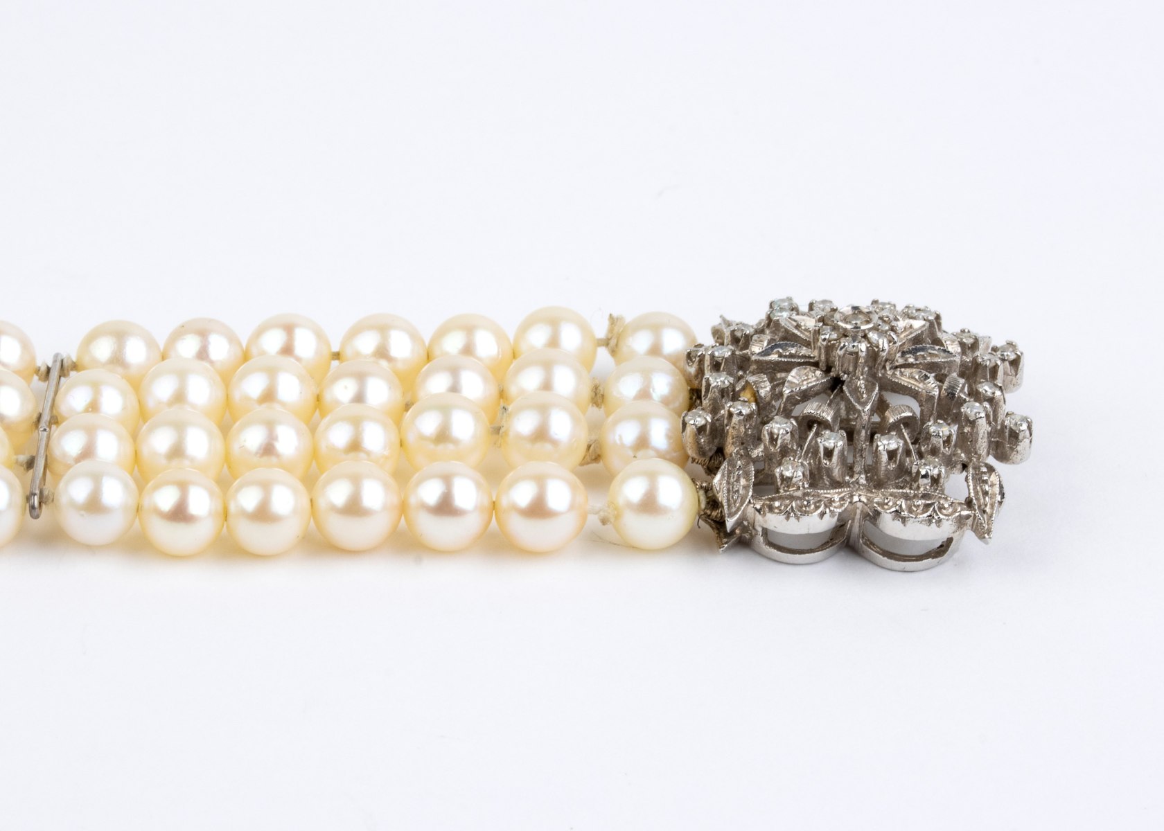 4 fili di perle coltivate d'acqua salata, diametro 5.5 - 6 mm, con fermezza impreziosita da diamanti.