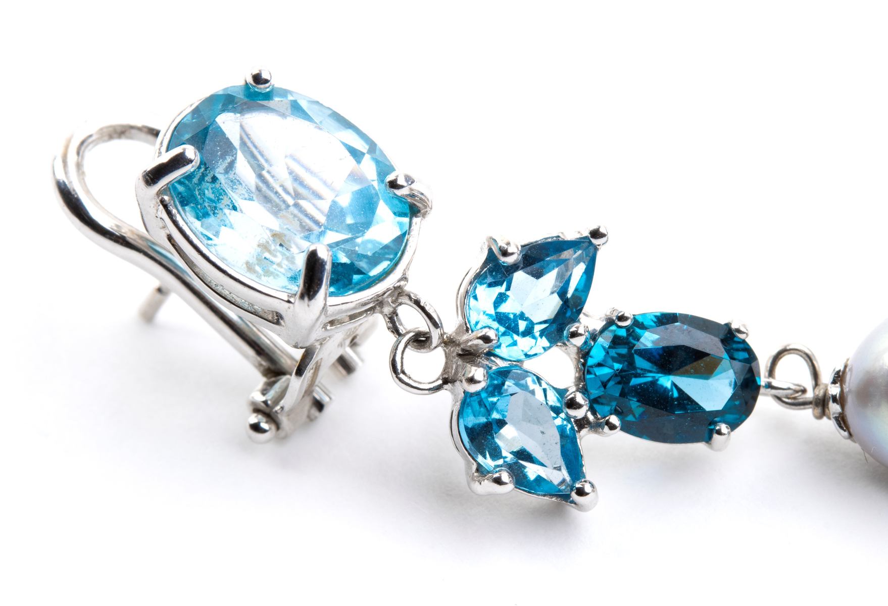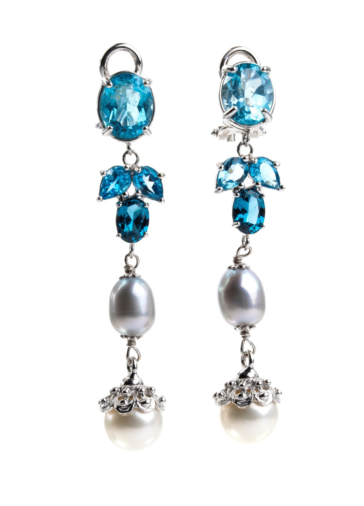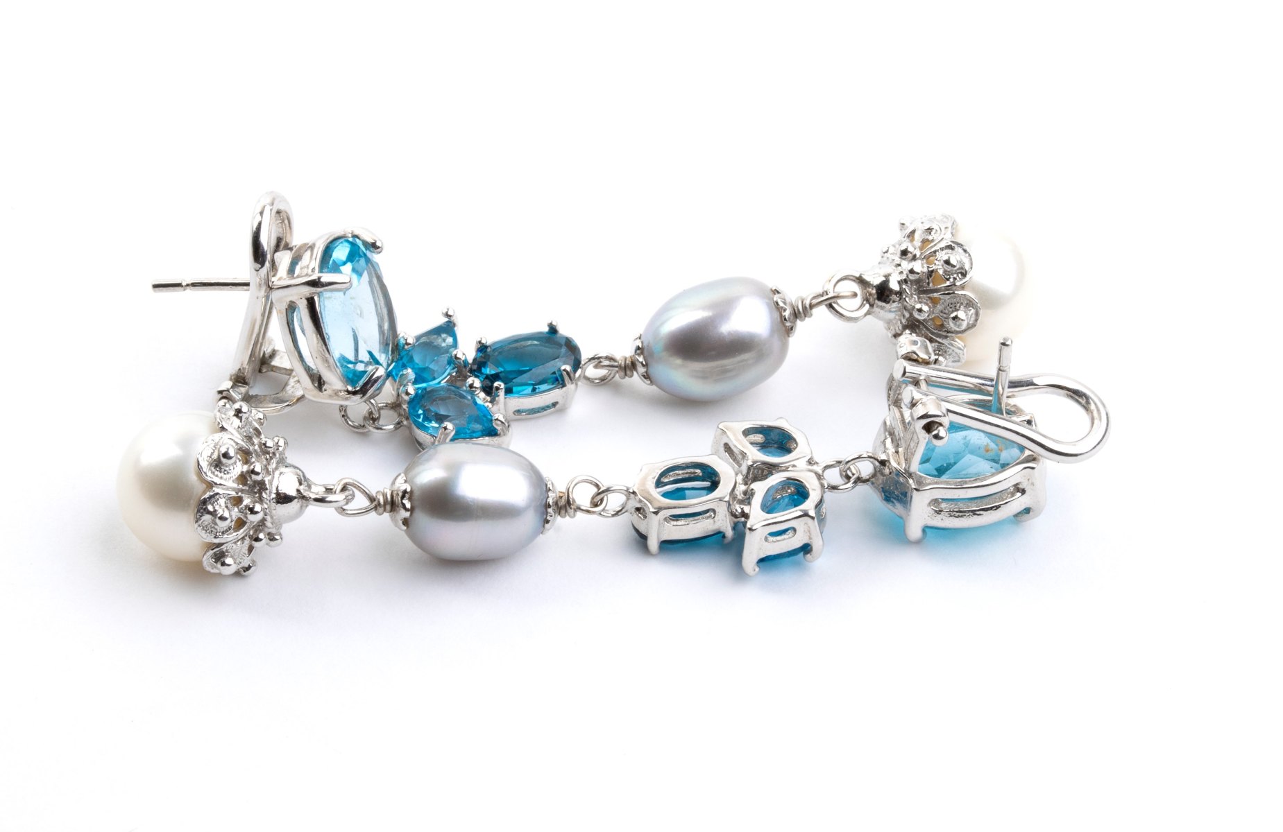 Orecchini pendenti in oro con perle e topazi azzurri in oro bianco 18k, con...