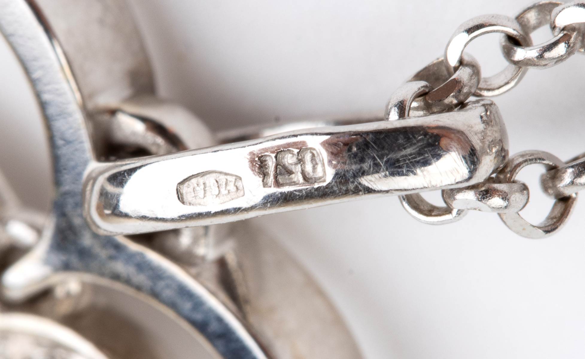 Pendente punzonato "750 - 256 AL"; catena punzonata "750 - 604 AR". Dimensioni pendente 2,3 x 1,7 cm. Lunghezza catena 44,5 cm. Peso complessivo 6,8 gr.