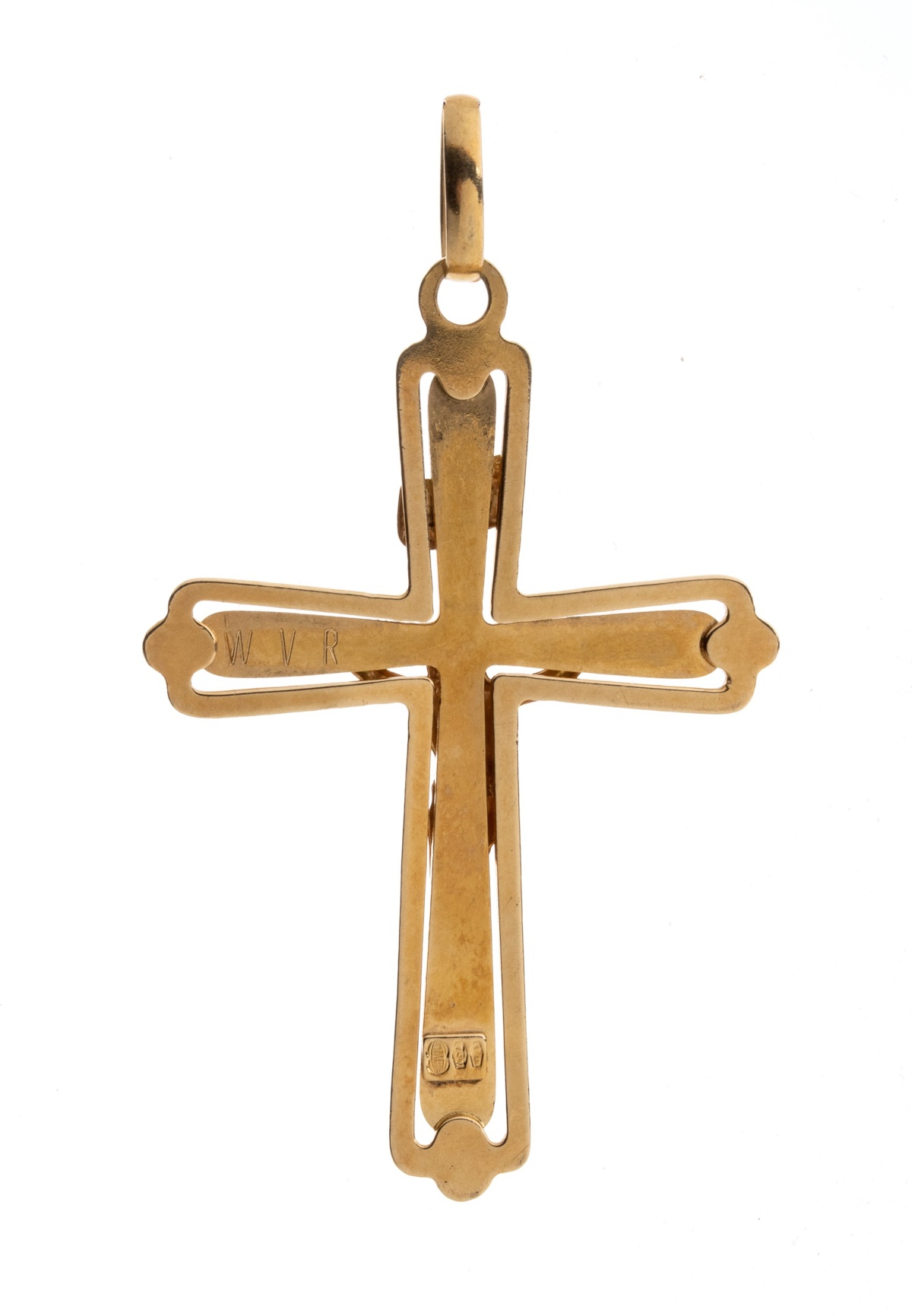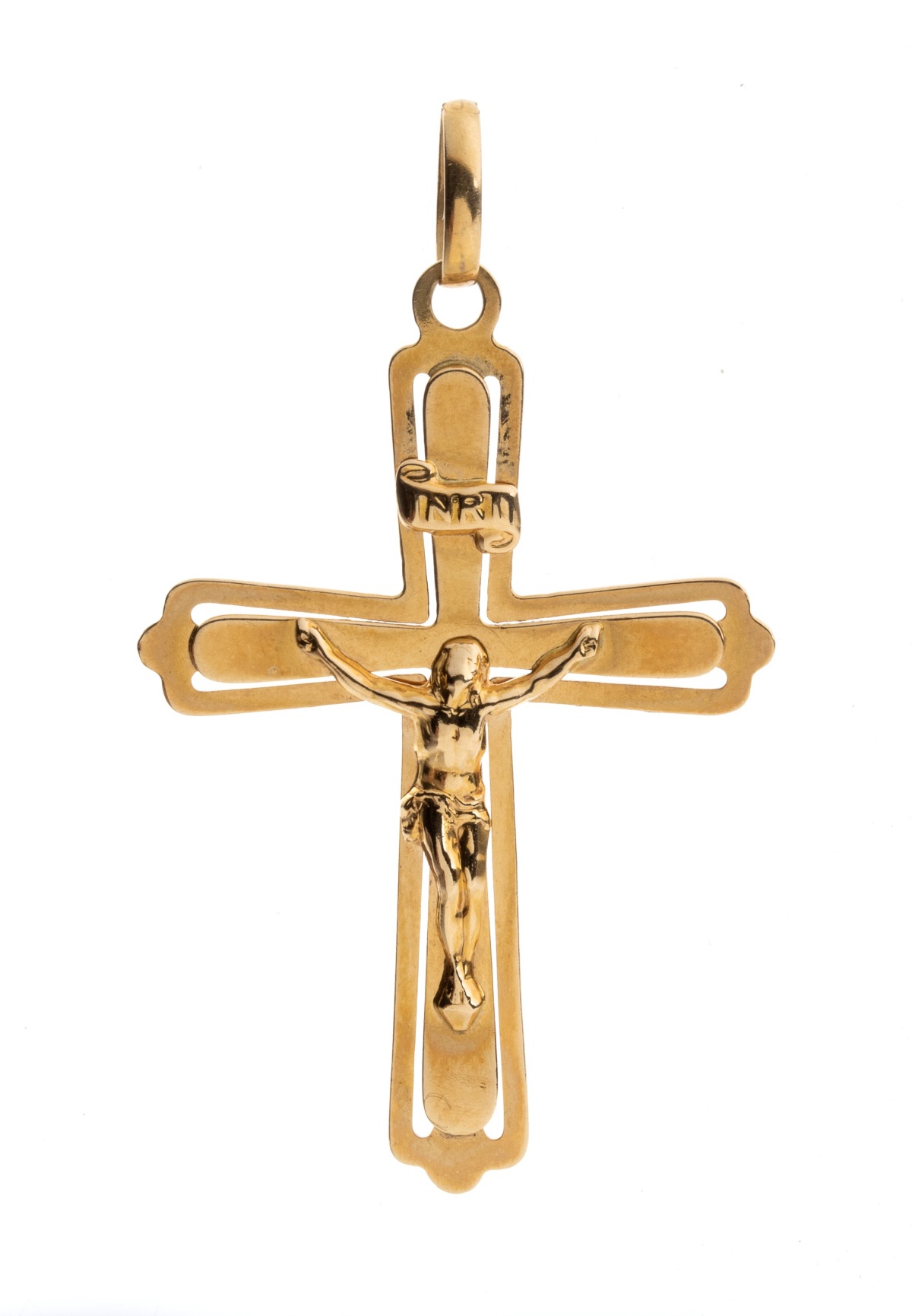 montatura in oro giallo 18k raffigurante Cristo crocifisso in una croce latina, con il cartiglio dell'iscrizione I.N.R.I. (Iesus Nazarenus Rex Iudaeorum, Gesù Nazareno Re dei Giudei) in alto.
