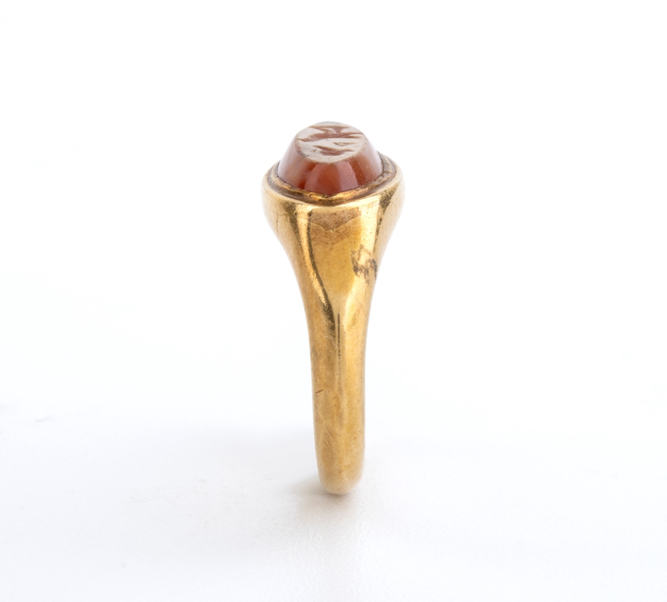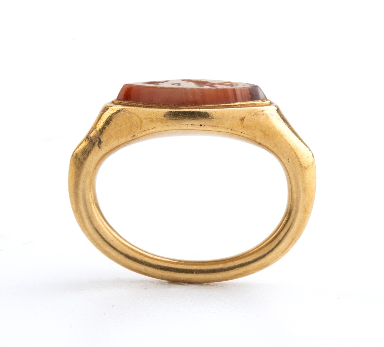 Anello stile archeologico in oro incastonato con agata intaglio in corniola...