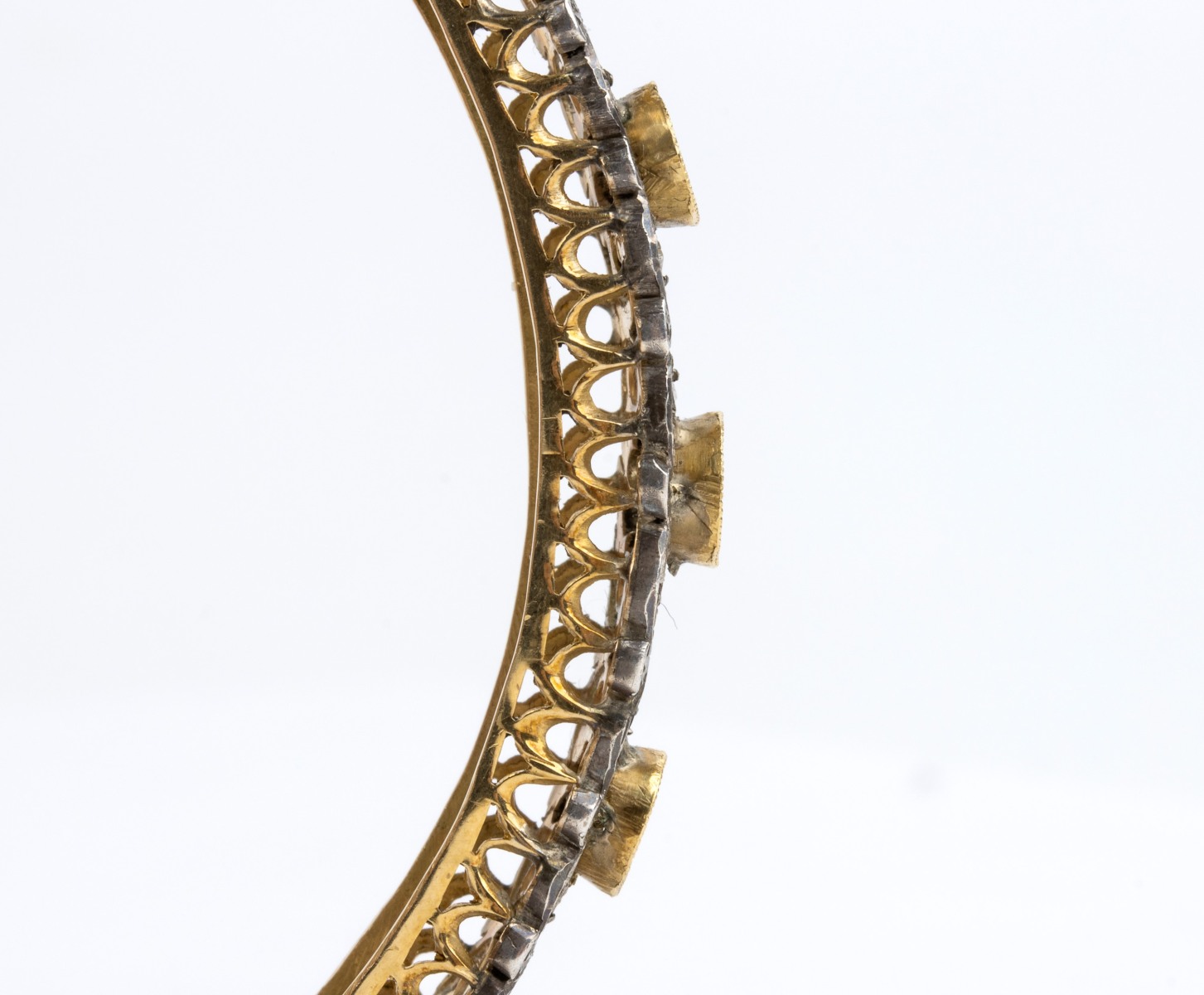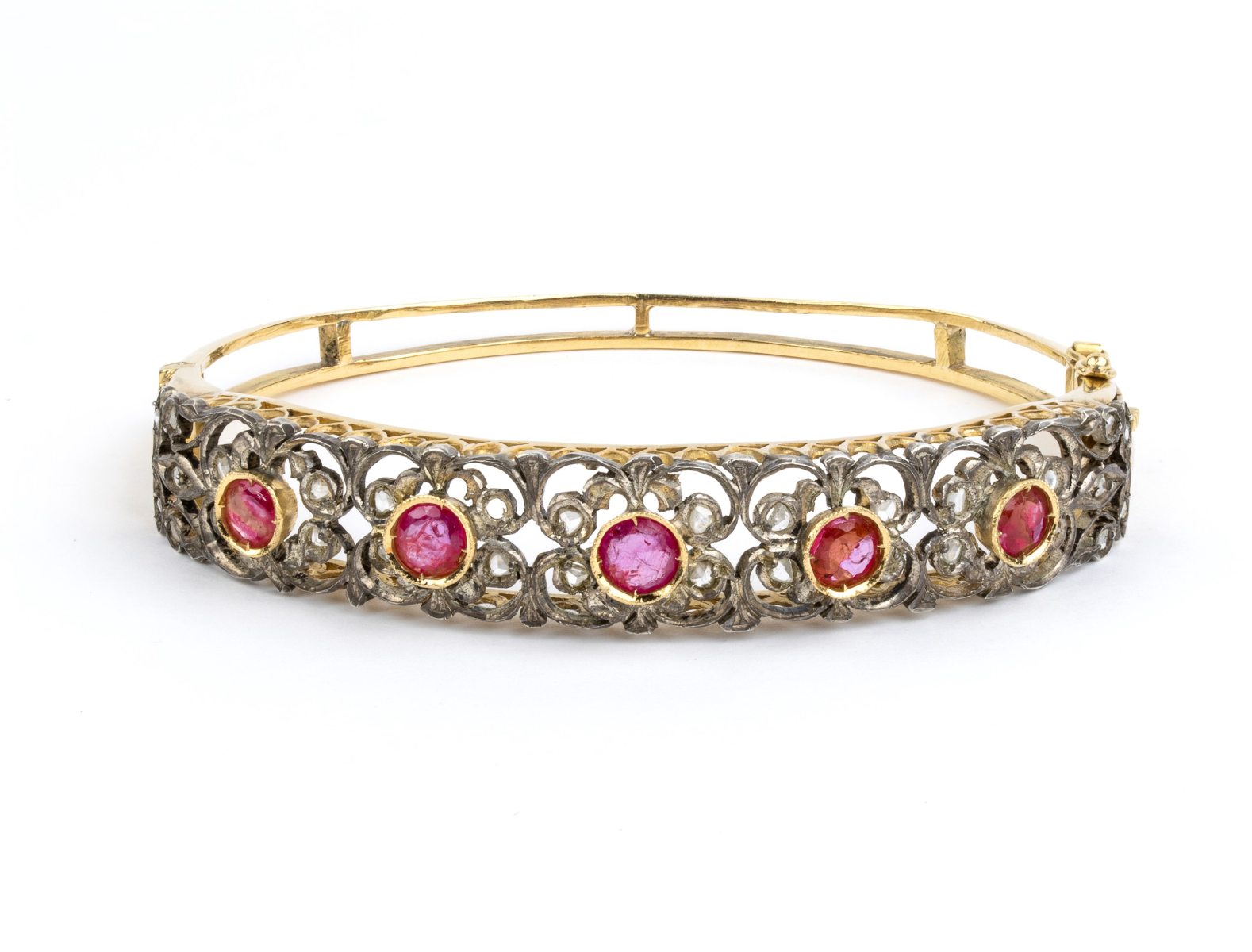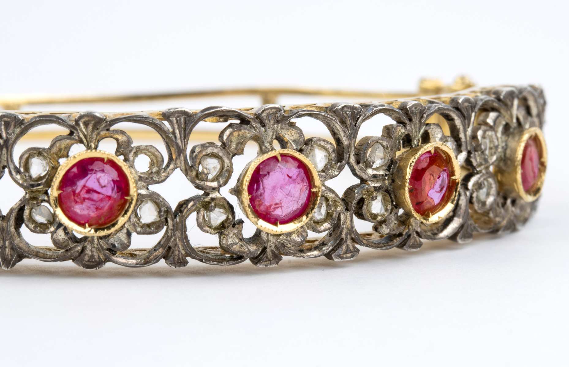 Bracciale a cerchio rigido in oro ed argento, con rubini e diamanti Inizio XX secolo