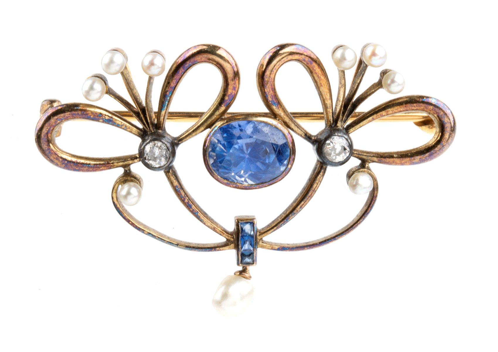 Spilla in oro con perle, diamanti e zaffiri Inizio XX secolo