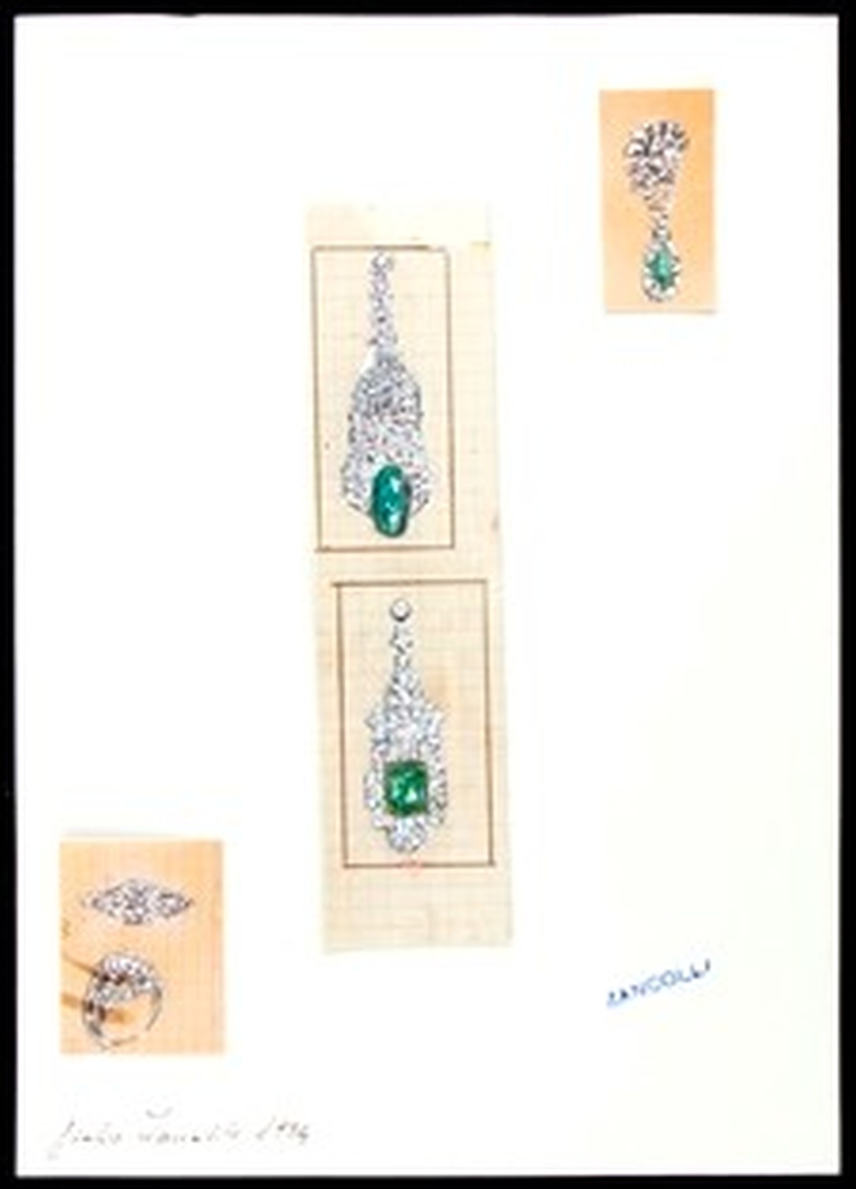 Progetto per orecchini ed anello, GIULIO ZANCOLLA Anni '40 disegni di tre...